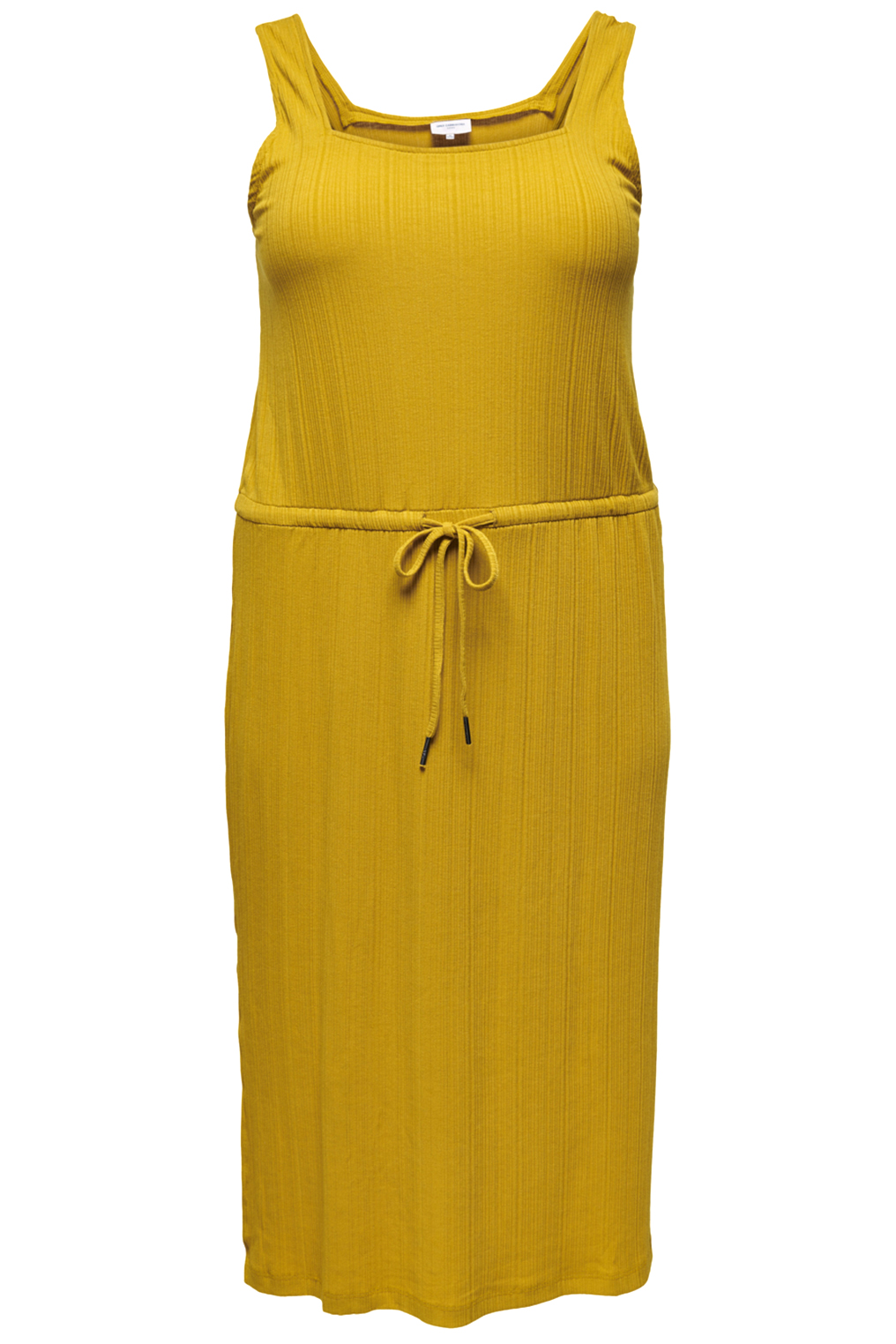 Tricot jurk  met 4 kante hals in een rib tricot. In de taille zit elastiek met een aantrekkoord. De jurk heeft een aangesloten pasvorm. Aan de onder zijkant zitten korte splitten van 29 cm.