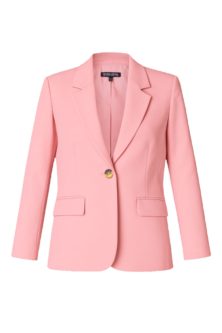 Deze blazer in zachtroze straalt elegantie en verfijning uit. De licht gevoerde schouders en subtiele steekzakken geven structuur en een verzorgde uitstraling, terwijl de strakke, tijdloze snit een verfijnde touch toevoegt aan elke outfit. Perfect voor zowel chique als casual combinaties.