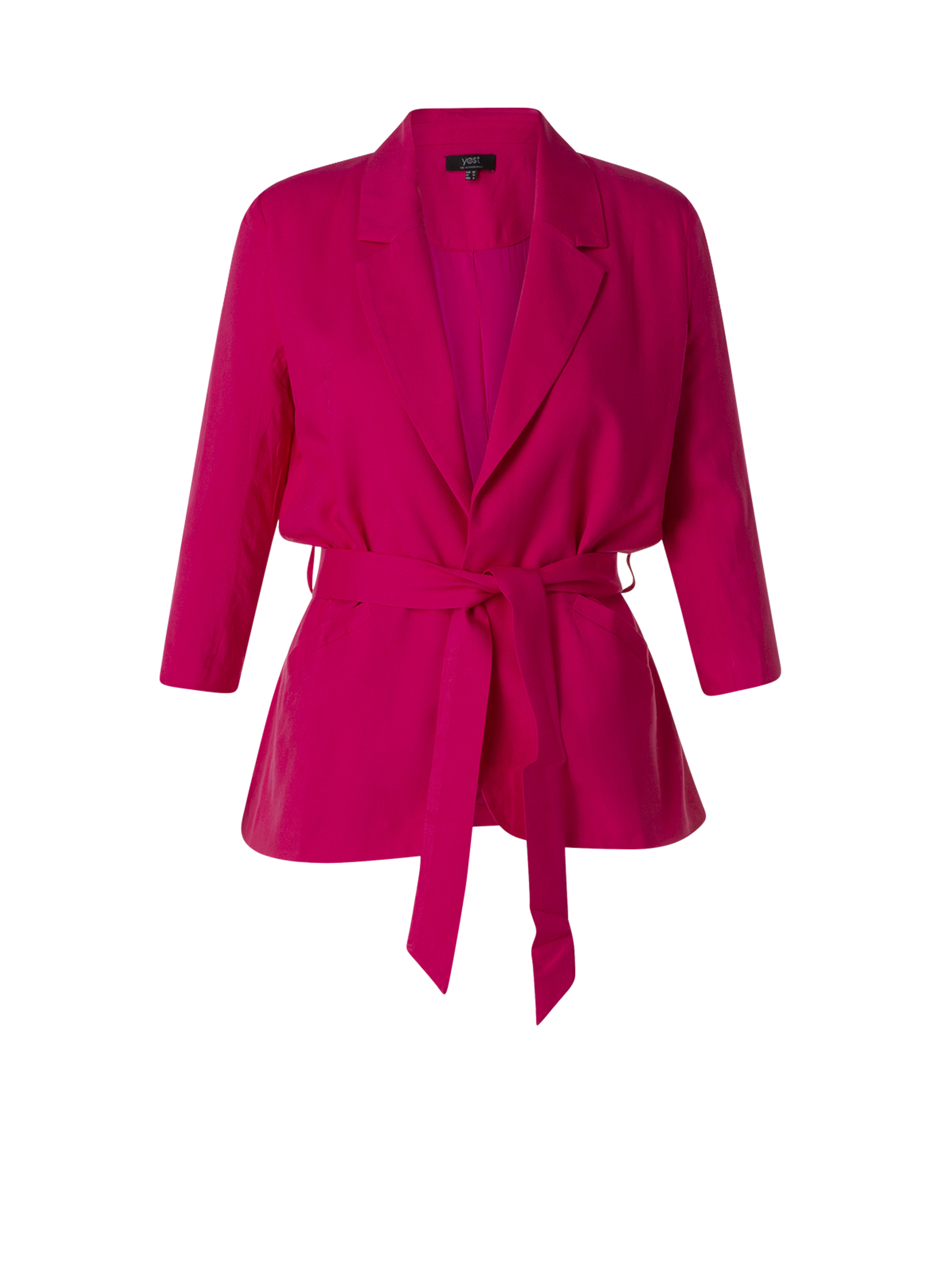 Geklede blazer met strikceintuur is van Yest, model Imala. Het is een ongevoerd model met 7/8 mouwen.