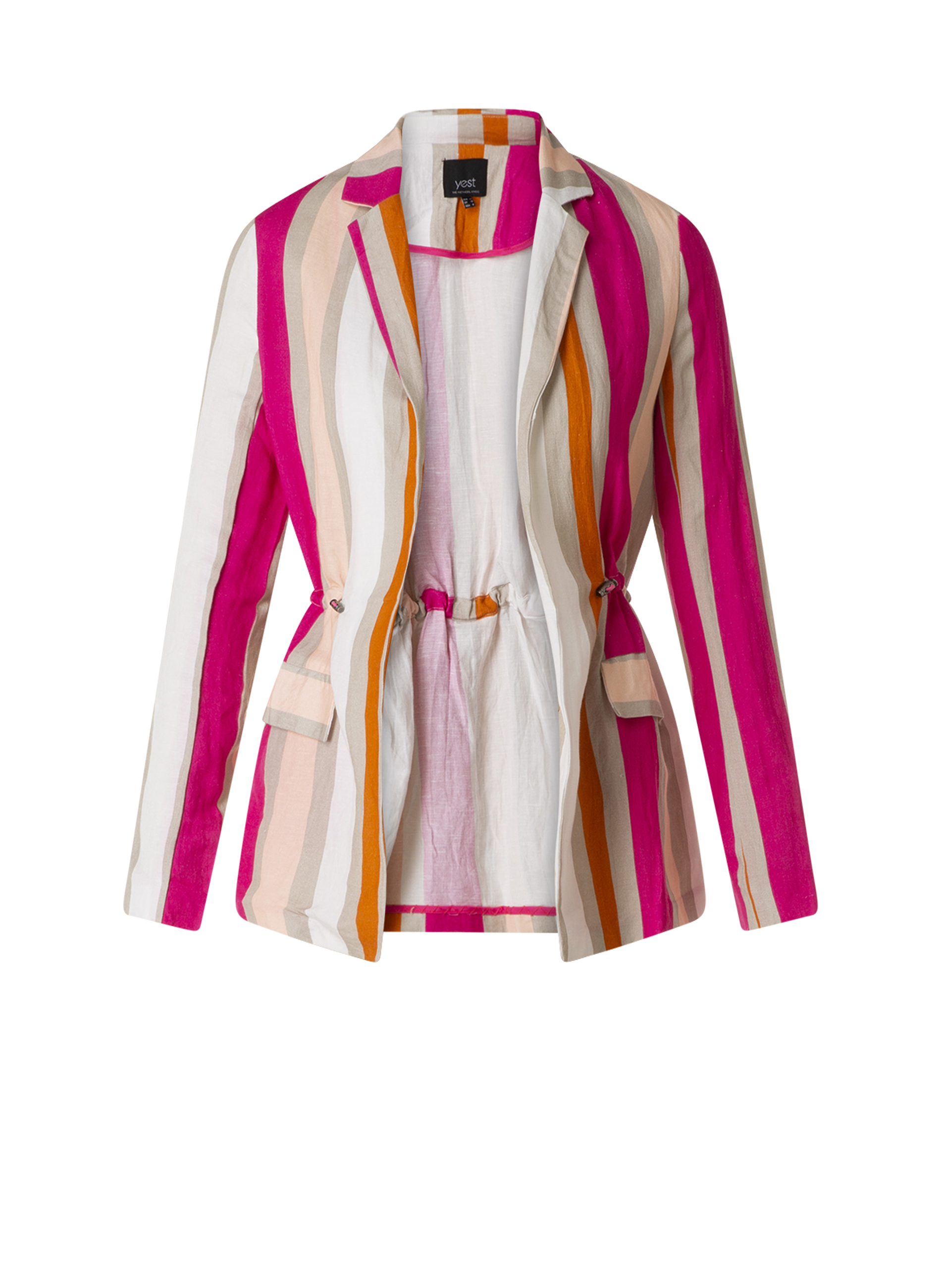 Blazer van Yesta gemaakt in een verticale streep  in leuk felle kleuren. De blazer heeft een tunnel in de taille met elastiek die je aan kunt trekken. Dit valt open, heeft geen sluiting en aan de voorzijde 2 klepzakjes. De stof is een mix van linnen en viscose. Dit model in ongevoerd.