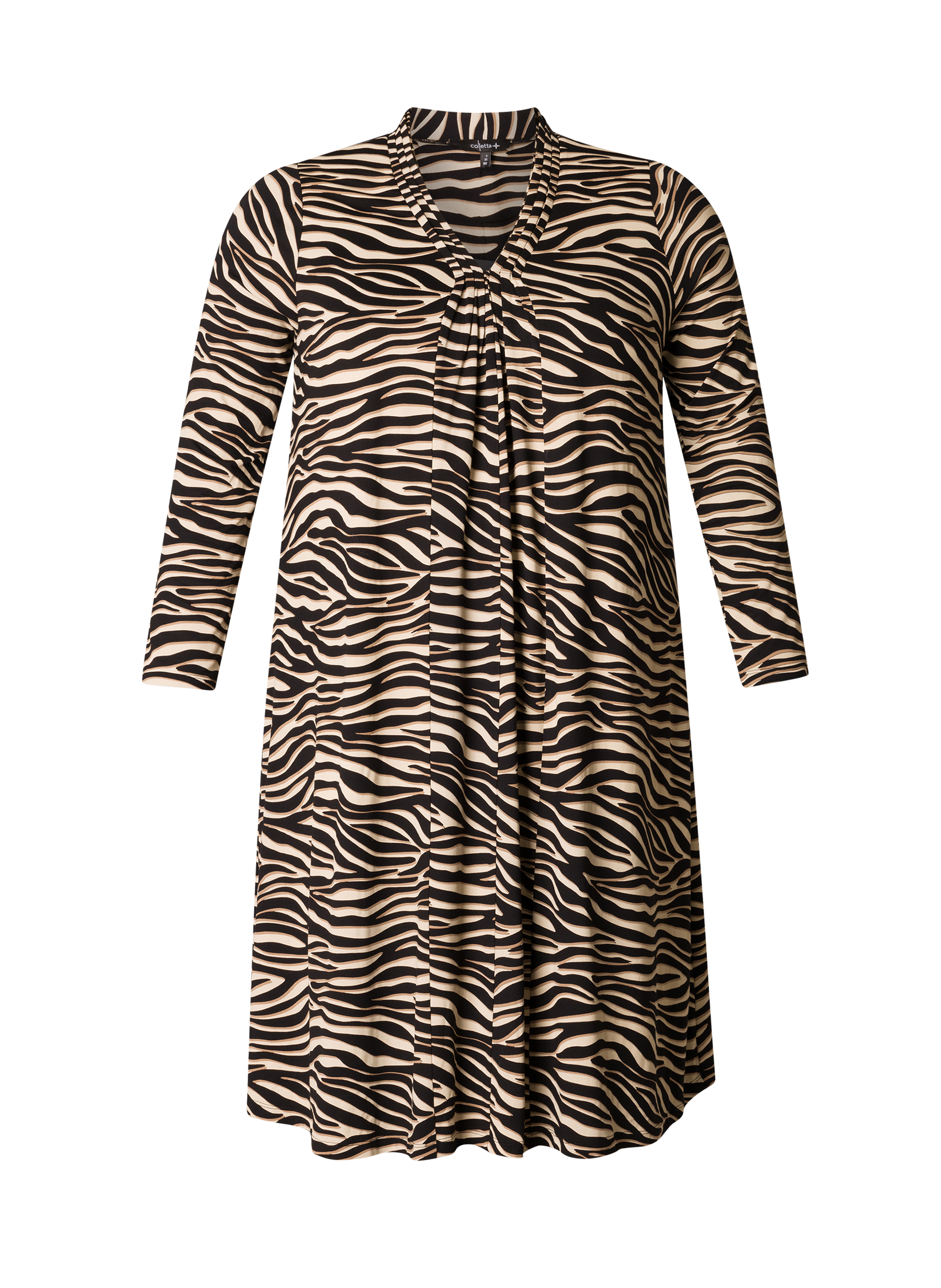 Deze soepelvallende jurk in een beige-zwarte animal print biedt de perfecte combinatie van comfort en stijl. De V-hals met plooitjes voegt een elegant detail toe, terwijl de A-lijn pasvorm een flatterende, vrouwelijke vorm creëert. Gemaakt van een zachte viscosemix (94% viscose, 6% elastaan), is dit een jurk die je keer op keer wilt dragen. Lengte: 110 cm. Ideaal voor zowel dagelijks gebruik als bijzondere gelegenheden.