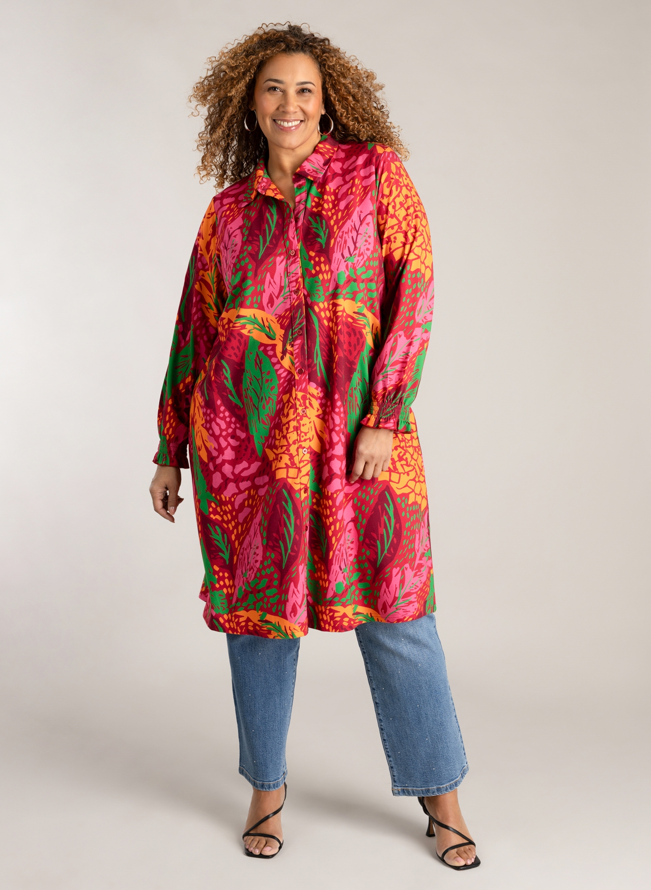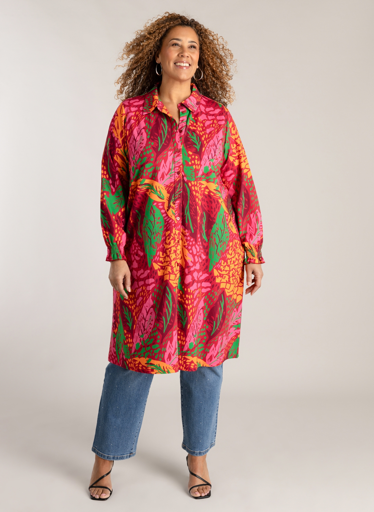 De Nina jurk is een kleurrijk item dat perfect past bij het vroege voorjaar. Dit doorknoopmodel valt tot op de knie en heeft gesmockte manchetten voor een comfortabel accent. Draag hem nu leuk met een broek en later, als het warmer wordt, gewoon als jurk. Lengte 110 cm.