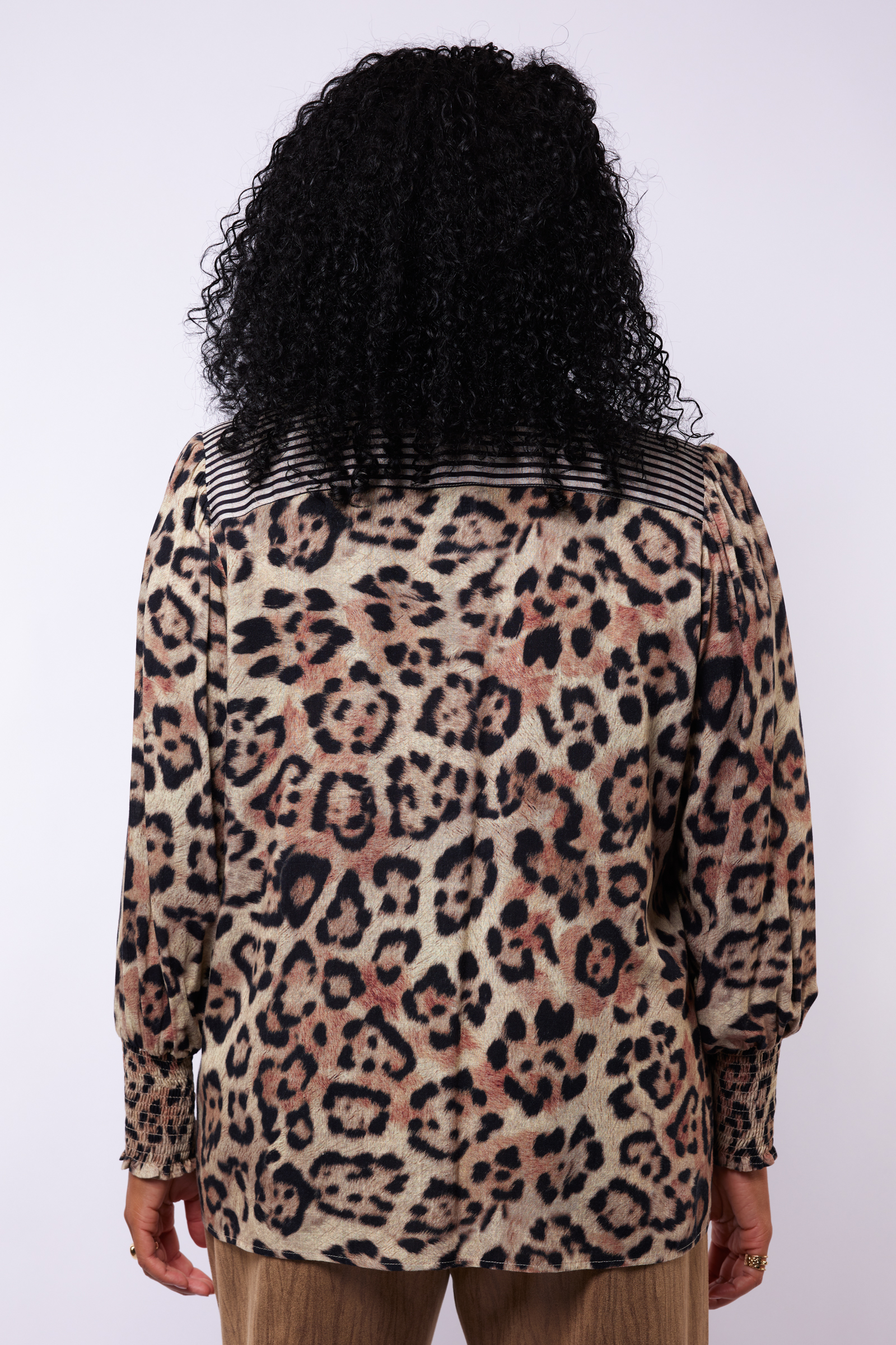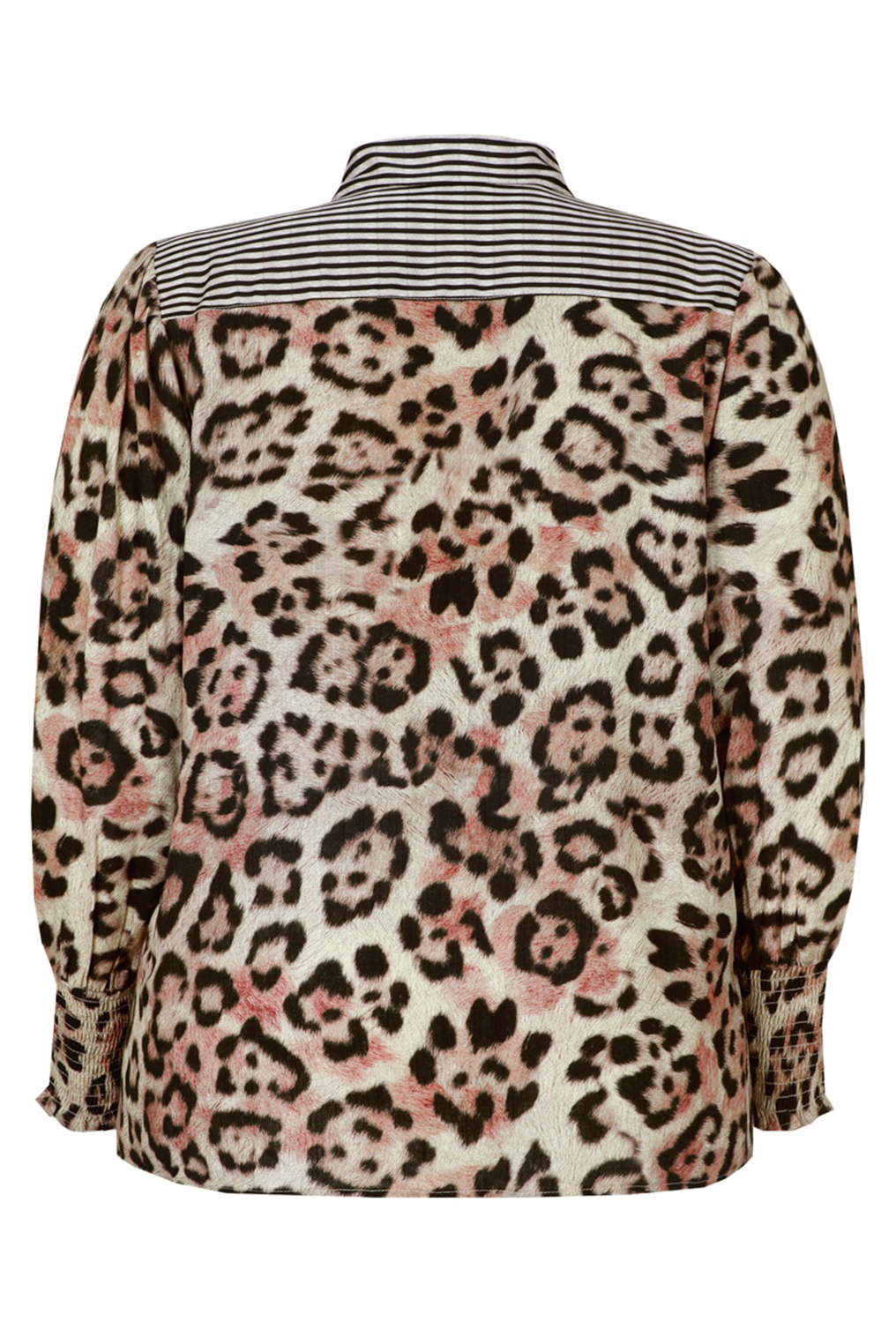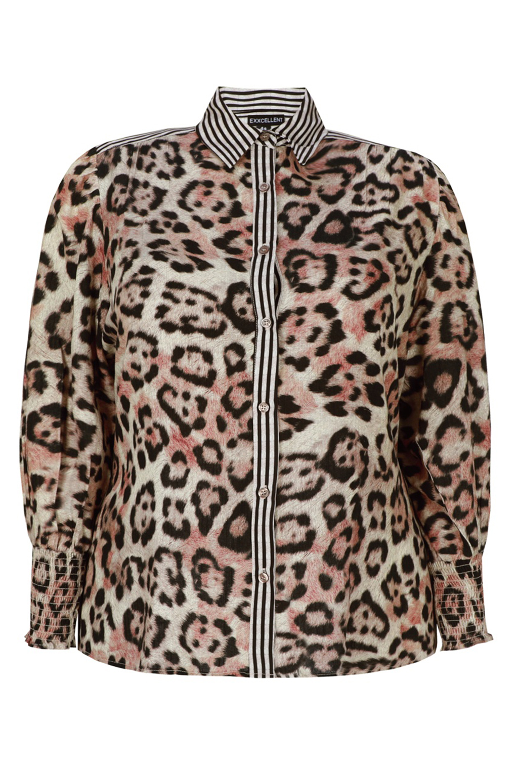 De Ayla blouse van Exxcellent is een opvallende blouse waarmee je moeiteloos een stijlvolle uitstraling creëert. De modieuze luipaardprint in zachte tinten wordt speels gecombineerd met een gestreepte kraag en manchetten, wat zorgt voor een mooi contrast. De blouse valt normaal en draagt comfortabel bij maatje meer.