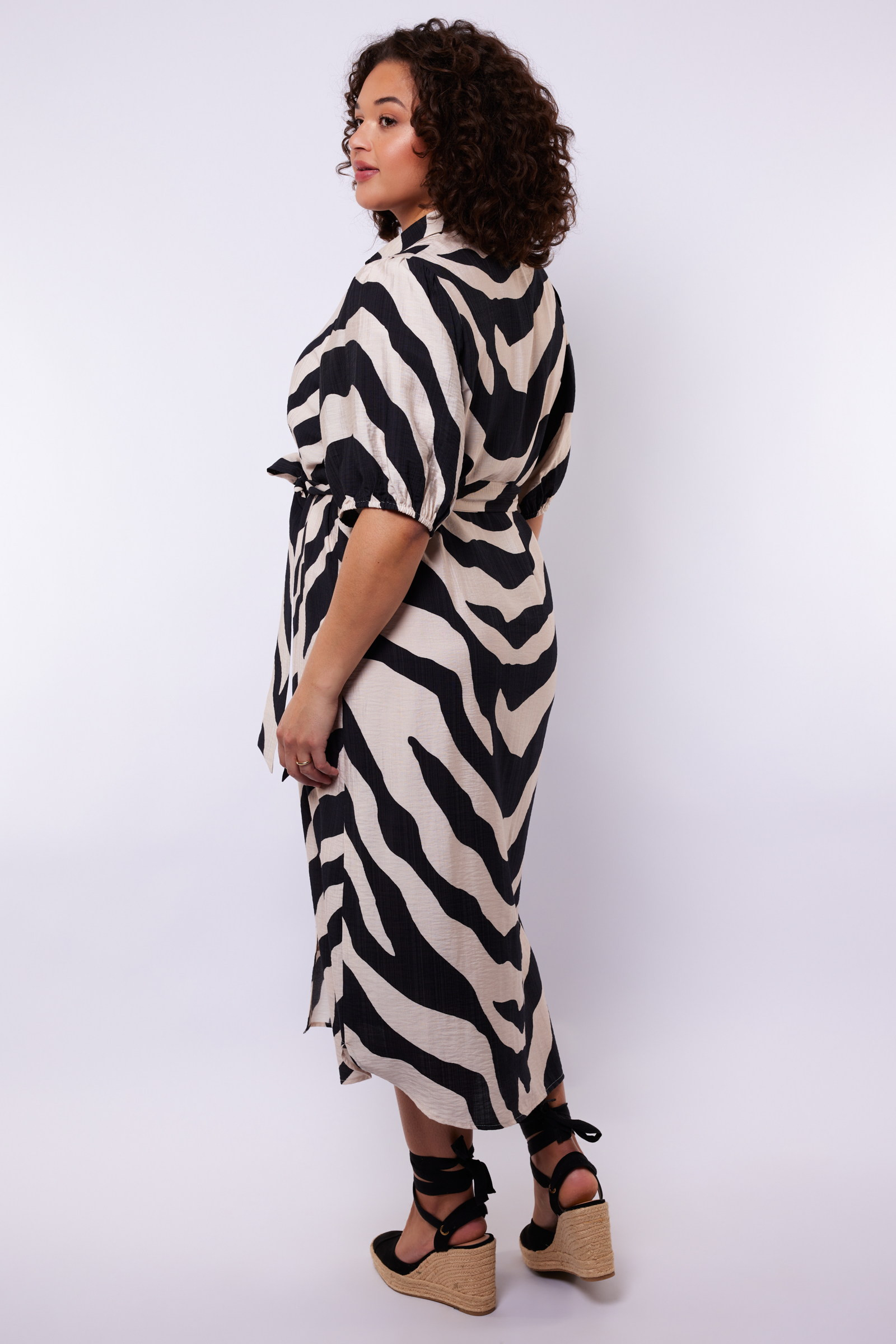Een stijlvolle blikvanger met een elegante en vrouwelijke uitstraling. De Anniston jurk heeft een losvallende pasvorm met een klassieke kraag en doorknoopsluiting, terwijl de halflange mouwen en bijpassende strikceintuur zorgen voor een comfortabel en flatterend silhouet. De zachte zebra print en soepelvallende kwaliteit geven de jurk een speelse, maar verfijnde touch.