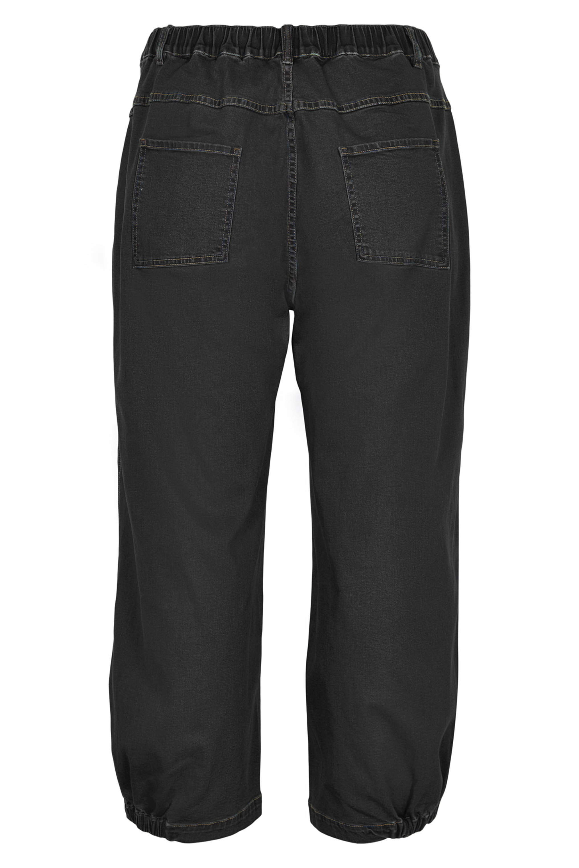 Bekend model broek van de Gozzip liefhebbers. Dit is een uitvoering in een zwarte denim. De broek heeft een losse pasvorm met wijdere pijpen die aan de onderkant bij de zoom en elastiekje hebben. Dit model heeft grote opgestikte zakken voor en kleinere op het achterpand. In de achtertaille zit elastiek. De jeans broek sluit met een rits. De broek valt net boven de enkels.