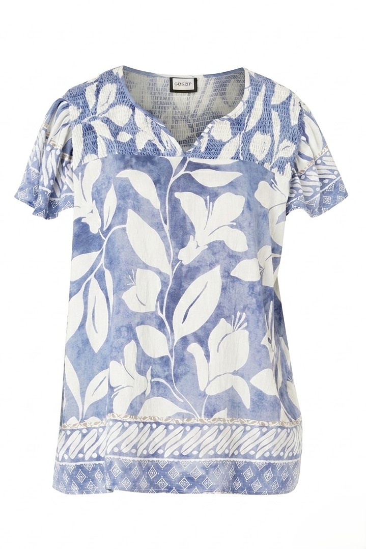 De Juliana blouse van het merk Gozzip is een luchtige en comfortabele blouse met een blauw/witte allover print. De blouse valt soepel langs het lichaam en heeft een flatterende pasvorm die mooi aansluit bij jouw vormen.