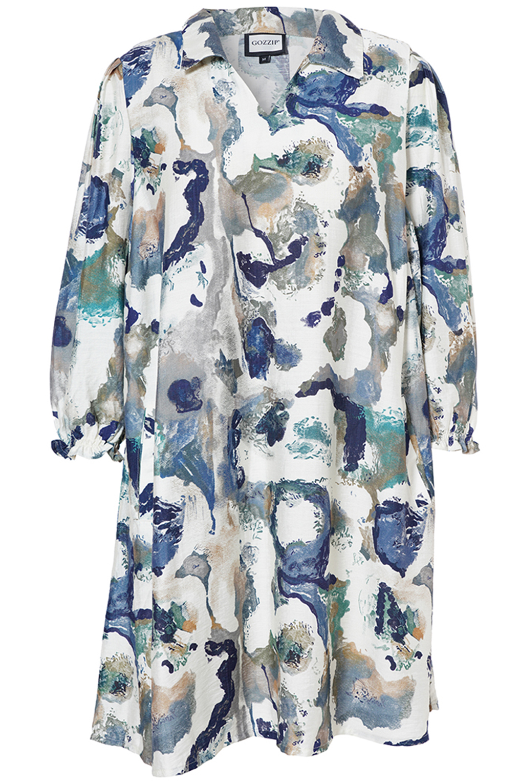 De tuniek heeft een klassieke overhemdkraag die overloopt in een open V-hals, wat zorgt voor een flatterende halslijn. De lange mouwen zijn afgewerkt met een fijn elastiek dat een subtiel gerafeld effect geeft aan de manchetten.