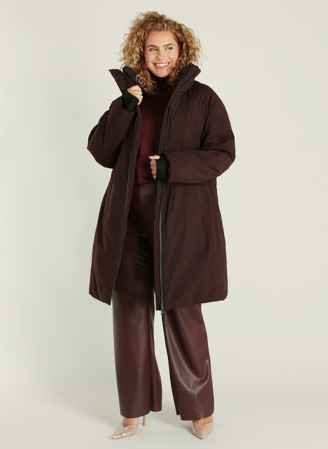 De afknoopbare capuchon en hoge kraag beschermen je goed tegen kou en wind. Binnenin zorgen de extra manchetten voor extra warmte en comfort. De jas heeft een lichte A-lijn, waardoor hij een vrouwelijke pasvorm heeft die mooi afkleedt.