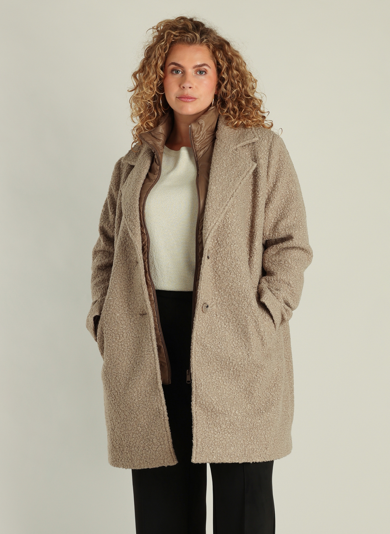 Met deze boucle jas van Yest Curve ben je klaar voor elk weertype. De jas is gevoerd en beschikt over een afritsbaar deel dat extra warmte biedt op koude dagen. Het warme, zachte materiaal in een tijdloze taupekleur geeft je een comfortabele en chique uitstraling, perfect om makkelijk te combineren met al je winteroutfits.