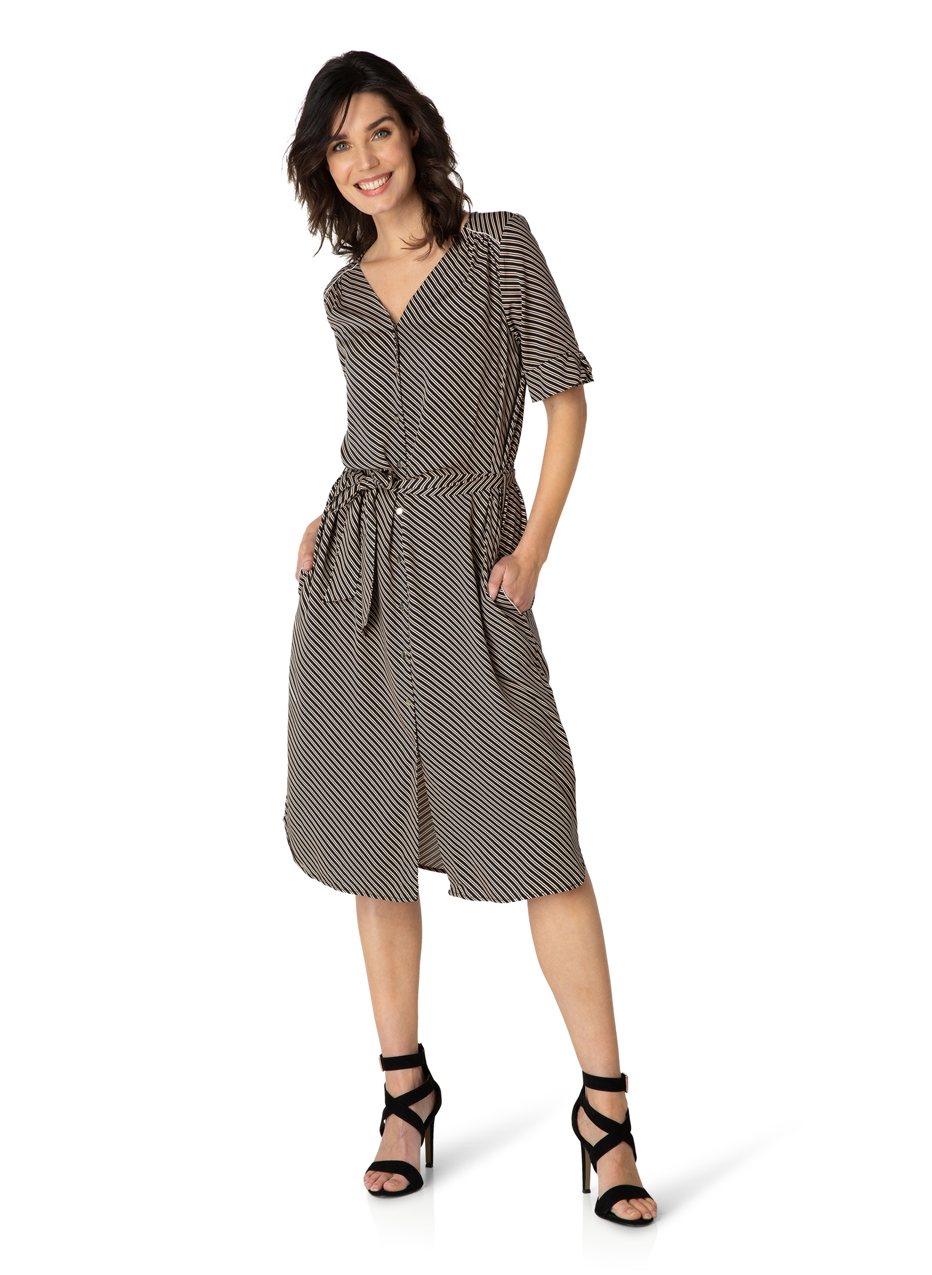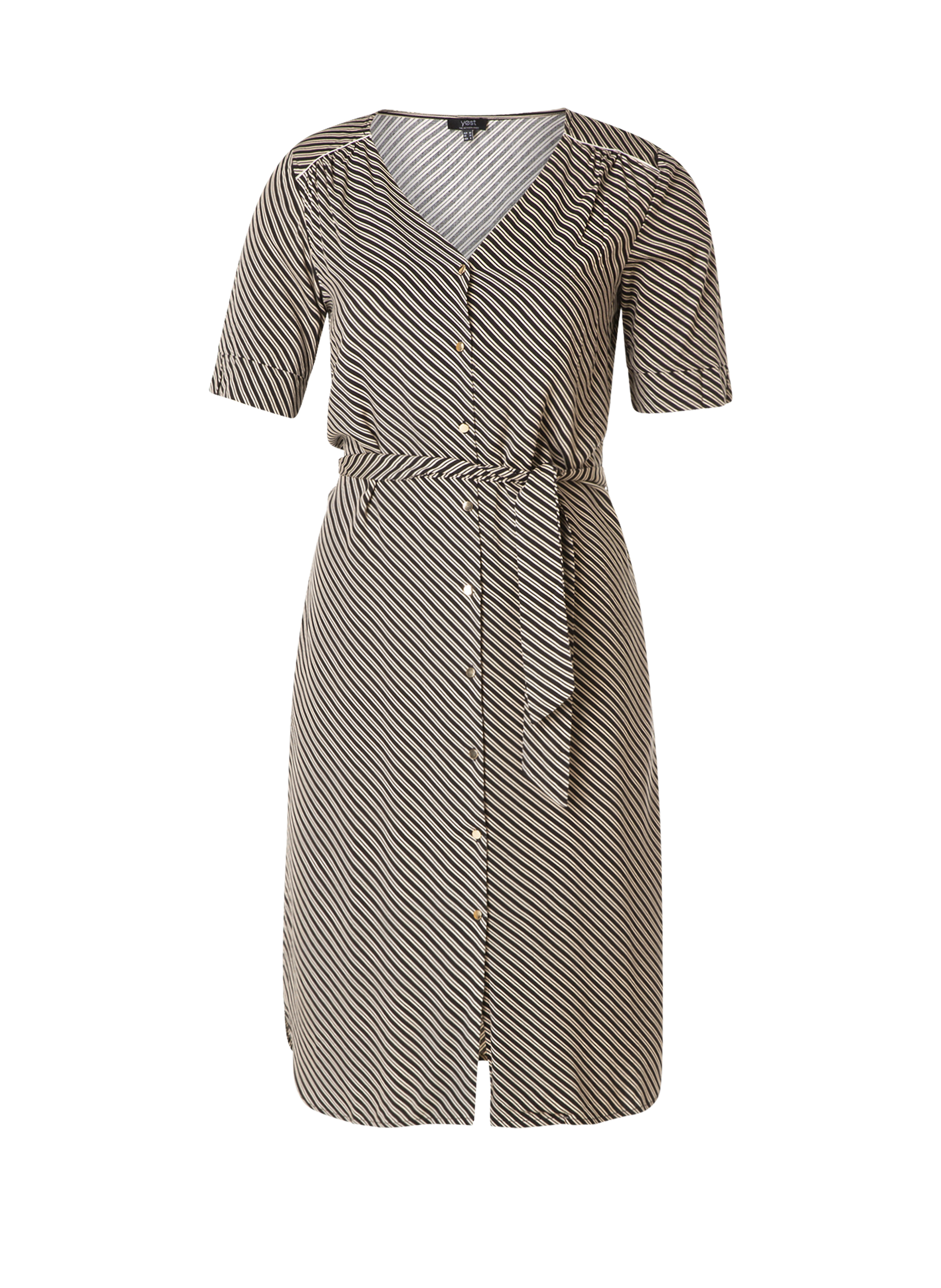 Jurk Inez van yest heeft een diagonale streepprint. Deze jurk heeft kleine goudkleurige knopen en een stoffen strikceintuur. In de zijnaad zitten steekzakken. De jurk valt op kniehoogte en de panden zijn licht afgerond.
