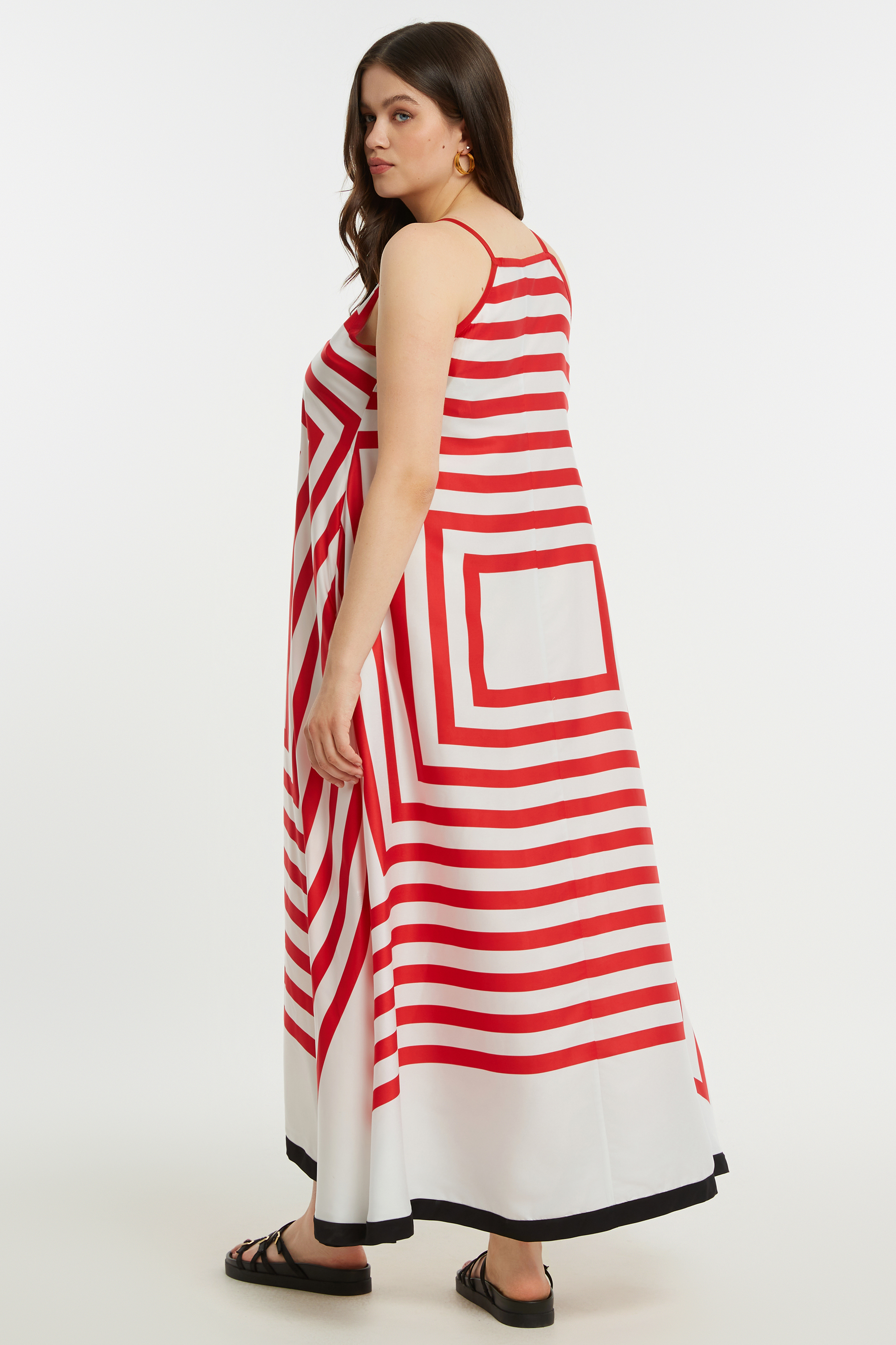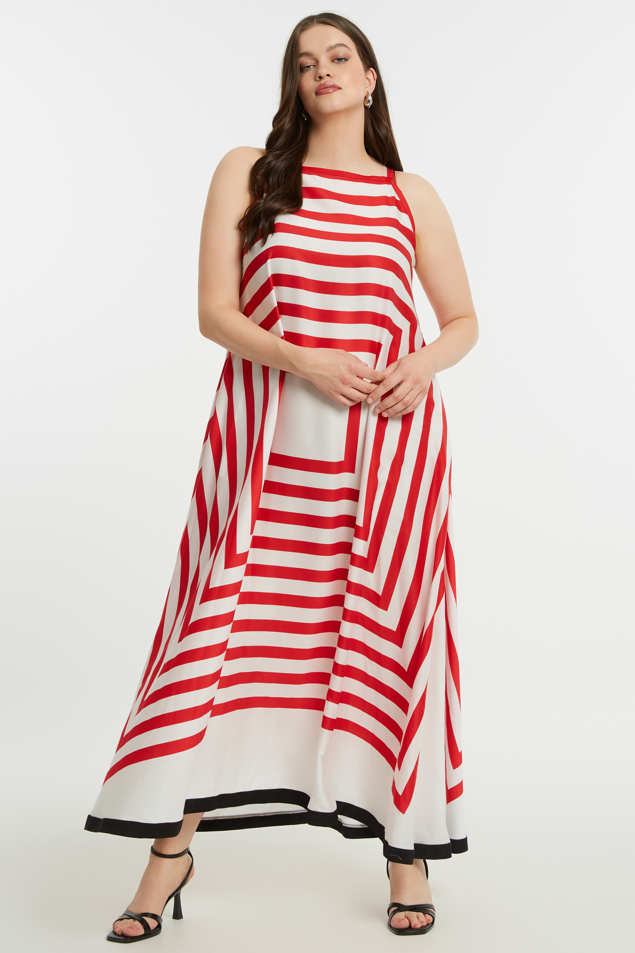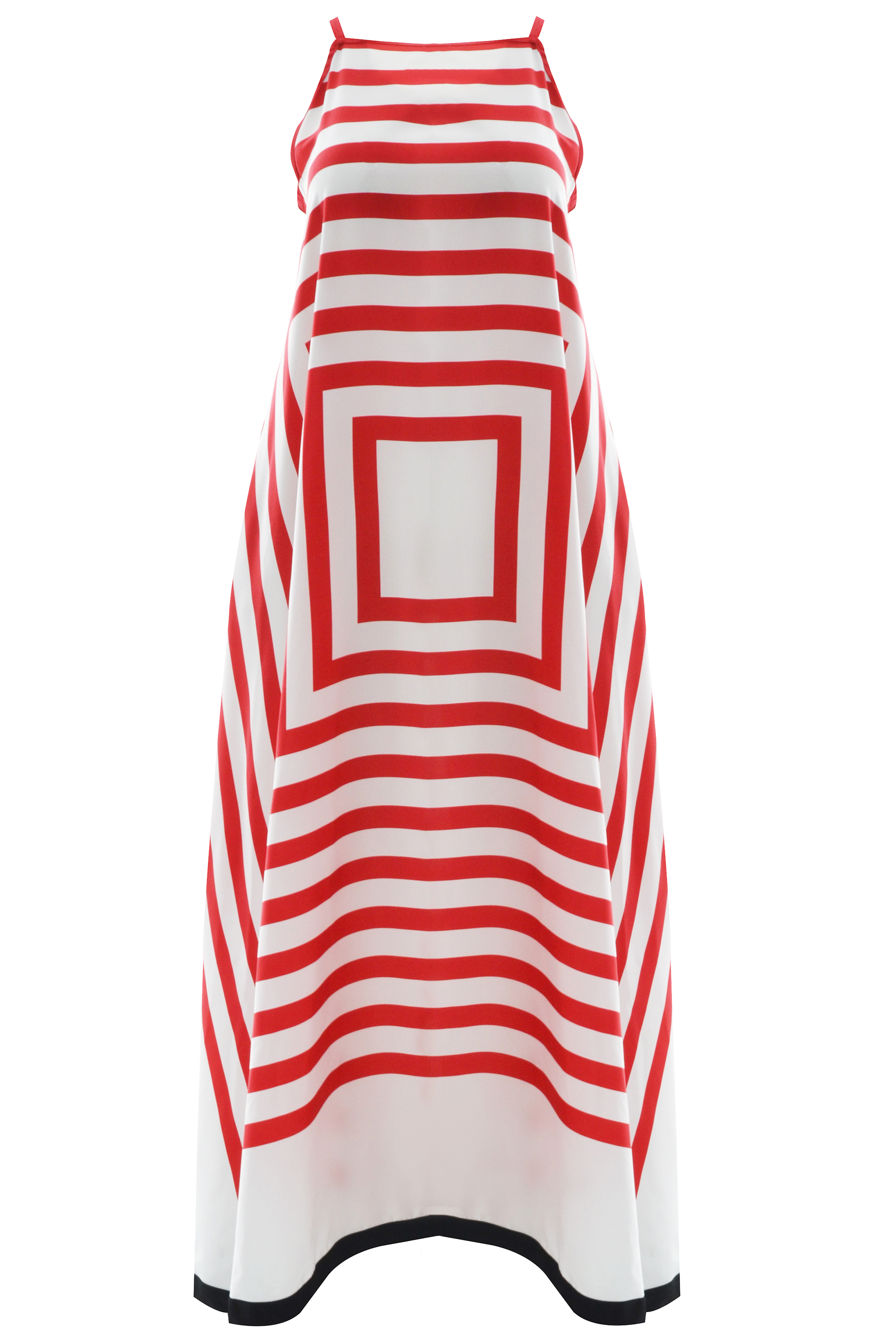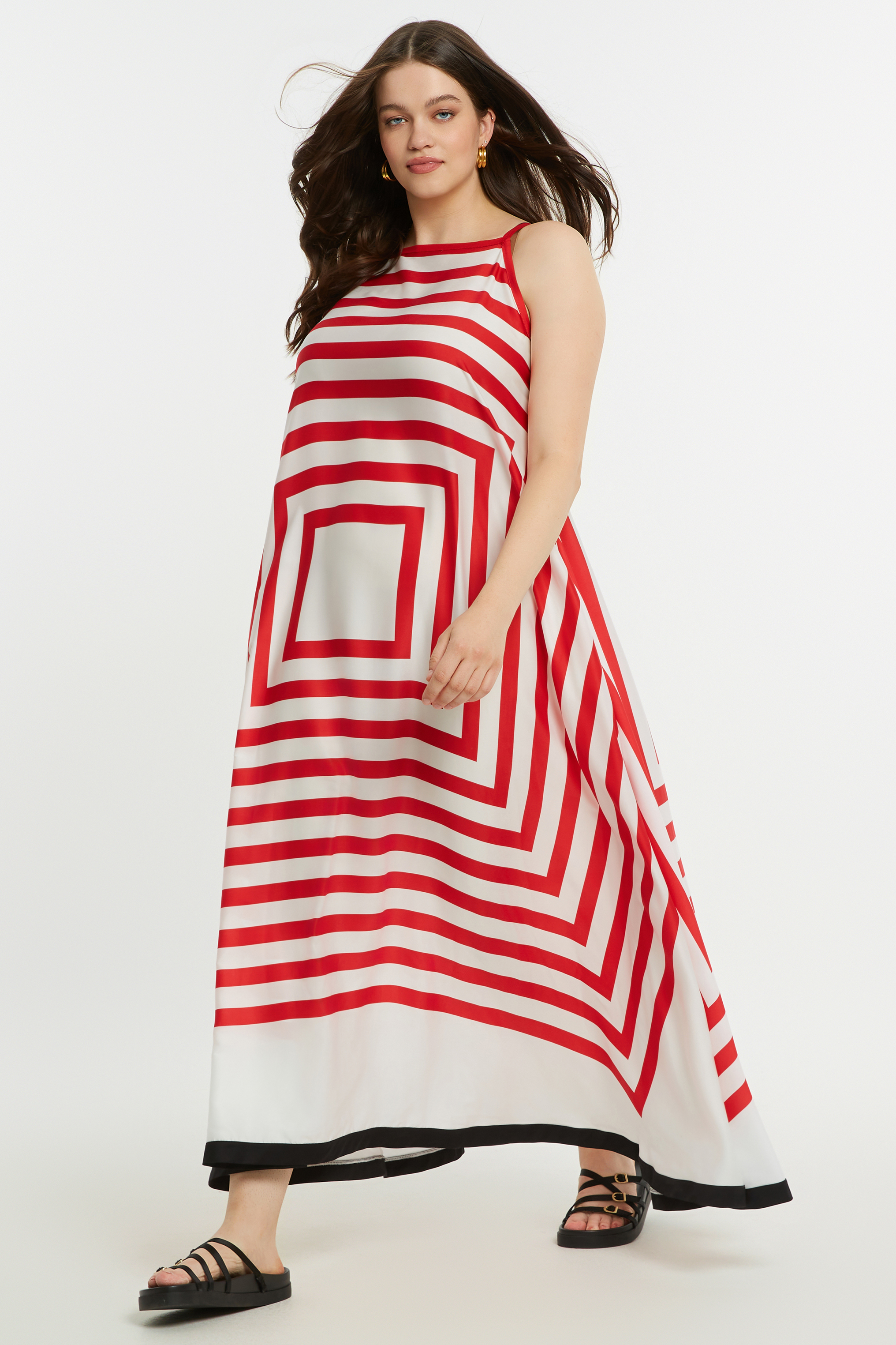 Deze lange jurk van Mat Fashion met rood-wit streepdessin en zwarte bies aan de onderkant is perfect voor zonnige dagen. De jurk heeft spaghetti bandjes, waardoor hij luchtig en comfortabel draagt. In de zijnaden heeft de jurk steekzakken. Het losvallende model valt soepel langs het lichaam en beweegt mooi mee, wat zorgt voor een ontspannen en zomerse uitstraling.