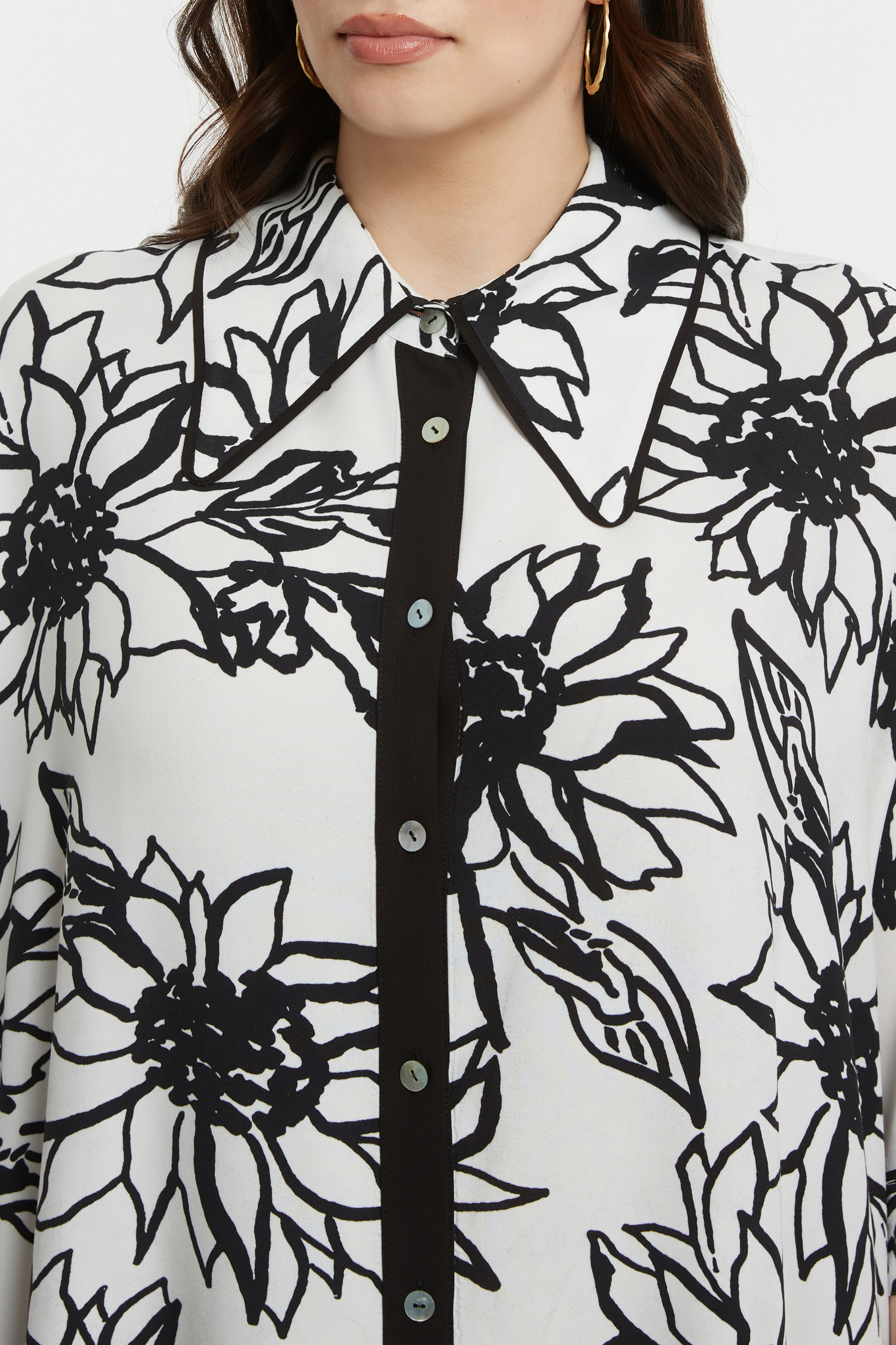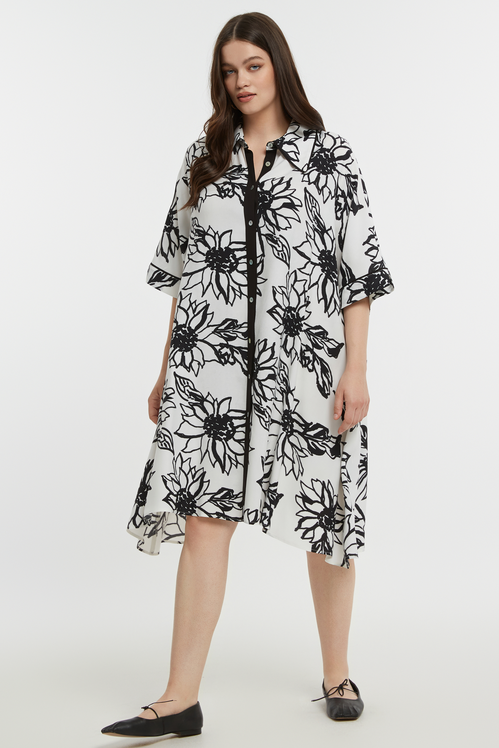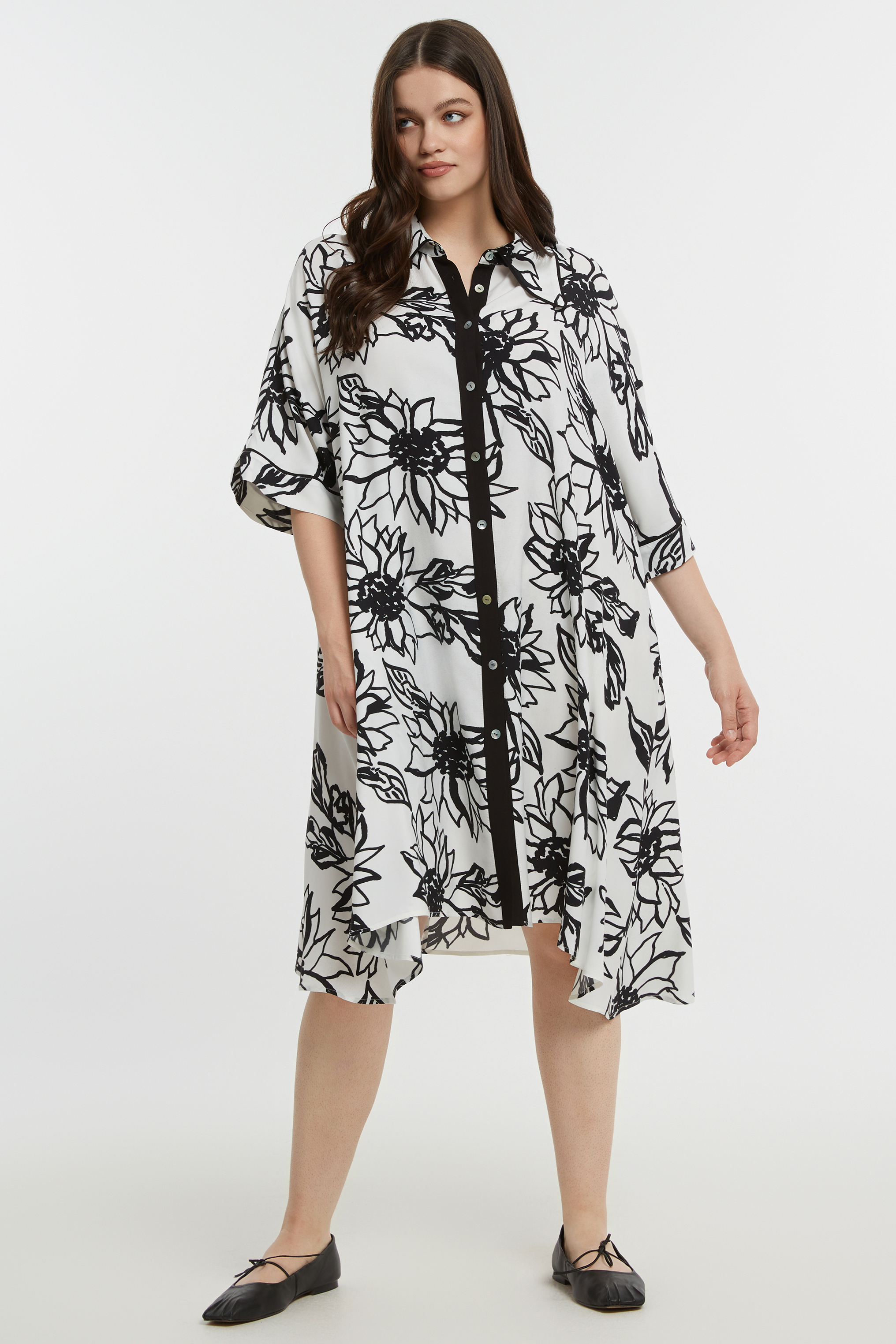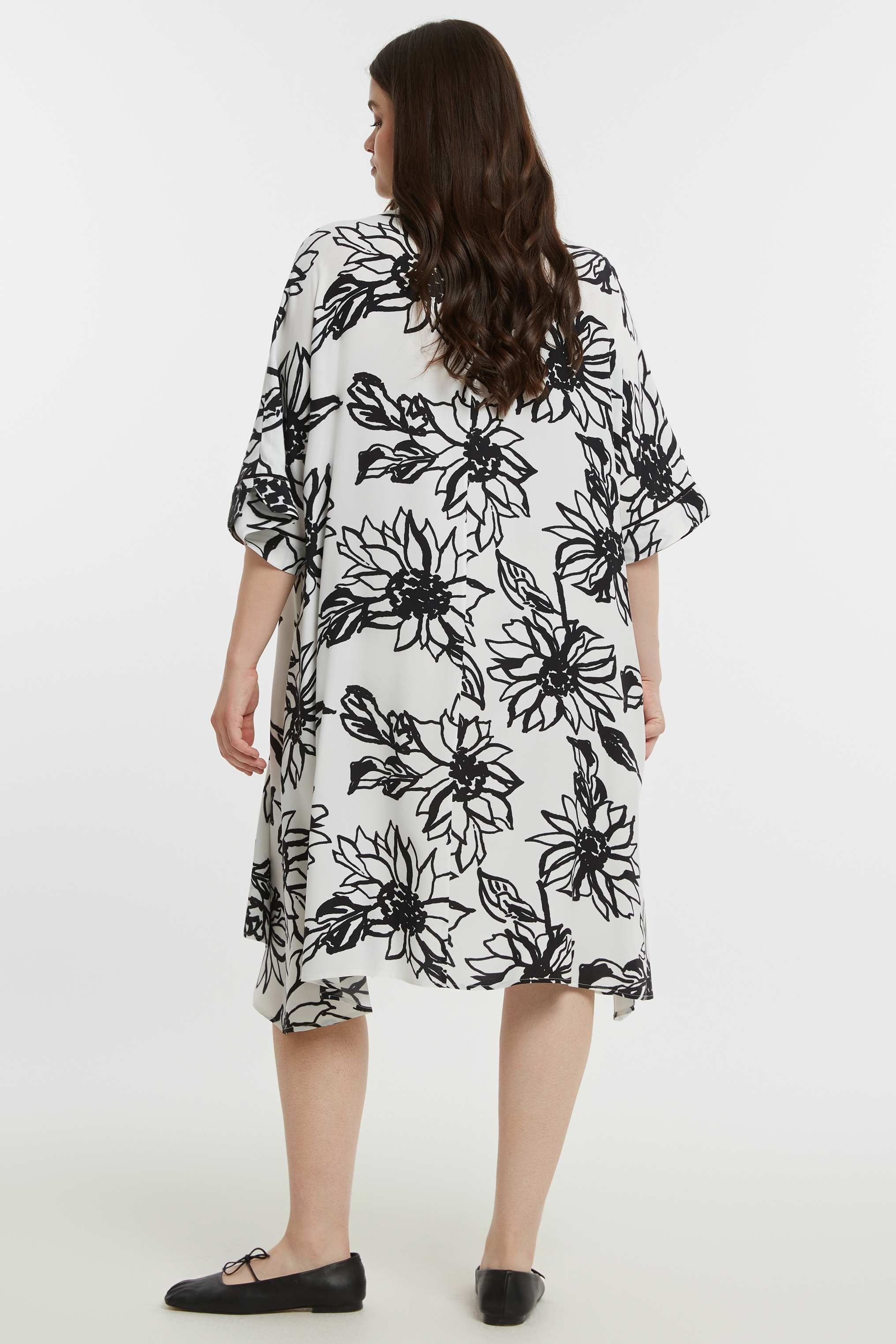 Deze jurk van mat fashion is gemaakt van 100% viscose wat zorgt voor een zachte, soepelvallende stof die comfortabel draagt. De jurk heeft vergrote standaard kraag en sluit met een rij knoopjes. De knoopjes zitten op een zwarte bies aan de voorkant. De jurk heeft aangeknipte mouwen met een zwart biesje langs het manchet. Het bloemige design is tijdloos en veelzijdig, geschikt voor zowel dagelijkse looks als iets feestelijkere gelegenheden. Dankzij de flatterende pasvorm voelt de jurk vrouwelijk en elegant aan, terwijl het materiaal licht en ademend is.