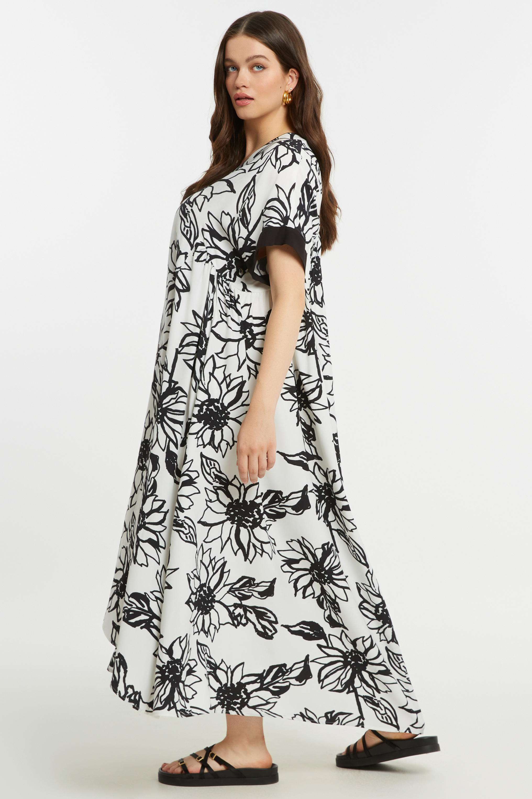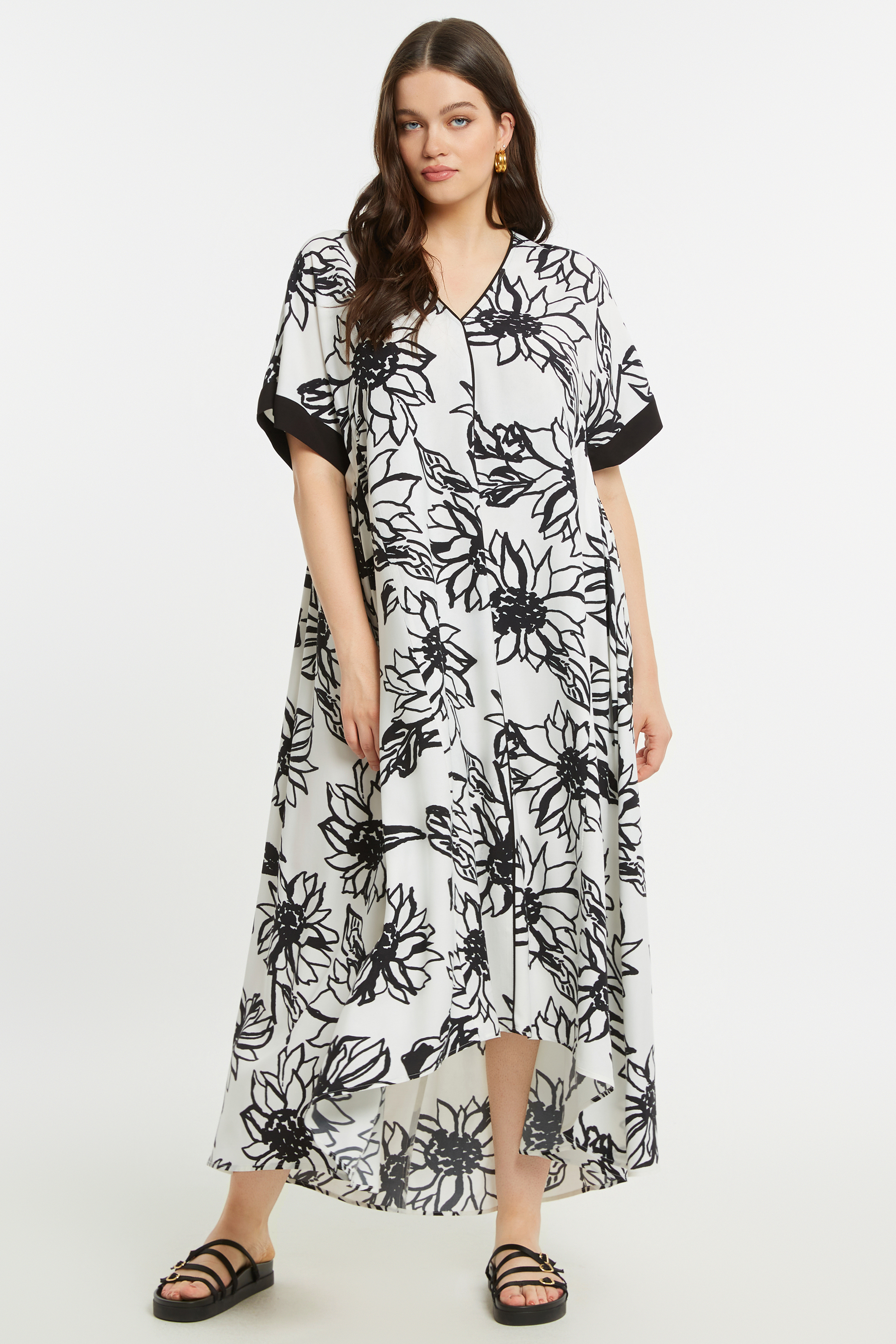 Deze jurk van Mat Fashion is een prtachtige, stijlvolle jurk. Mat Fashion staat bekend om elegante en flatterende mode voor dames, vooral gericht op curvy en grote maten vrouwen. De jurk heeft een mooie V-hals, wat de halslijn erg goed flatteert. Langs de hals een smail biesje. Deze loopt door tot onderaan de jurk. De jurk heeft een aparte snit die de lijnen van het lichaam mooi volgen. Op het achterpand sluit de jurk met een knoopje bovenaan. Kleine plooitjes op het rugpand zorgen voor een mooie pasvorm. In de zijnaden heeft de jurk steekzakken.