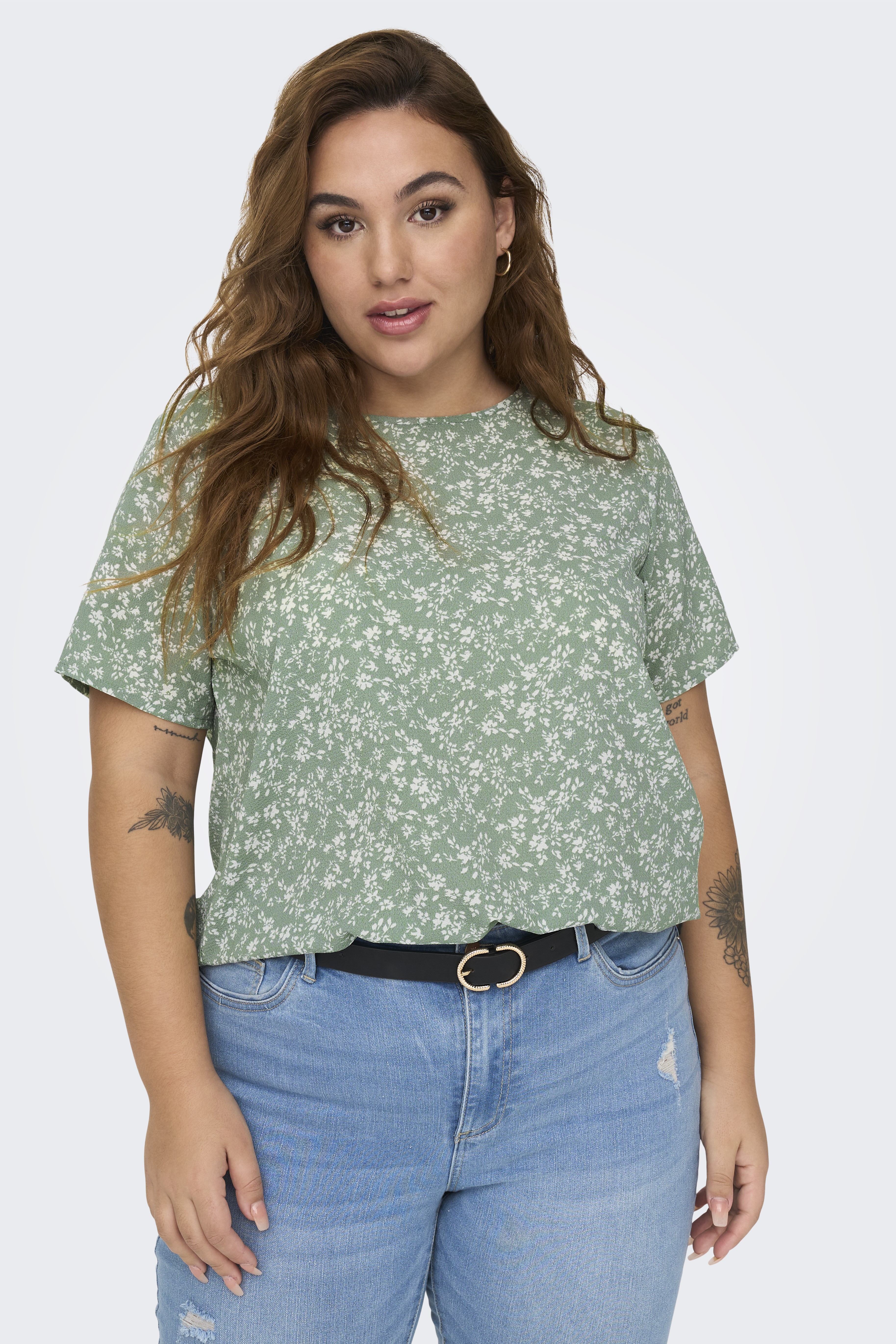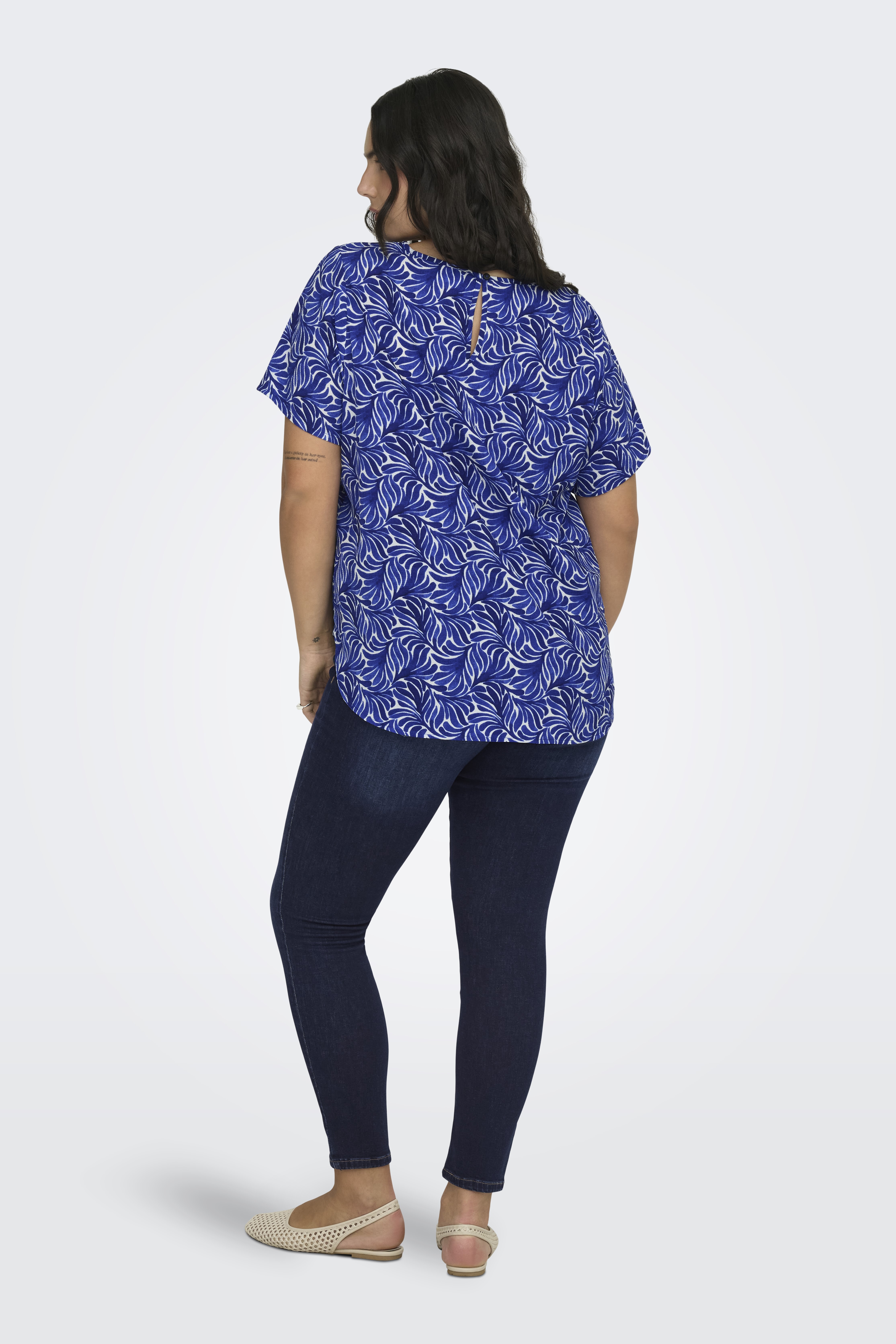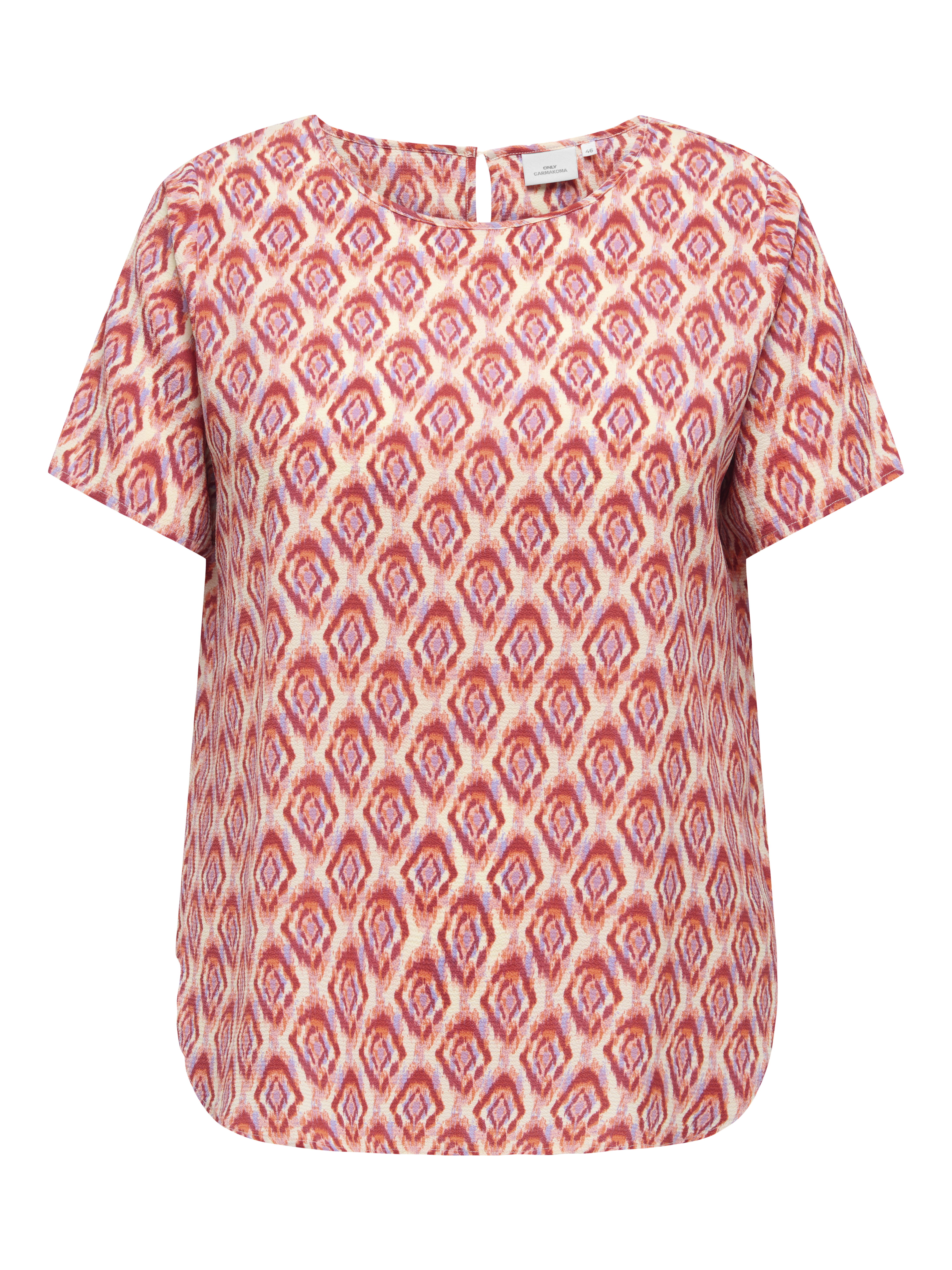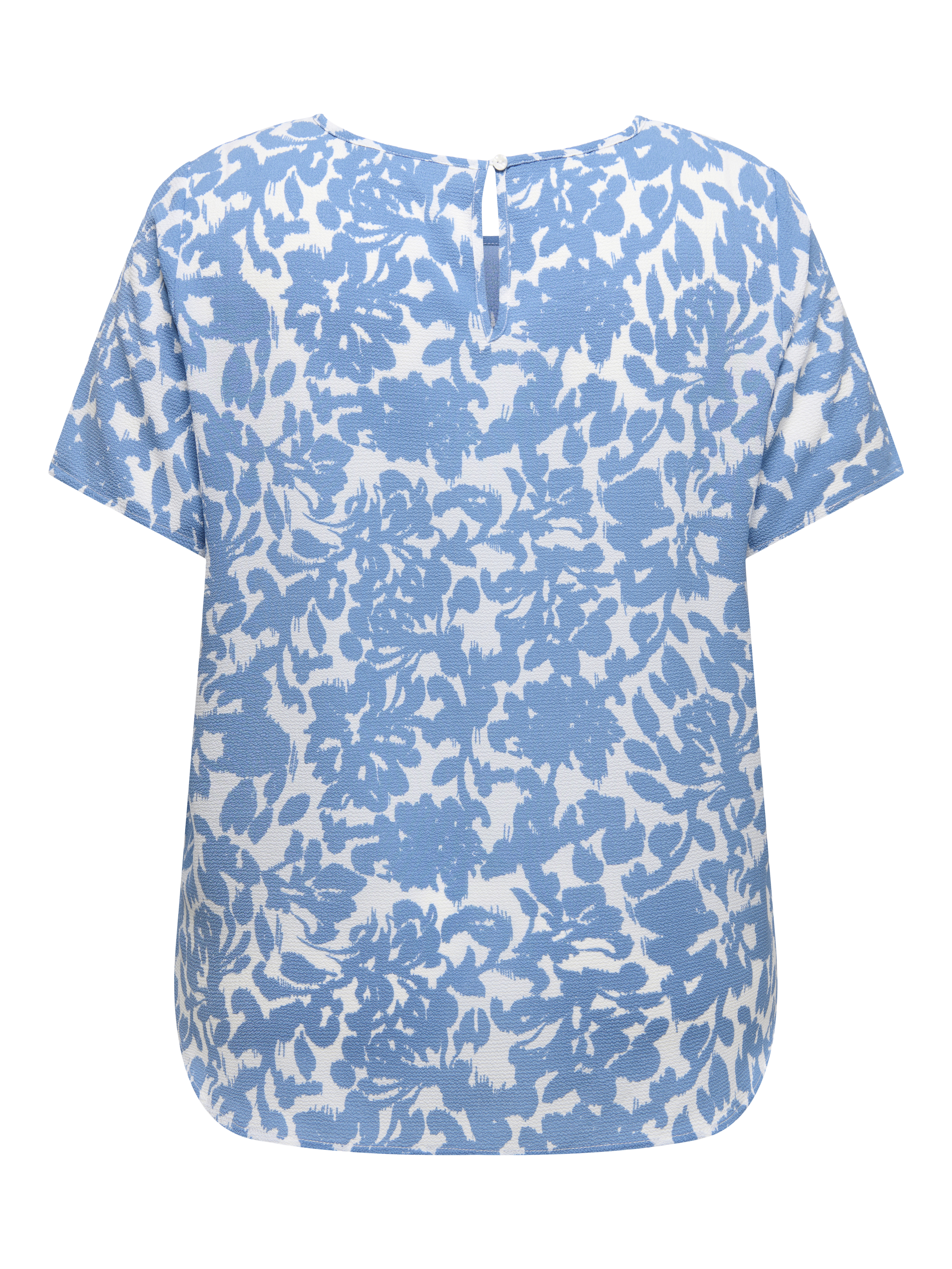 Vlot blousje van ONLY Carmakoma in een shirt model met een ronde hals met in de achternek een split met knoopje en lusje. Het heeft korte mouwen en afgeronde panden, waarbij het voorpand iets korter is dan het achterpand. Hij is gemaakt in de bekende LUX stof, een lichte crepe. De mooiste blouses vindt je in de categorie grote maten blouses.