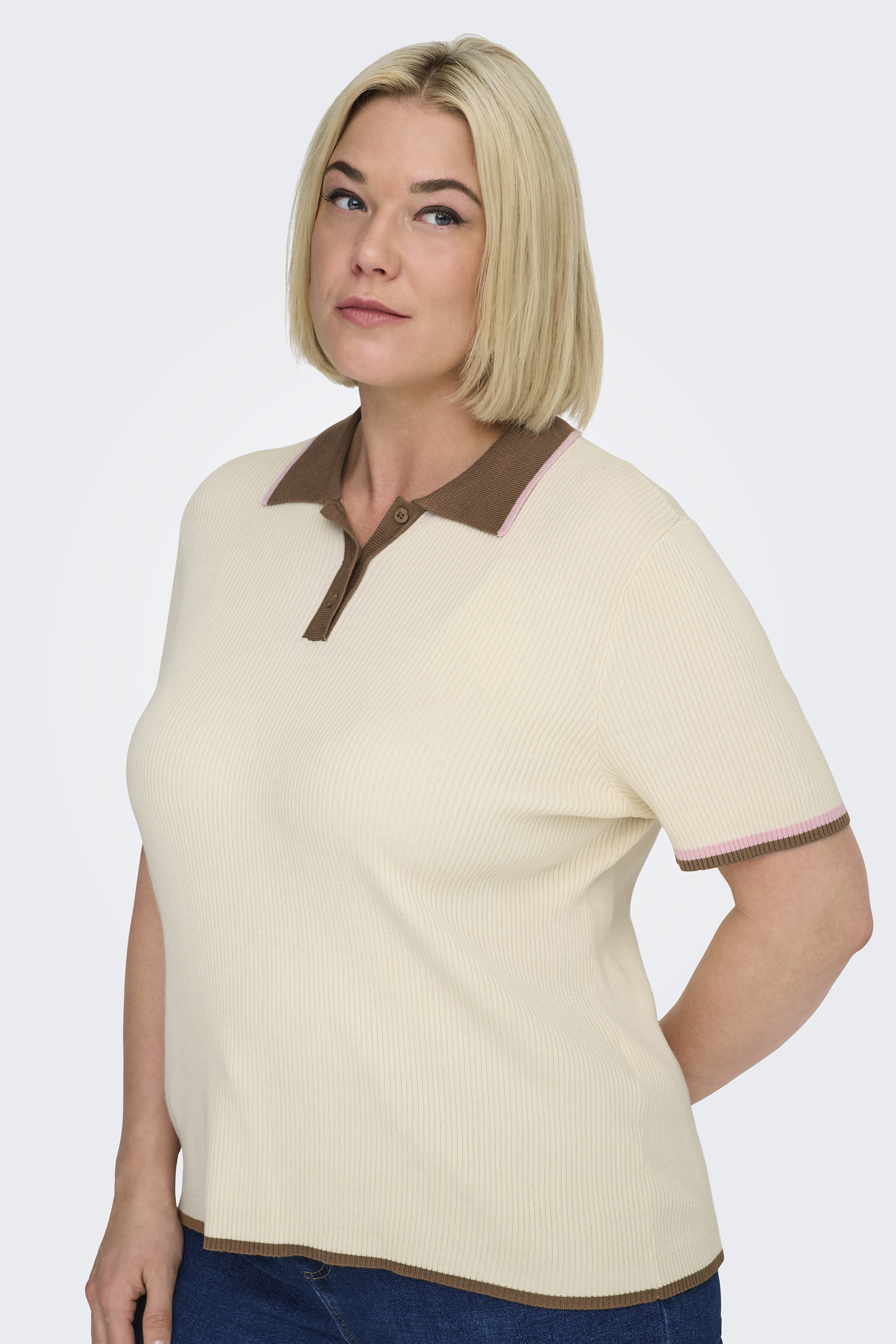 Wat een super gaaf poloshirt van ONLY Carmakoma. Hij is gemaakt in een rib breisel die goed mee rekt. Langs de korte mouw en kraag zit een camel/ roze streep. Langs de zoom alleen een camel kleur. Hij heeft een kort knooppad. Dit shirt heeft een losse pasvorm. Draag dit netjes bij een mooie broek of sportief bij een jeans.