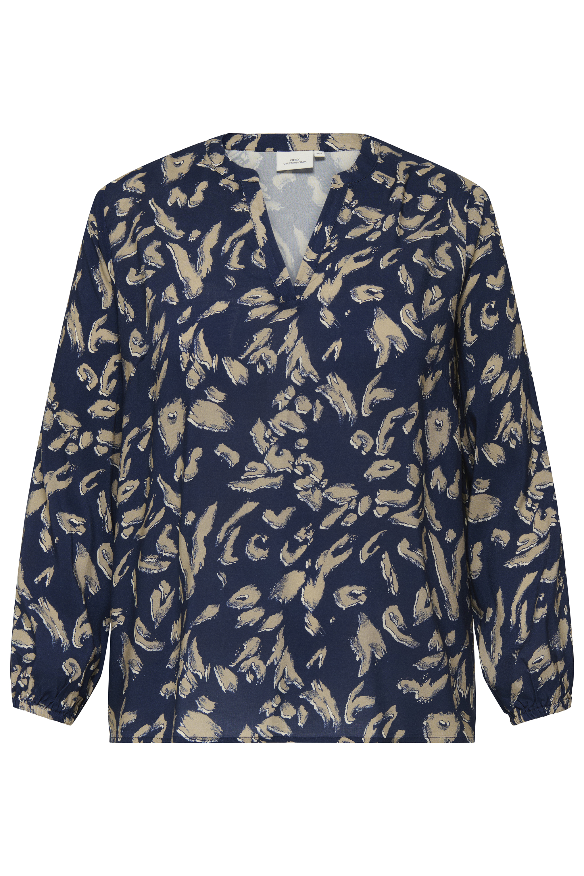 De ONLY Carmakoma ECO Blouse is een luchtige blouse uitgevoerd in een donkerblauwe kleur met een abstracte print. Het model heeft een V-hals en lange mouwen met elastische boorden. De blouse heeft een losse, rechte pasvorm en is perfect voor een casual en verfijnde look. Het ademende materiaal maakt deze blouse ideaal voor de overgangsmaanden.