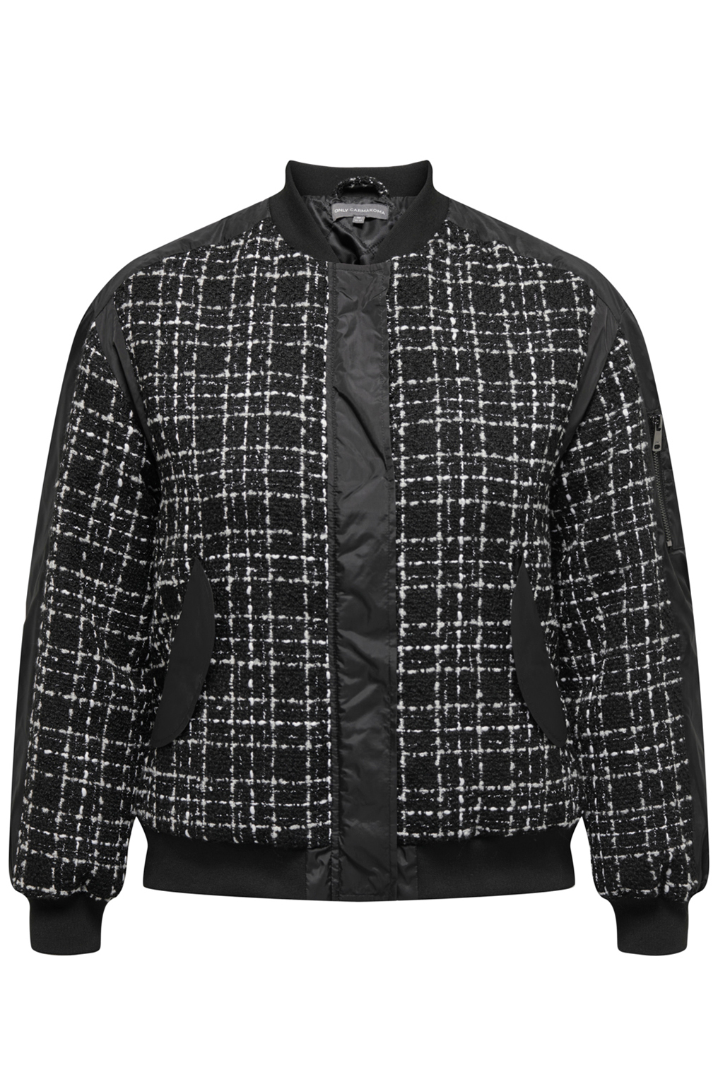 ONLY Carmakoma jas CARKARMA is een kort bomber model. Hij heeft een combinatie van 2 stoffen een zwart witte tweed en een glanzende satijnachtige stof. De achterkant van de mouwen zijn in de glas stof en de voorkant in de tweed. Op de linkermouw zit een  klein rits vakje. In het voorpand zitten zakken die een glansstof klep hebben. De ritssluiting zit achter een flap. Hij is gevoerd met een dunne stepvoering. Het is een warme jas. De lengte is bij maat 46, 64 cm. Je vindt al onze jassen in de categorie grote maten jassen.