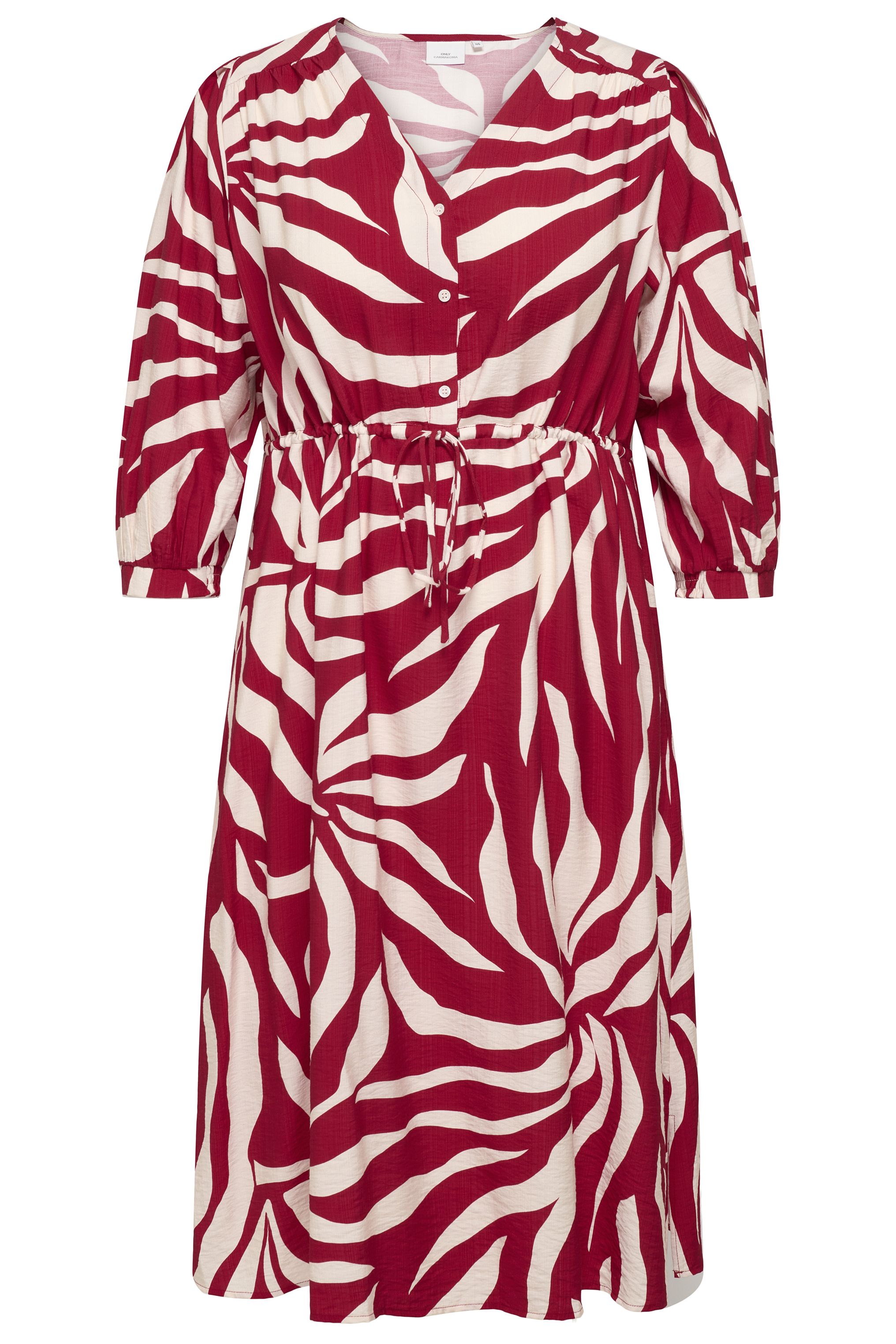 Wat een plaatje deze jurk van ONLY Carmakoma. Ideaal voor een feest of bruiloftj. De jurk heeft V-hals met knooppad tot de taille naad. Hierin zit een aantrekkoord verwerkt, zo kun je iets meer taille maken. De mouwen valln 7/8e en de mouwopening is aan de voorkant glad en achter heeft hij elastiek. De stof heeft een hoogwaardige uitstraling met een lichte glans en structuur. Valt erg mooi. De lengte van de jurk valt over de knie. De print is een combinatie van een zebra print en een grote bloem. Je moet even goed kijken!. Meer leuke jurken vind je in de categorie jurken.