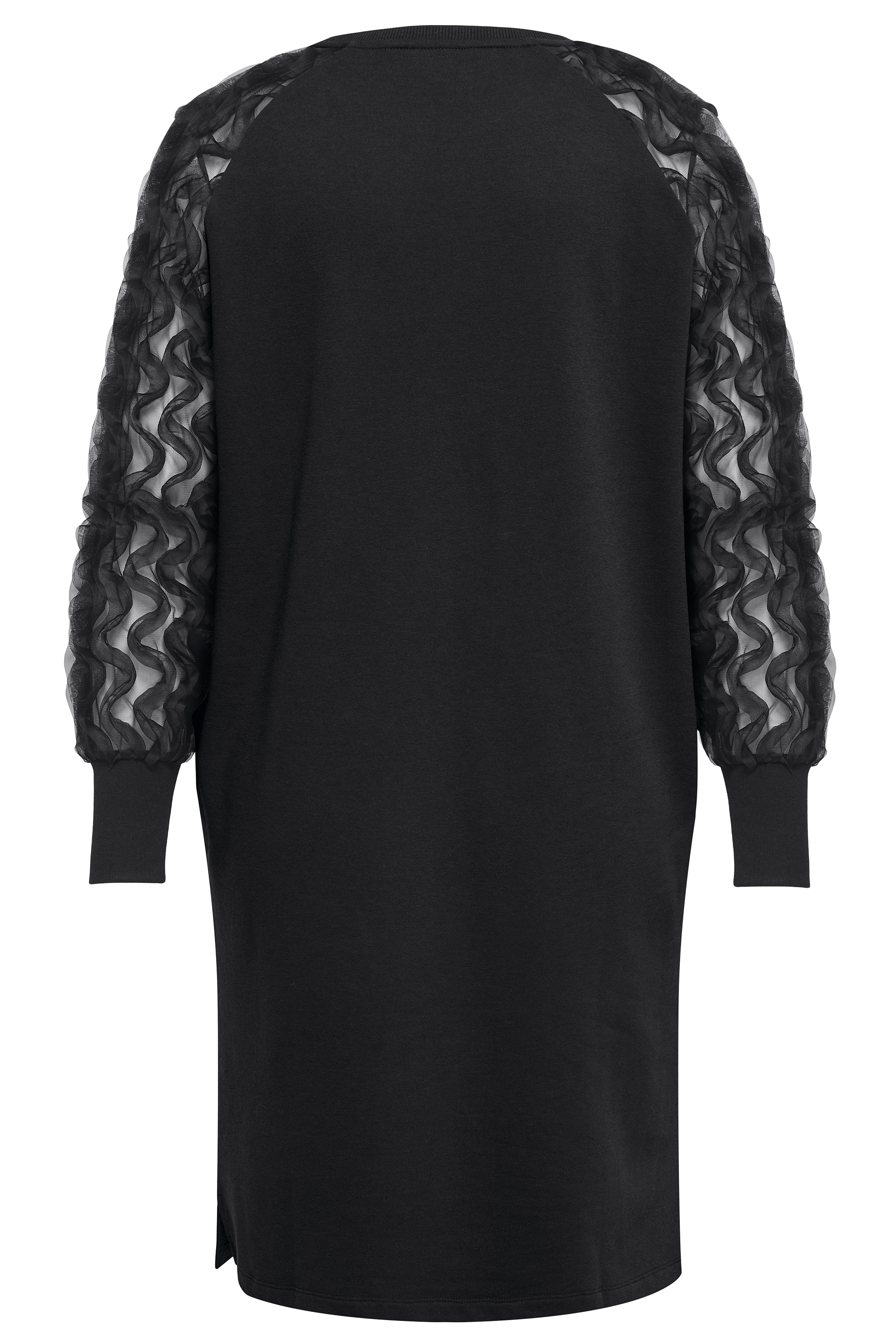 De jurk heeft een ronde hals en lange mouwen met geribbelde manchetten, wat zorgt voor een sportieve en moderne uitstraling. De normale pasvorm valt mooi over jouw curves en biedt voldoende bewegingsvrijheid. De zijsplit en het unieke 3D-detail met subtiel tule-accent op de mouwen geven deze  look een speels en vrouwelijk randje