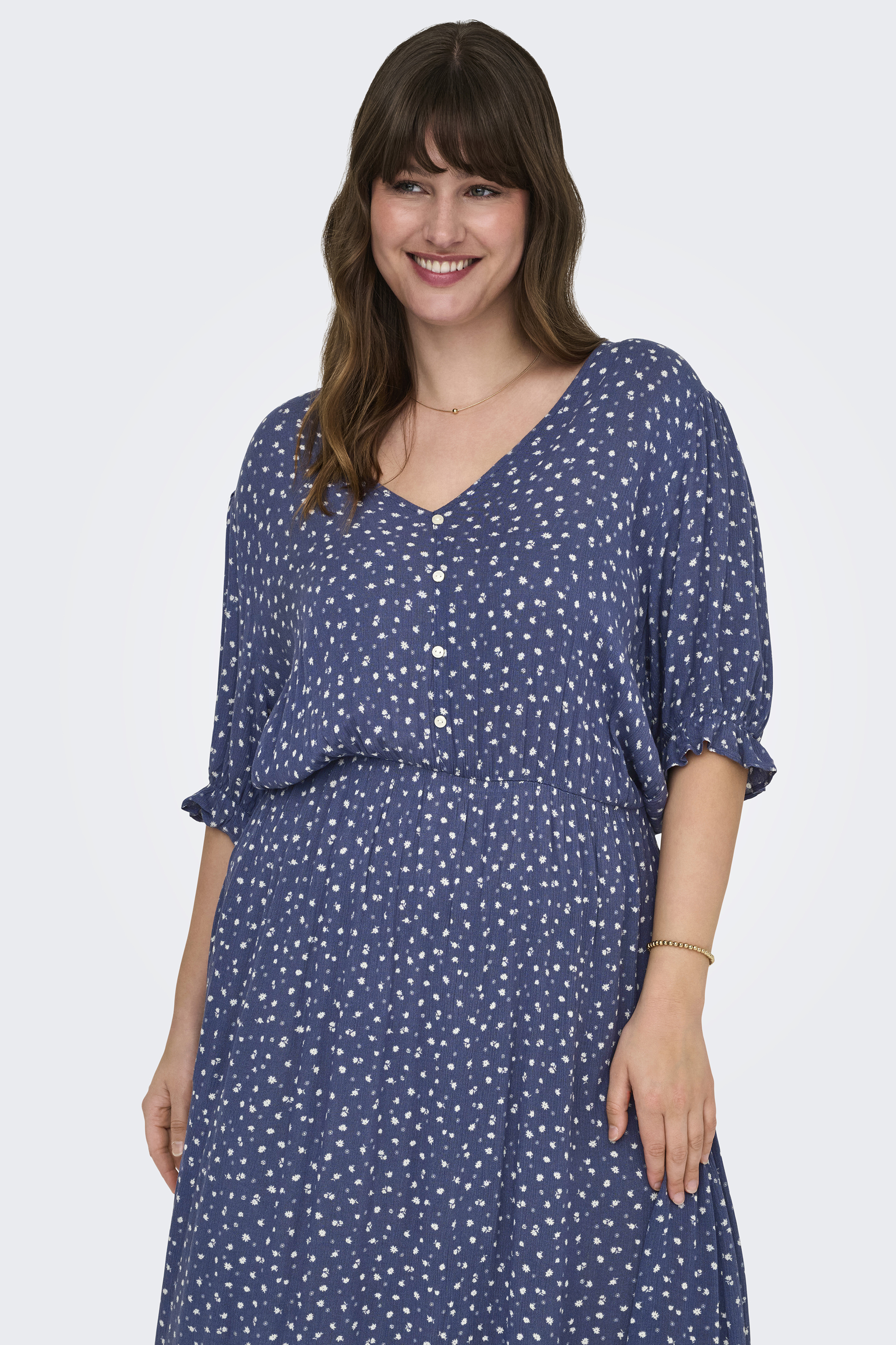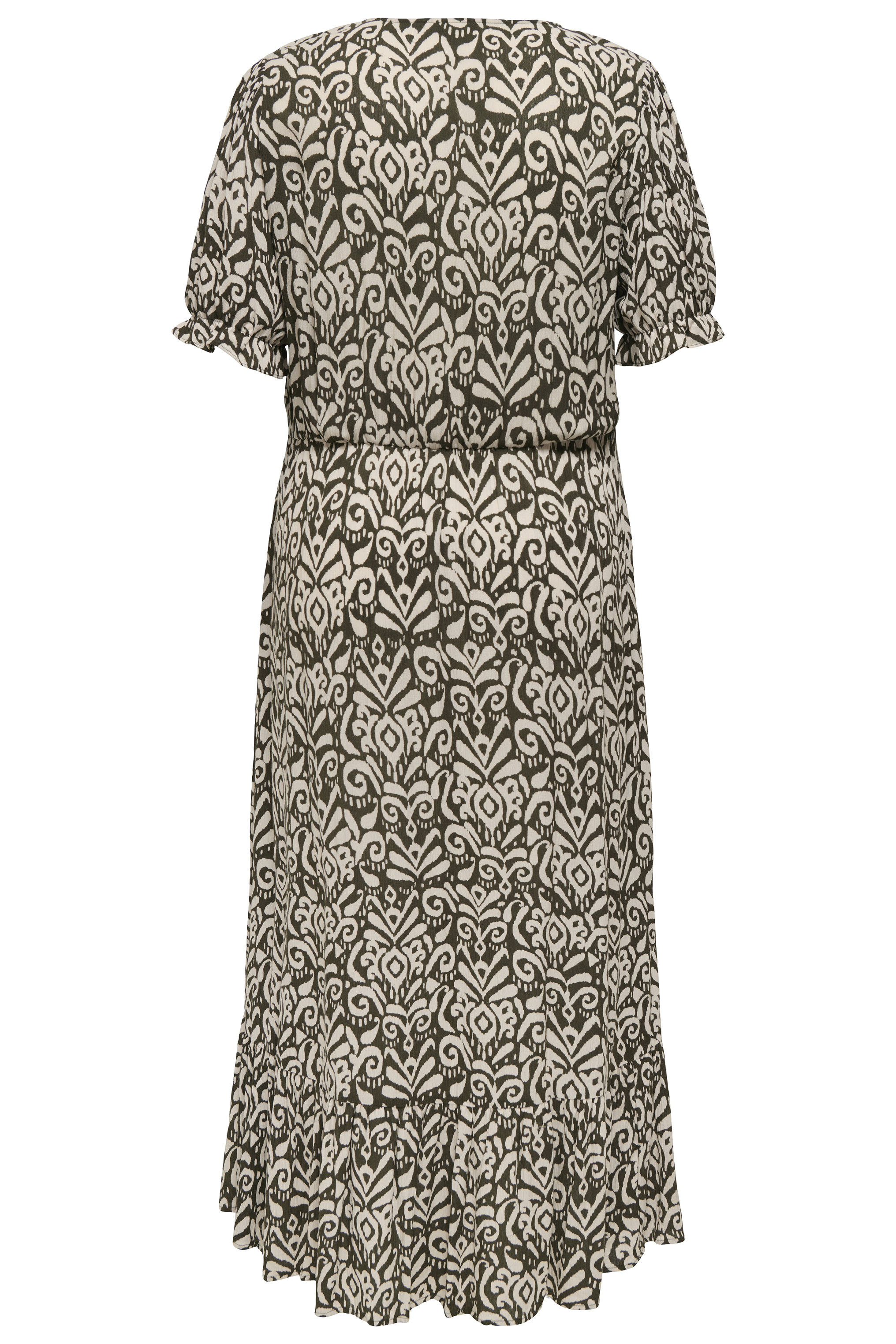 ONLY Carmakoma jurk CARCHIANTI is een super leuke zomerse jurk. Hij valt lang en heeft aan de onderkant een ruche strook. Hij heeft een V hals met een dicht knooppad eronder. De korte mouwen hebben een poffend effect en elastiek 2cm vanaf de zoom, zo heb je een smal ruche. De jurk is gemaakt in een crincle stof met 2 leuke prints. Wil je meer jurken zien klik dan op de link Jurken.