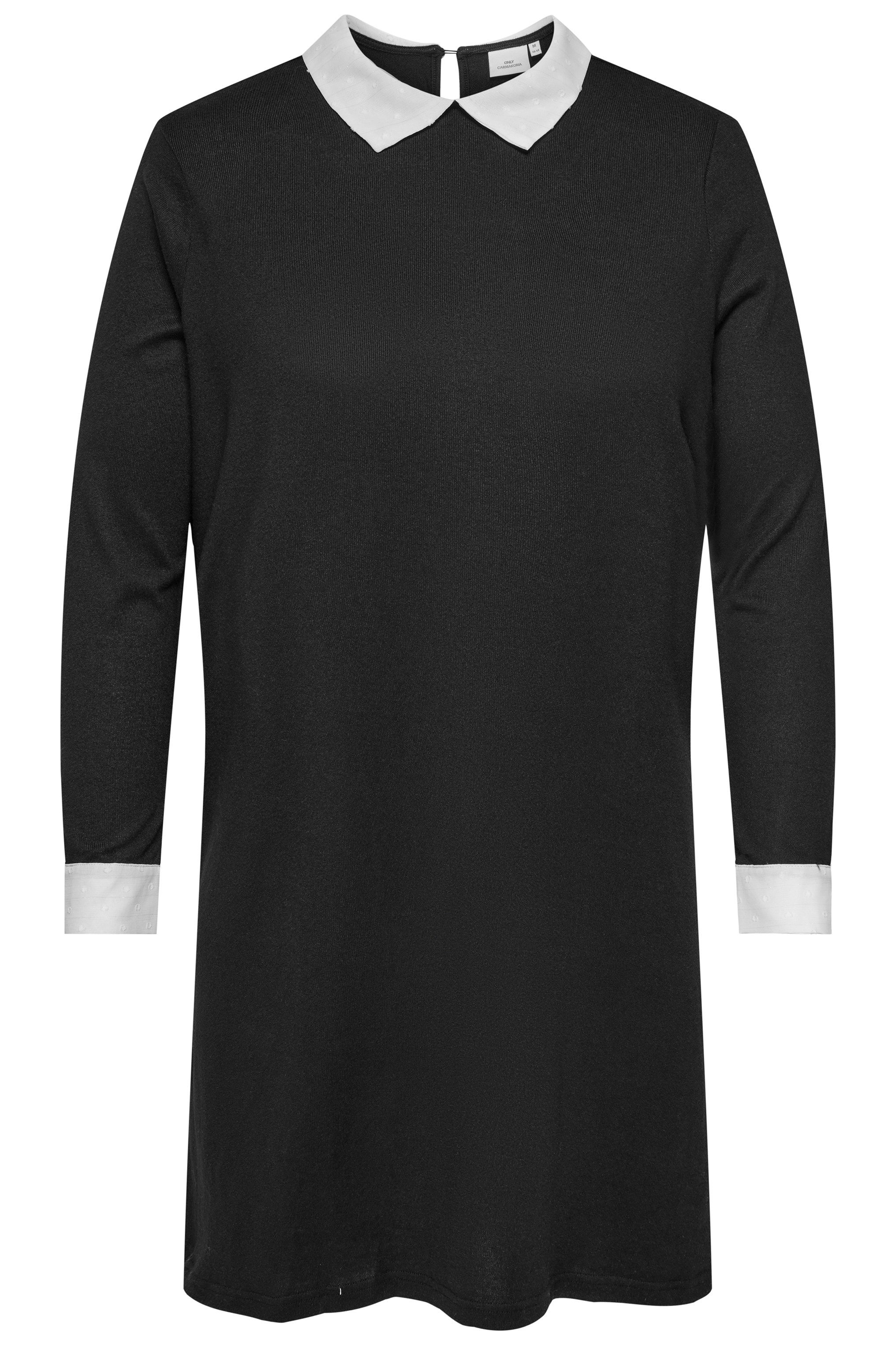 ONLY Carmakoma jurk is gemaakt in een fijn breisel. Je hebt de keuze uit een zwarte kraag, deze heeft een fijn lurex draadje of een witte kraag en manchet, deze heeft een popcorn effect. Het kraagje sluit in de achterhals met een lusje en een knoopje. De jurk valt over de knie. Mooit te combineren met een legging of panty van Cette.