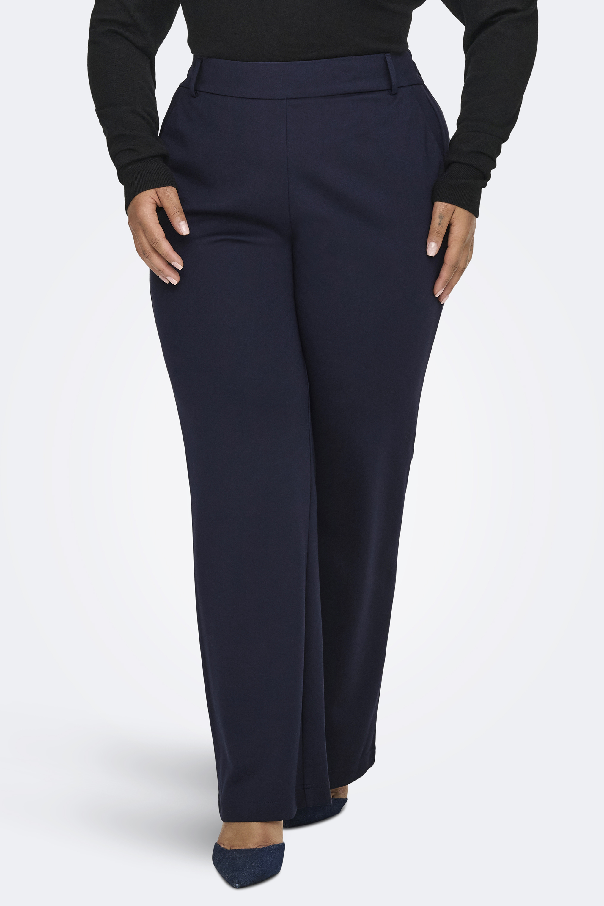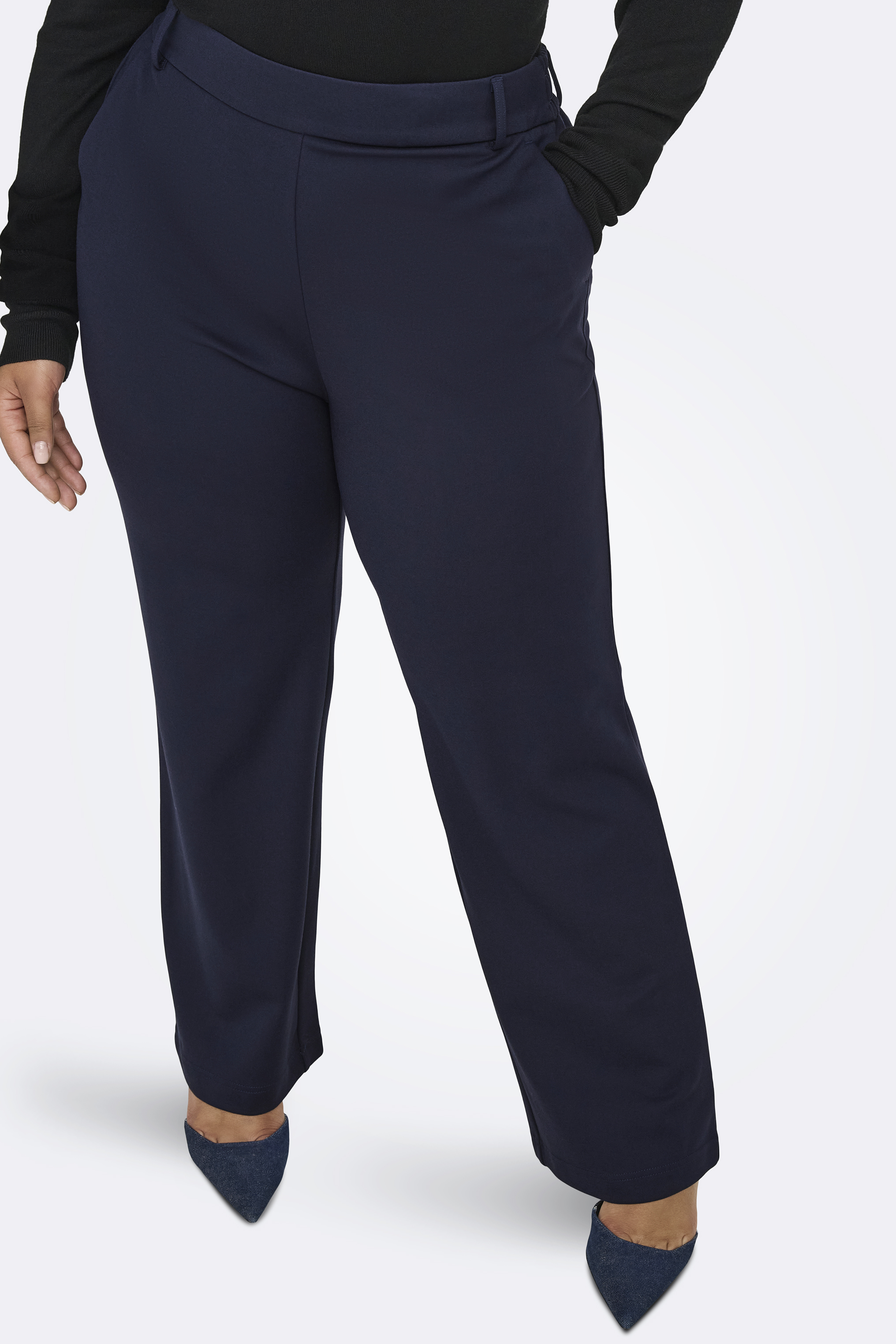 ONLY Carmakoma ECO broek is een halfwijd model met zakken in de zijnaad. Hij heeft een binnenbeenlengte van 32 inch. De broek is gemaakt in een mooie kwaliteit die fijn draagt. Het bomber jasje wat het model hierbij combineert is artikel 15326263.