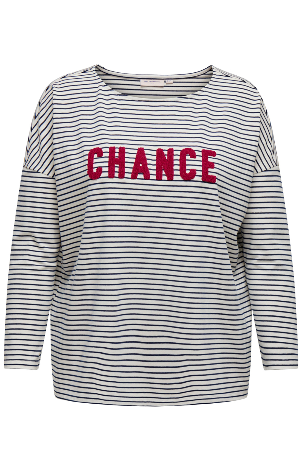 Shirt CARJADORE van ONLY Carmakoma is helemaal de trend van dit seizoen. Hij heeft afhangende mouwen en een ronde hals. Op de voorkant staat in rood de tekst Chance, deze is gemaakt in een fluffy materiaal. Hij  heeft een normale lengte en een iets loose fit pasvorm.. Altijd leuk bij een van de vele jeans uit de collectie van ONLY. ​Je vindt meer shirts in de categorie grote maten shirts.