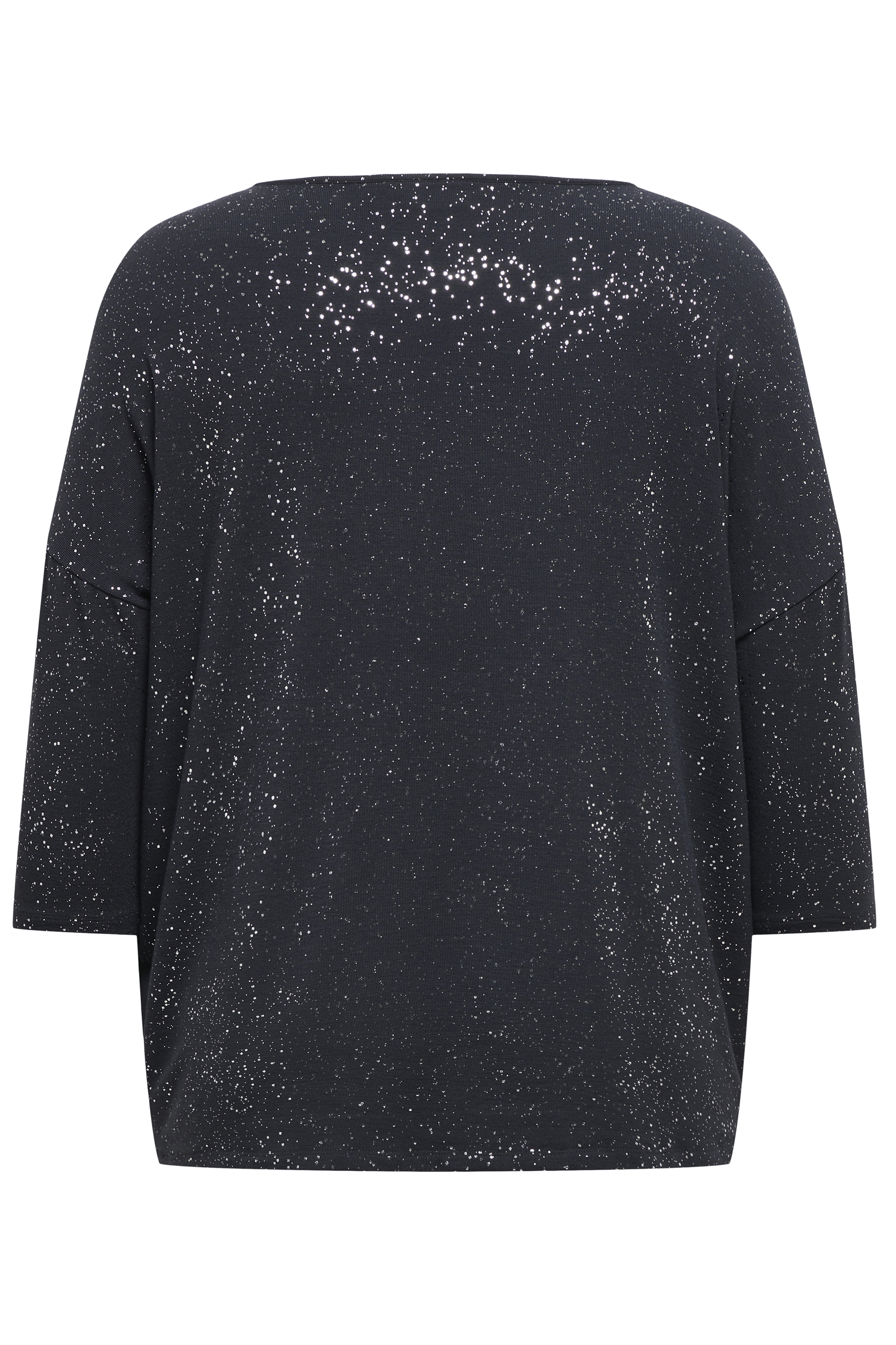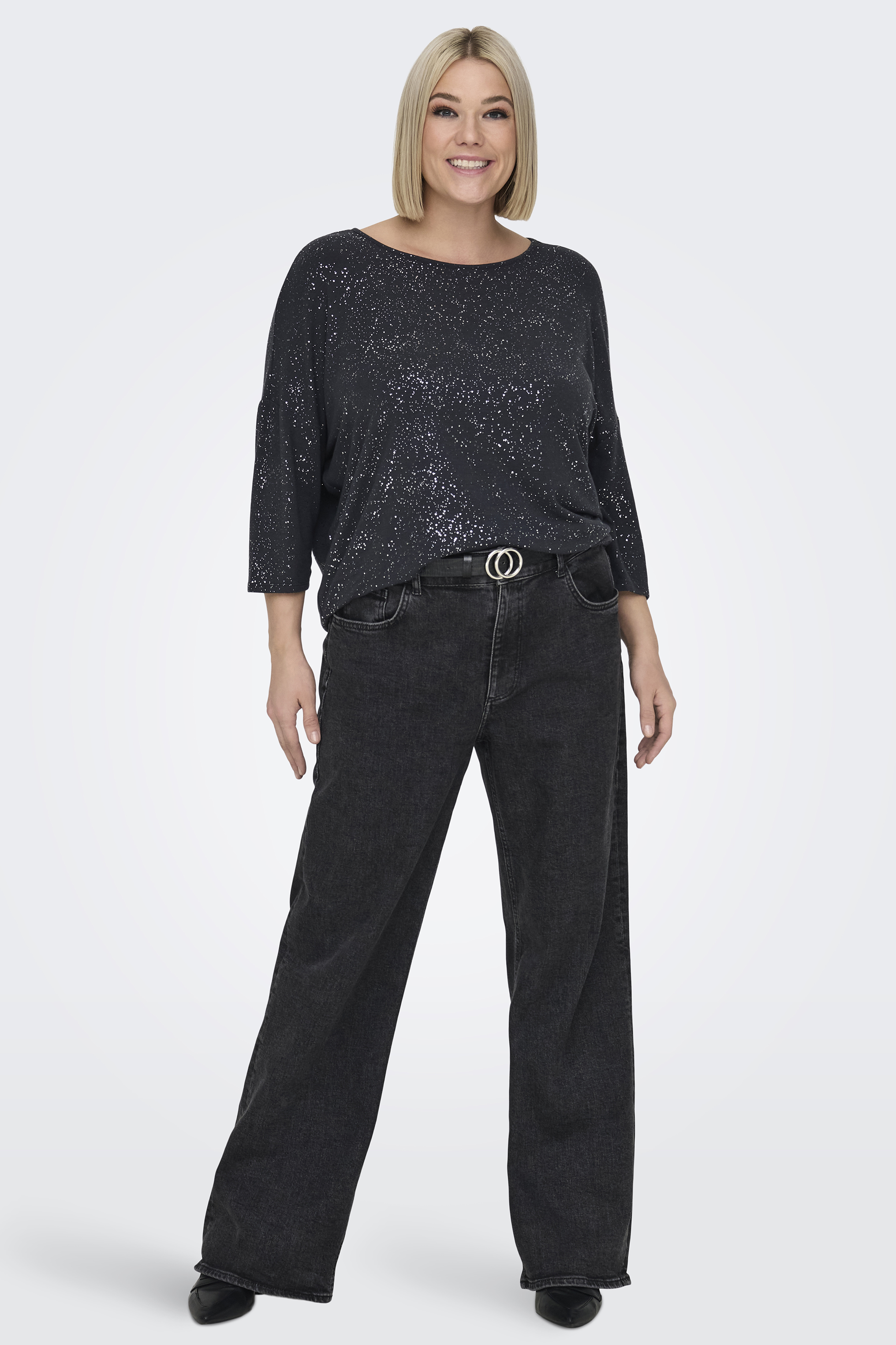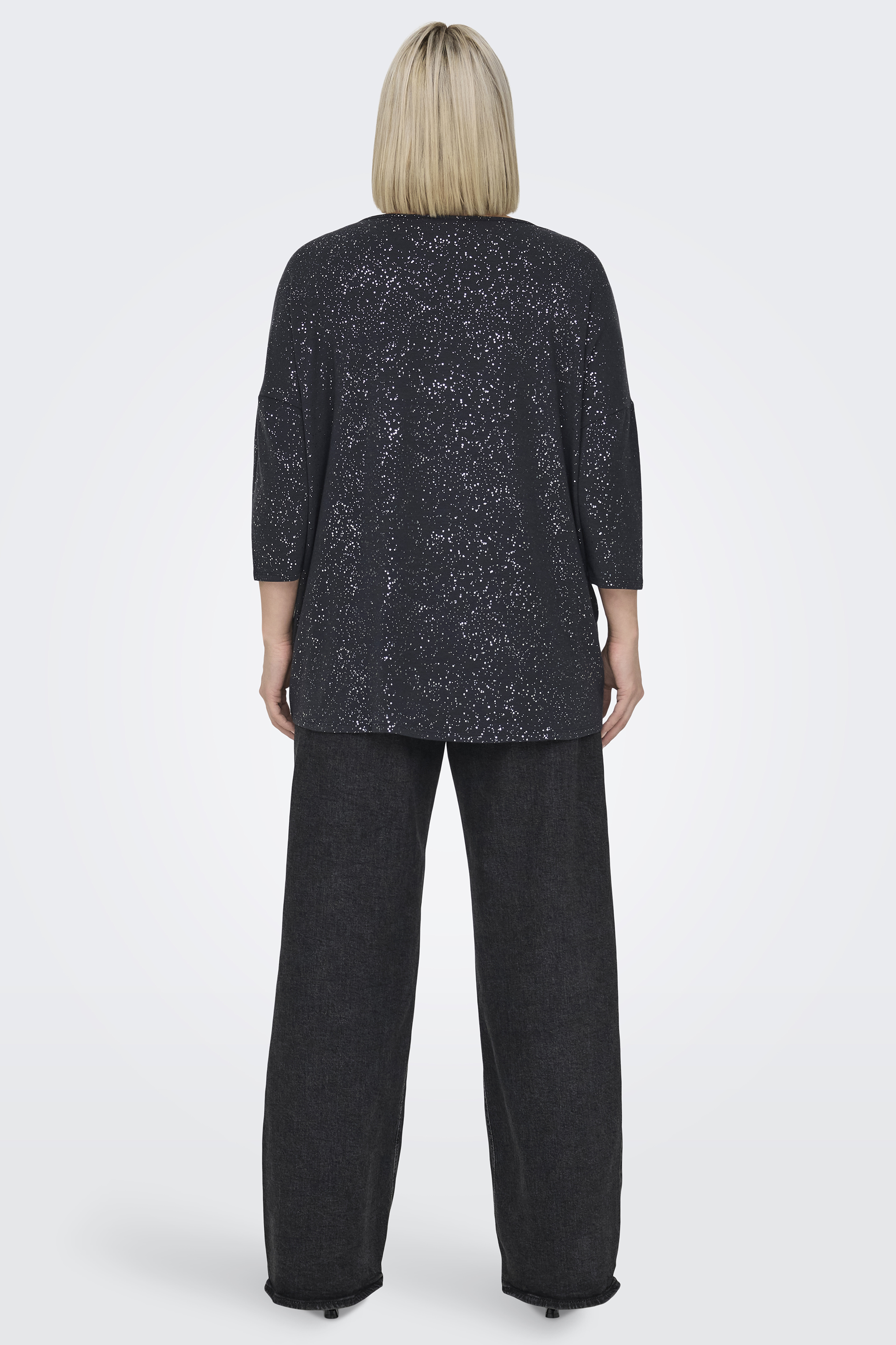 ONLY Carmakoma shirt CARFOILA  is een fijn breisel. Bij de donkerblauwe heeft hij een goudkleurige glitter en bij de zwarte een zilverkleurige glitter. Het is een rechtvallend model met aangeknipte driekwart mouwen van 55cm lang. Het model loopt naar onderen iets smaller toe.