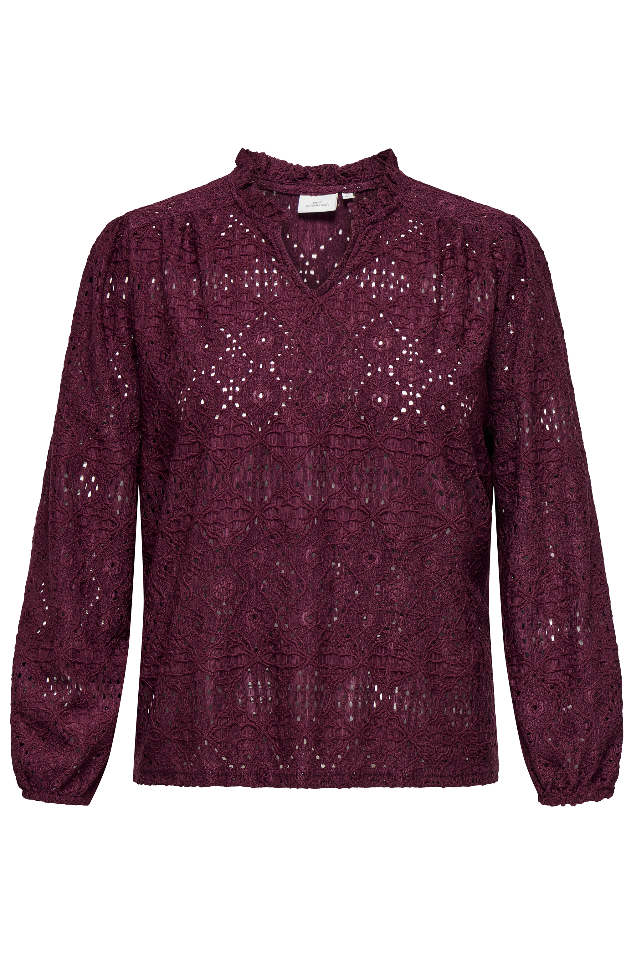 Prachtige blouse van Only Carmakoma in zwart en wijnkleur. De zachte stof is een opengewerkte stof met een mooi patroontje. Zeer geschikt voor de feestdagen met een mooie pantalon of jeans. Een mooie V-hals en een roezelrandje langs de hals. Een paar kleine plooitjes op de kop van de mooi zorgt voor een klein pof effect. Elastiek als zoom van de mouw.