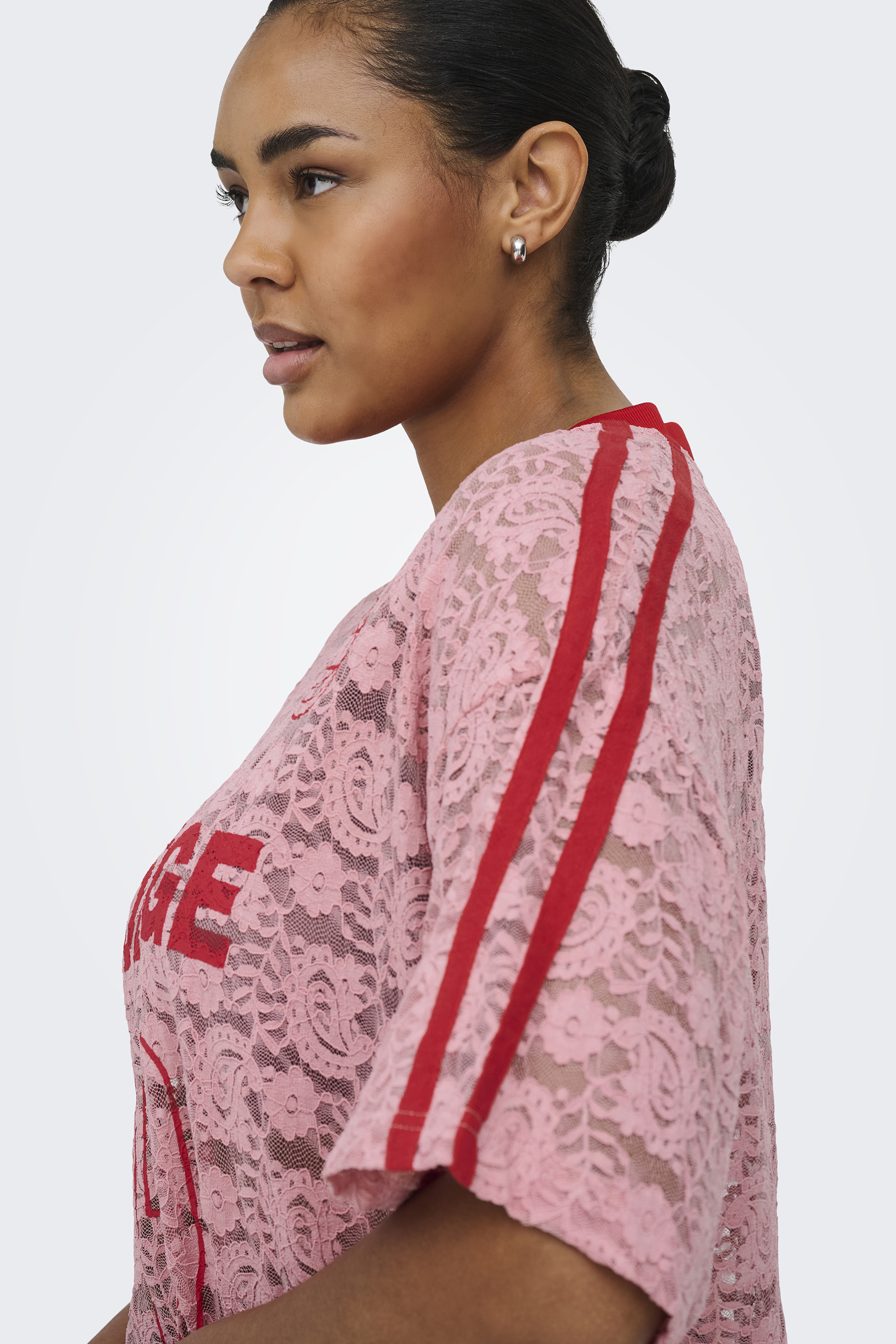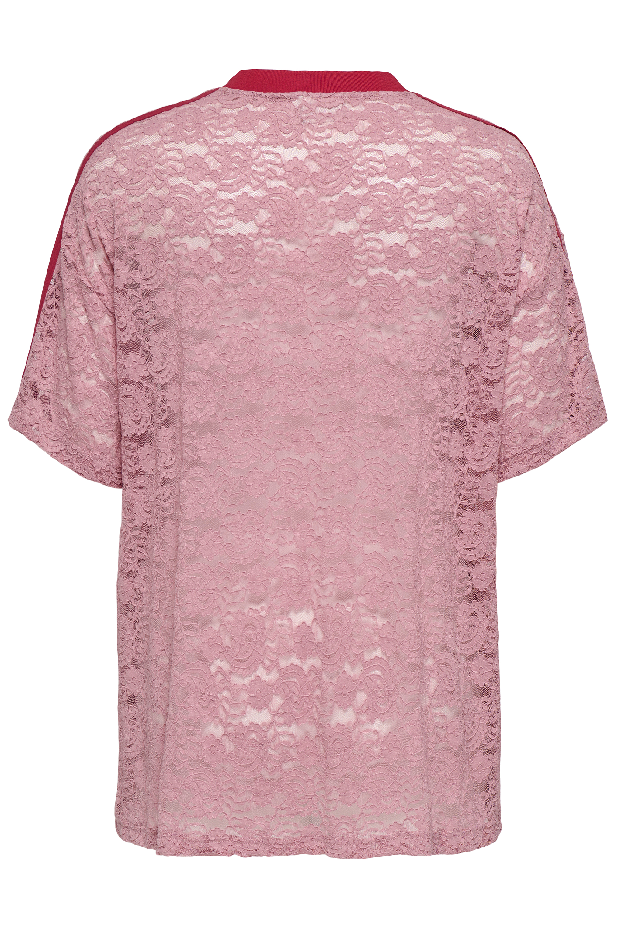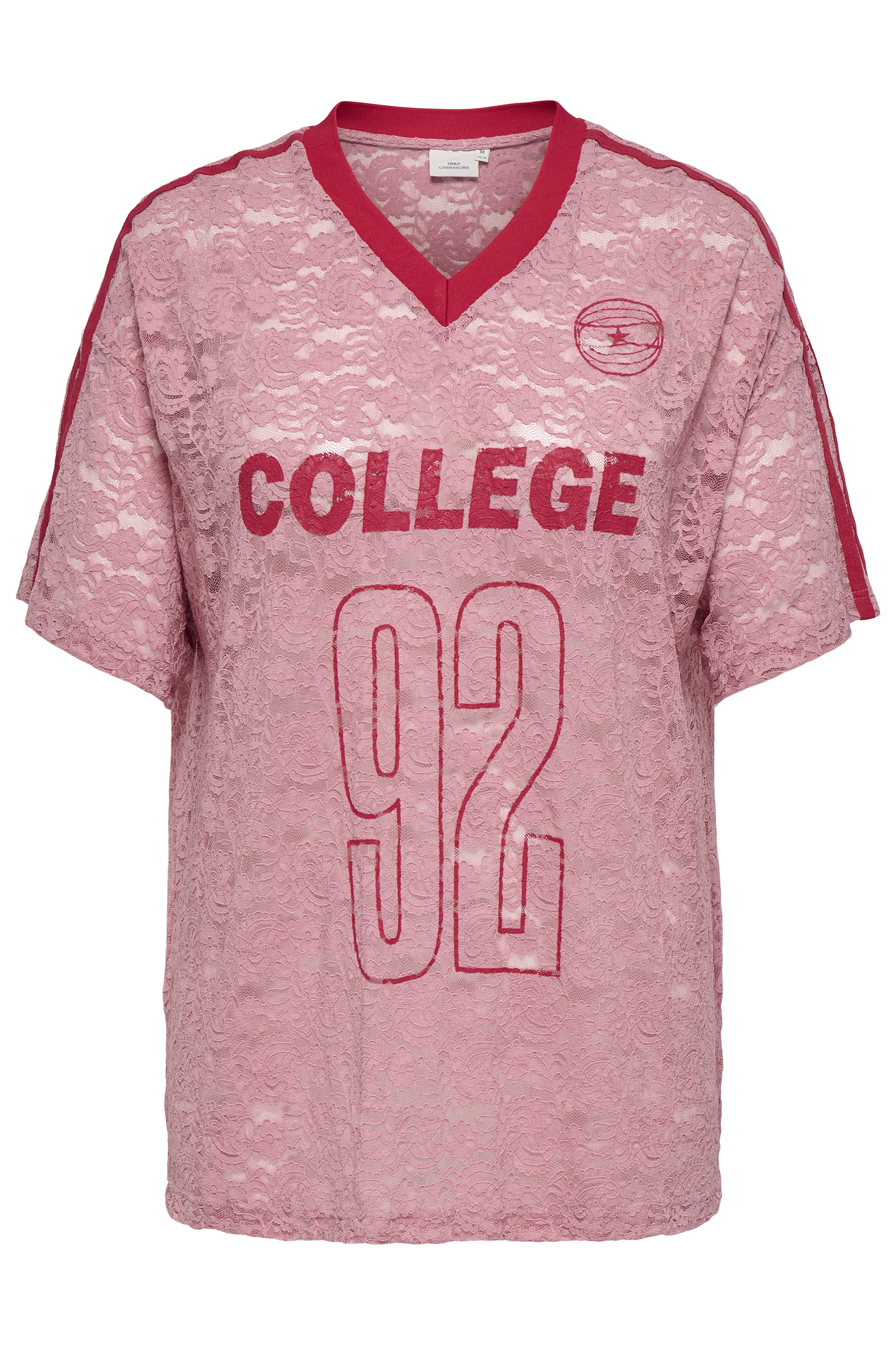 Dit opvallende T-shirt Carkia van ONLY Carmakoma is een echte eyecatcher. Het shirt is volledig uitgevoerd in transparant roze kant met bloemenmotief, wat zorgt voor een vrouwelijke en trendy uitstraling. Op de voorkant bevindt zich een rode print van cijfers en letters die mooi contrasteert met het kant, terwijl de rode streep op de mouwen een sportieve touch toevoegen.