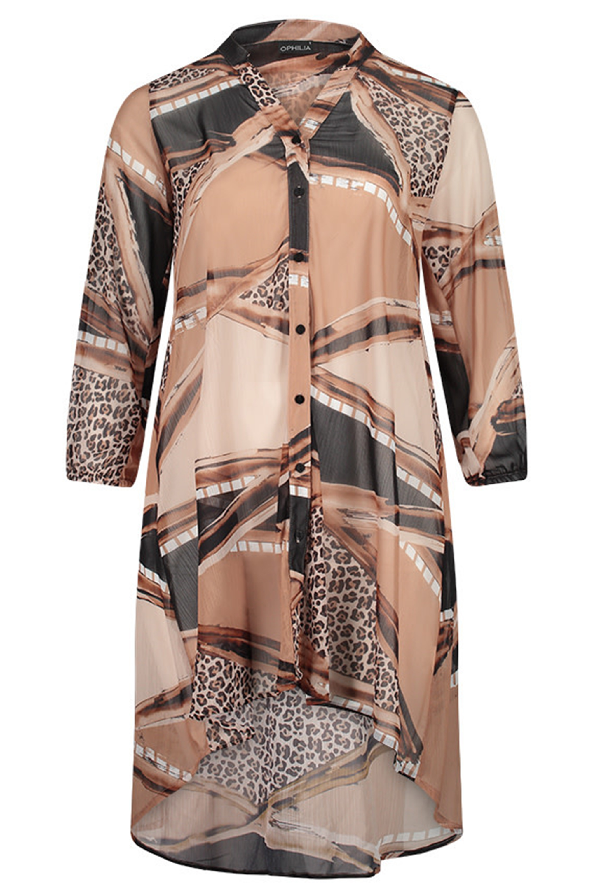 Ophilia blouse Noor chiffon dessin is een wat langer model met een V halsen rondlopend boordje. Hij sluit met knoopjes tot onderaan. De lange mouwen hebben een elastiekje in de zoom. de vooraknt van de blouse is korter dan de achterkant, geeft een leuk effect. Leuk te combineren met de leatherlook legging Suna 21W nap.
