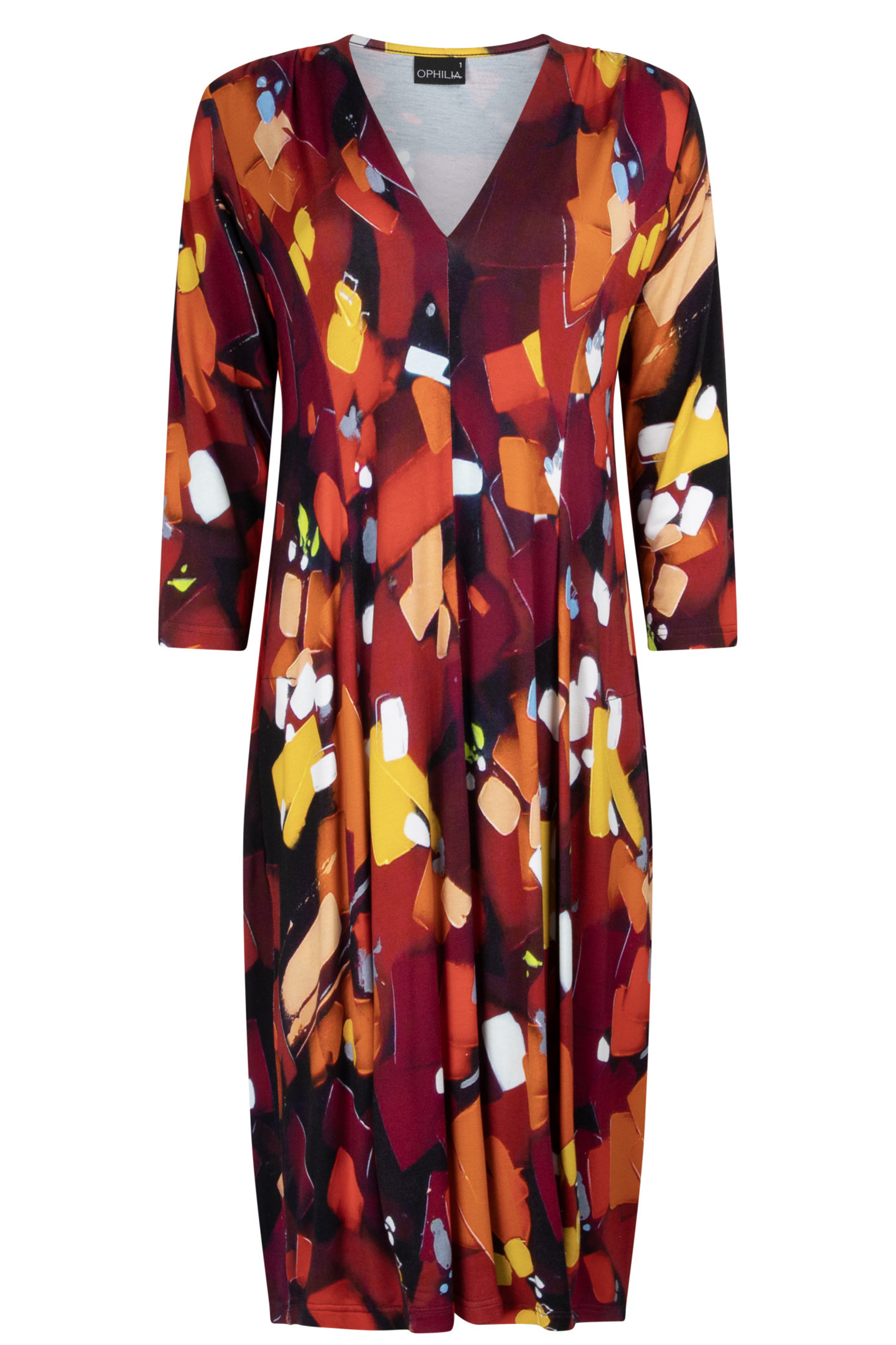 Ophilia jurk Ivy jersey dessin heeft een V hals en driekwart mouwen. De jurk is iets getailleerd aan de bovenkant en heeft een bolling rond de heupen. Hij valt over de knie en in de zijnaad zitten steekzakken.