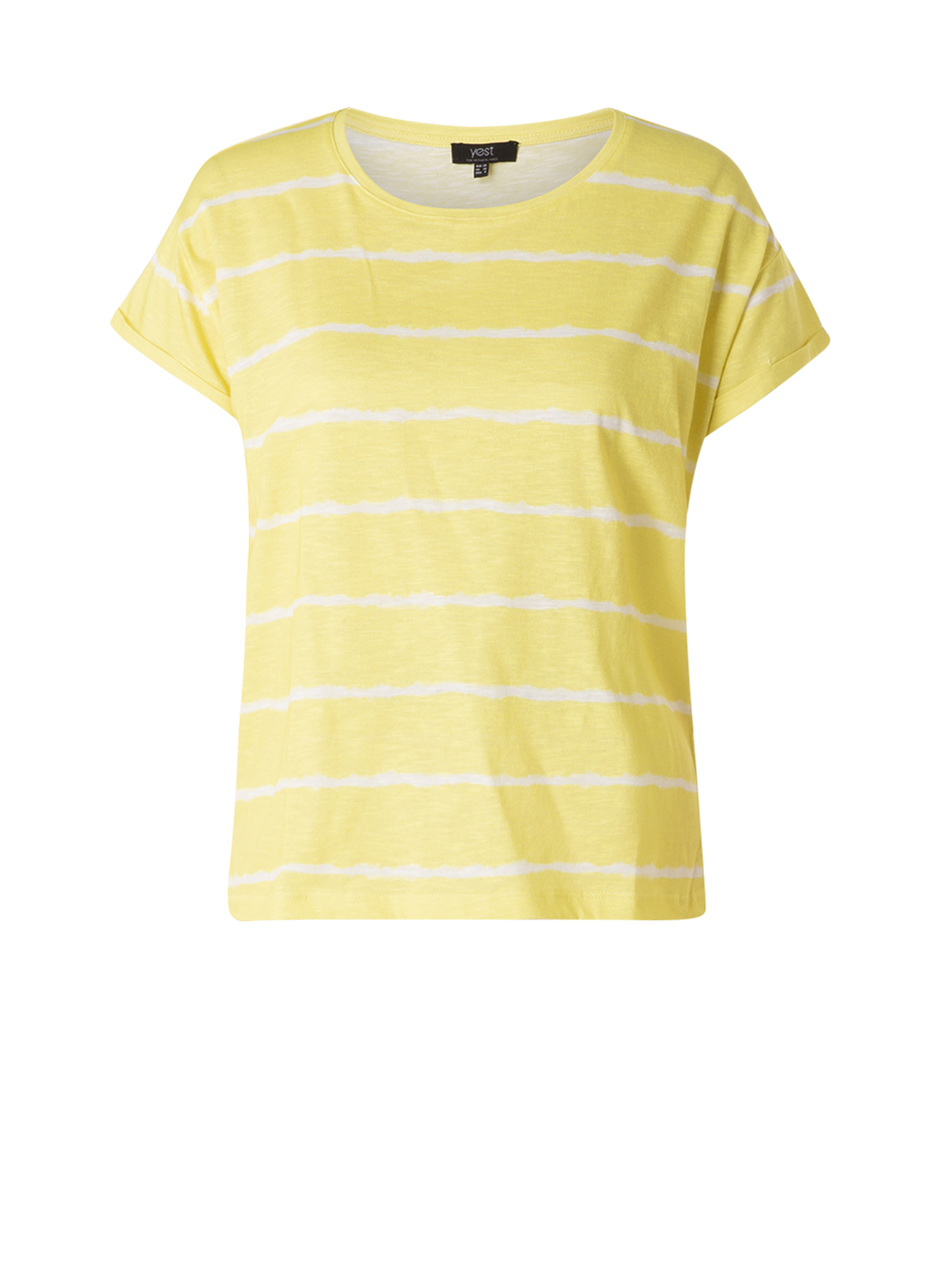 Vlot shirt voor de zomerse dagen. Dit shirt van Yesta heeft een klein wit streepje. Het shirt heeft een ronde hals en korte mouwen. Het shirt valt iets langer.