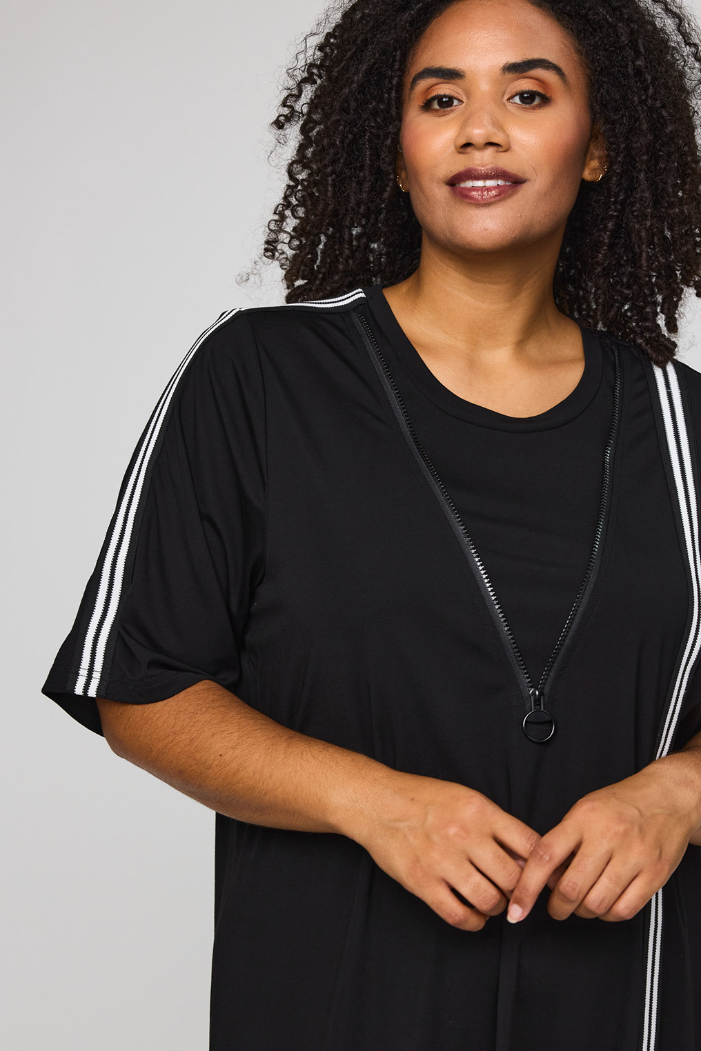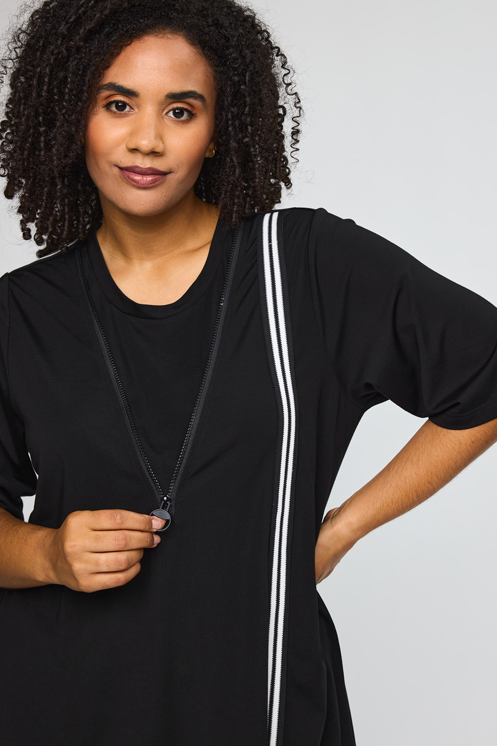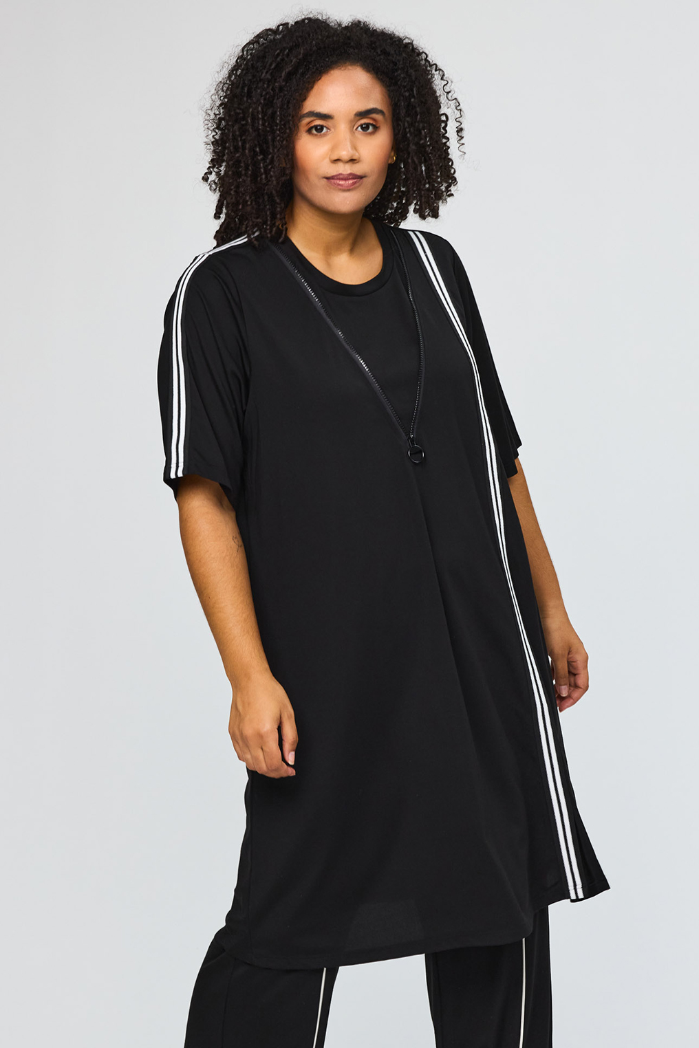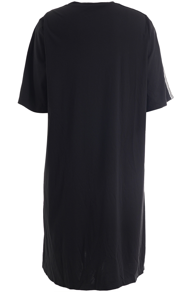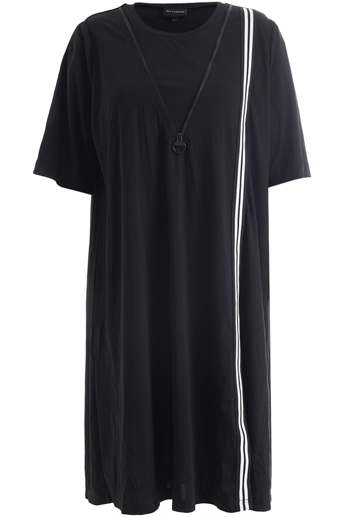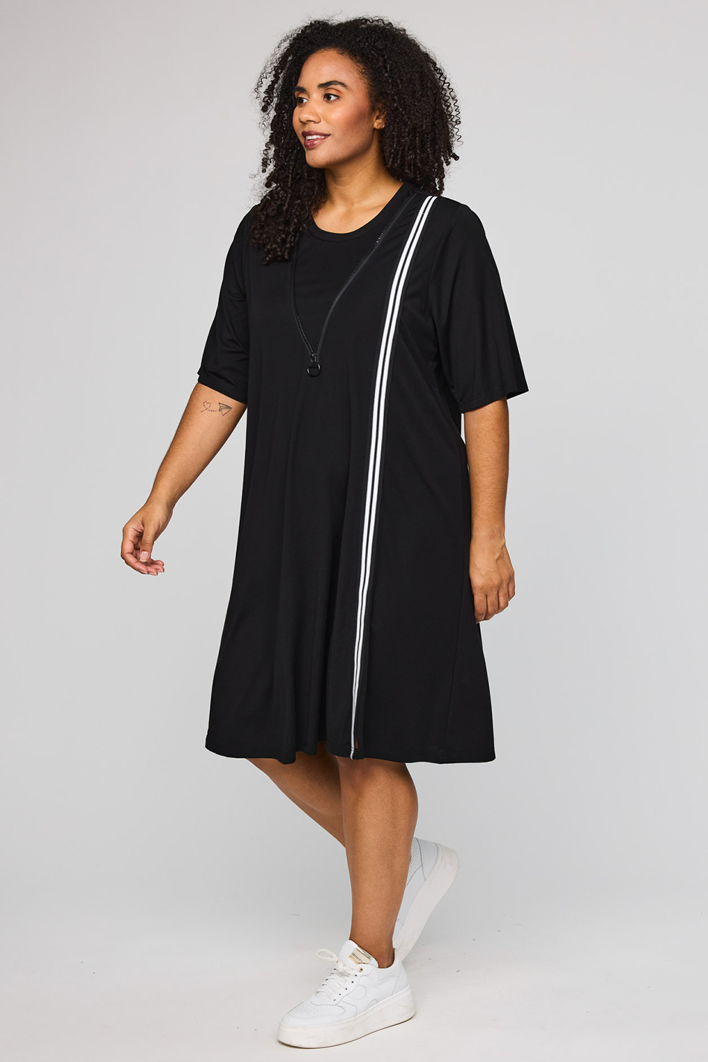 De verticale contrasttape zorgt voor een krachtig lijnenspel en geeft het ontwerp een eigentijdse touch. Tegelijkertijd werkt de verticale lijn subtiel verlengend, wat deze jurk extra geschikt maakt voor dames met een grotere maat. De ronde halslijn en korte mouwen zorgen voor een tijdloze en veelzijdige uitstraling die gemakkelijk te combineren is met zowel sneakers als sandalen of een elegante hak.