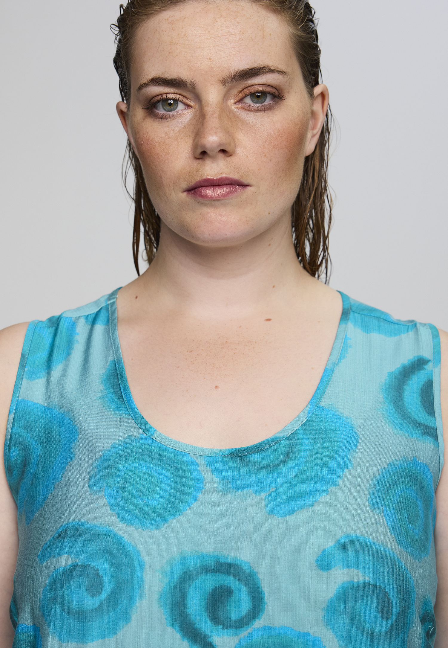 De Idun jurk van het merk Studio is een comfortabele en stijlvolle lange jurk met een allover blauw/groene print. De jurk is mouwloos en heeft een U-hals, wat zorgt voor een mooie en open halslijn. De jurk valt soepel langs het lichaam en draagt heerlijk luchtig.