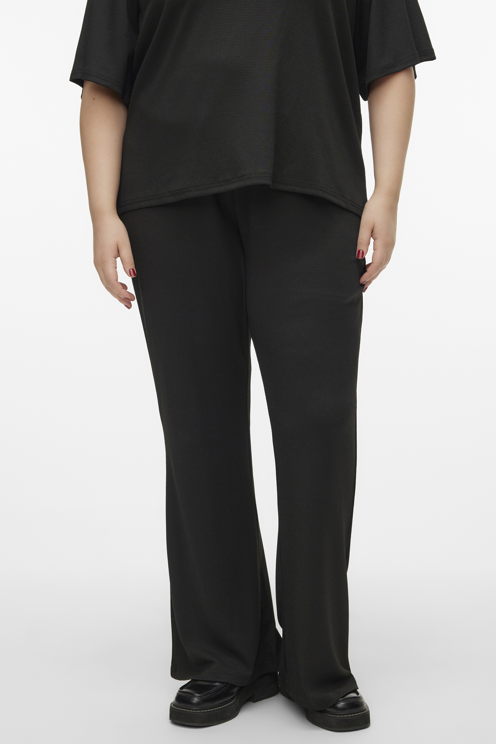 VERO MODA Curve Flared broek ECO is gemaakt in een glitter stof met veel rek. Het is een rondom elastiek model, zonder zakken. Je kunt de broek combineren met de bijpassend shirts 10318156 met V hals of de 10297986 met ronde hals.