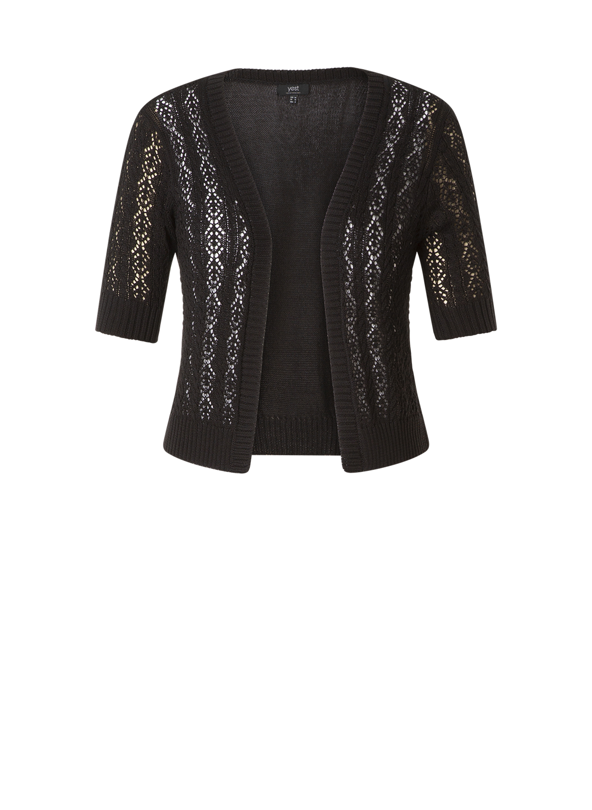 Kort model vestje van Yest model Kamila. Het is een losvallend model in een ajour breisel. Het heeft korte mouwen.