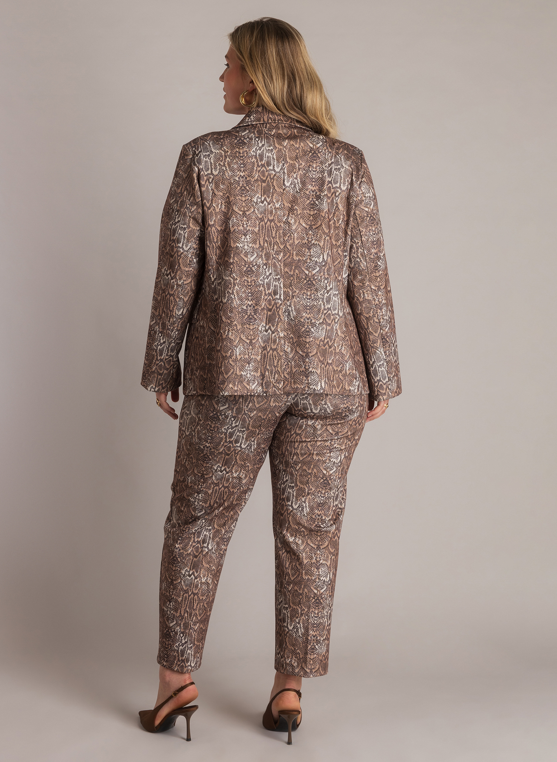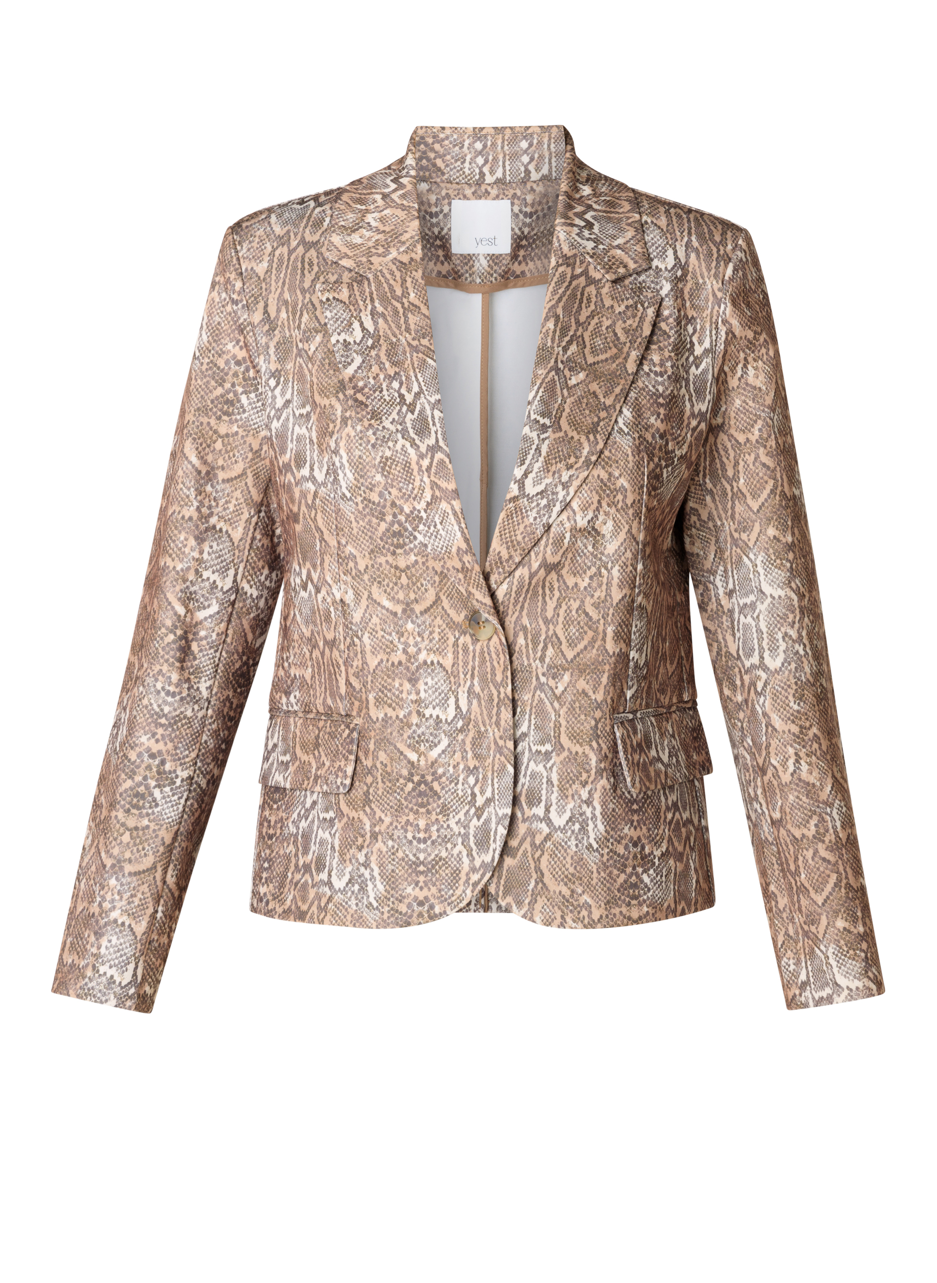 Deze blazer is een echte eyecatcher. De soepele stretchstof zit heerlijk en behoudt mooi zijn vorm. De snakeprint geeft een speelse, krachtige uitstraling, terwijl de single-button sluiting zorgt voor een rustige, verzorgde look. De blazer is ongevoerd en licht van gewicht, waardoor hij fijn draagt en makkelijk te combineren is voor outfits die net dat beetje extra mogen hebben.