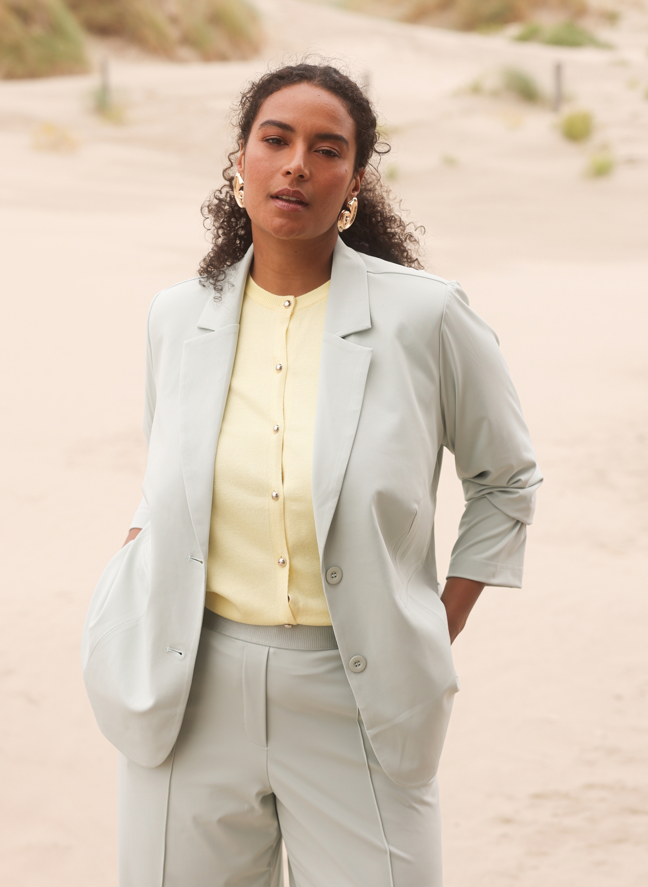 Bent u op zoek naar een kledingstuk dat elegantie en ultiem gebruiksgemak combineert? Deze slimfit blazer van het merk Yest Curve in de kleur pastel green is een absolute aanwinst voor uw garderobe. De blazer is gemaakt van een hoogwaardige travelkwaliteit, bestaande uit 75% polyamide en 25% elastaan, waardoor het artikel kreukvrij, ademend en sneldrogend is. Dit maakt de blazer bij uitstek geschikt voor zowel een drukke werkdag als een stijlvol avondje uit binnen de wereld van de plus size mode.