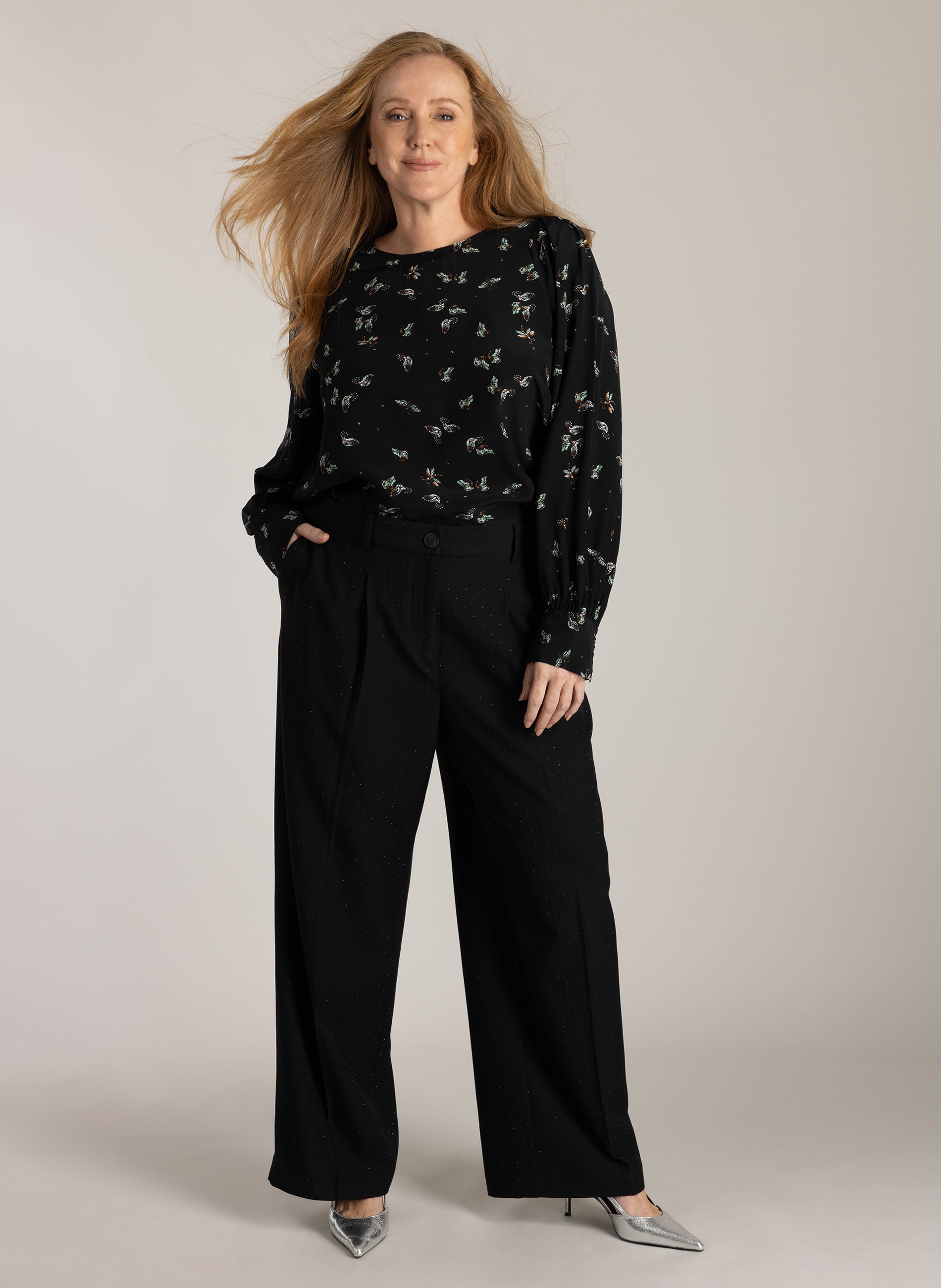 • Opvallende details: Ballonmouwen, klein knoopje achter in de hals, soepel vallende stof