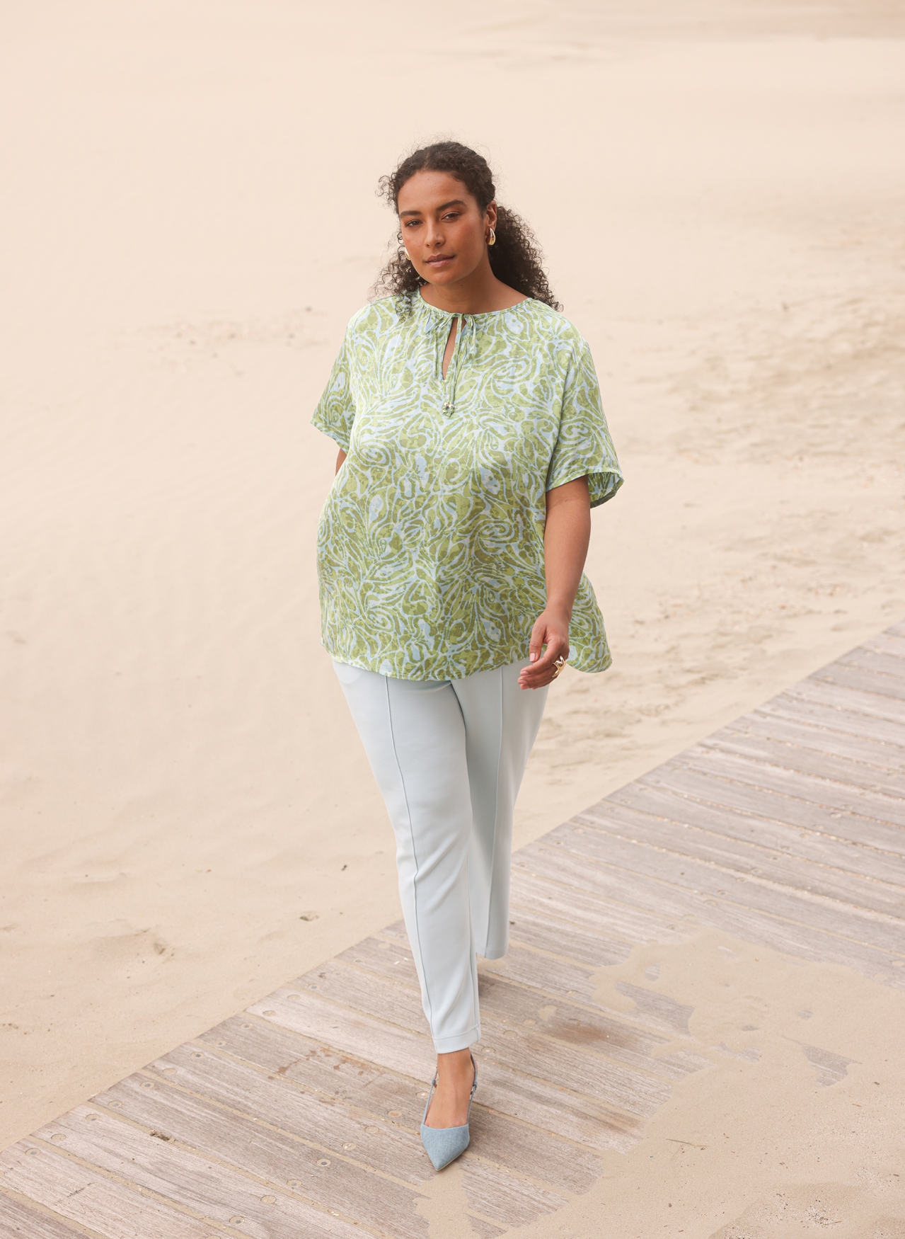 Deze blouse van Yest Curve is gemaakt van 100% viscose, waardoor de stof dun, zacht en heerlijk luchtig aanvoelt op de huid. Het model heeft een normale pasvorm die soepel om het lichaam valt, wat kenmerkend is voor kwalitatieve plus size mode. De elegante V-hals is voorzien van handige koordjes, wat het ontwerp een nonchalante en moderne twist geeft. Met een lengte van 74 centimeter is deze blouse uitstekend te combineren met een jeans, short of een luchtige linnen broek. Of u nu een dagje gaat wandelen of een terrasje pakt, met deze blouse uit onze collectie grote maten kleding kiest u voor een easy-going top die altijd goed staat.