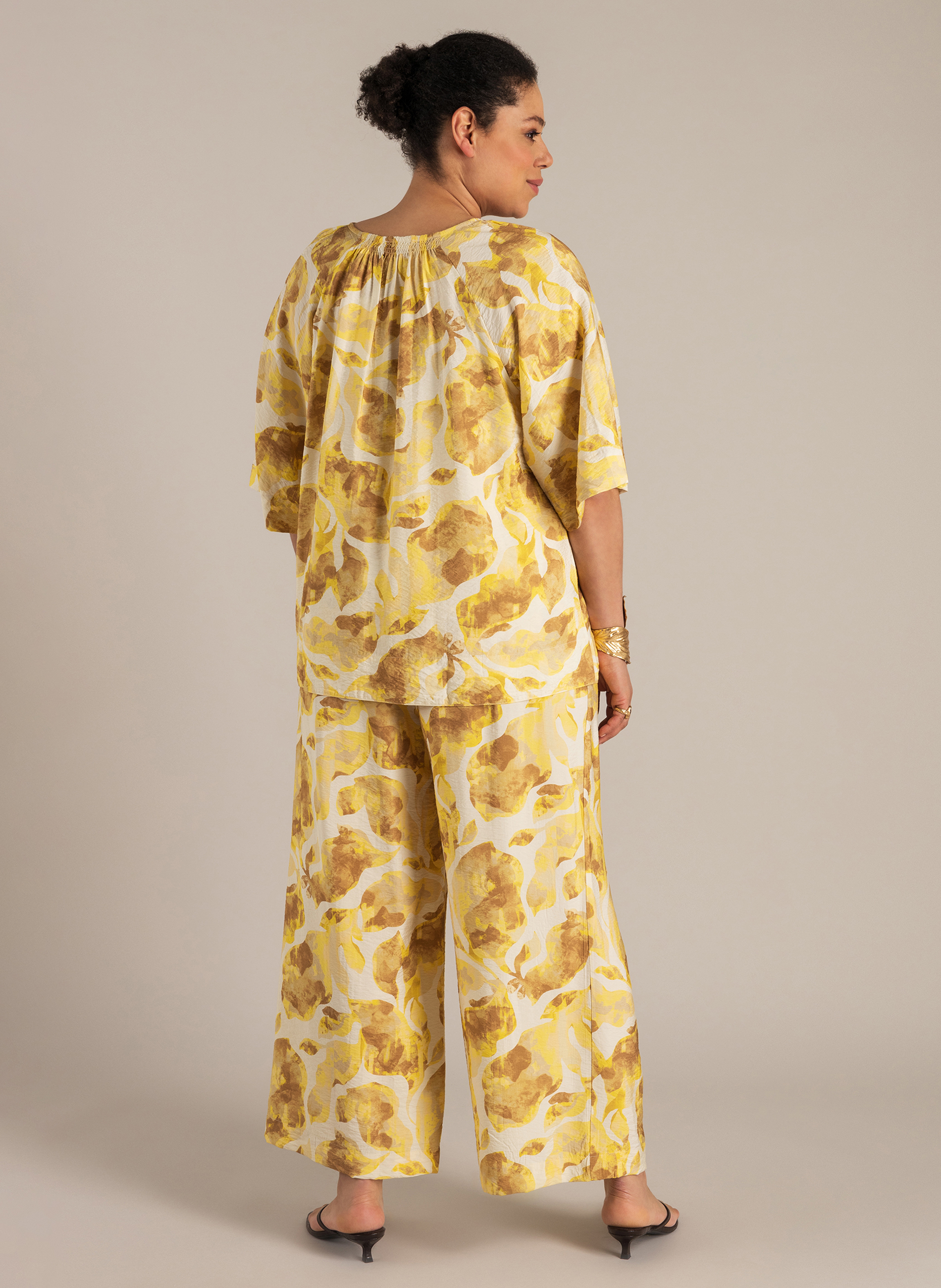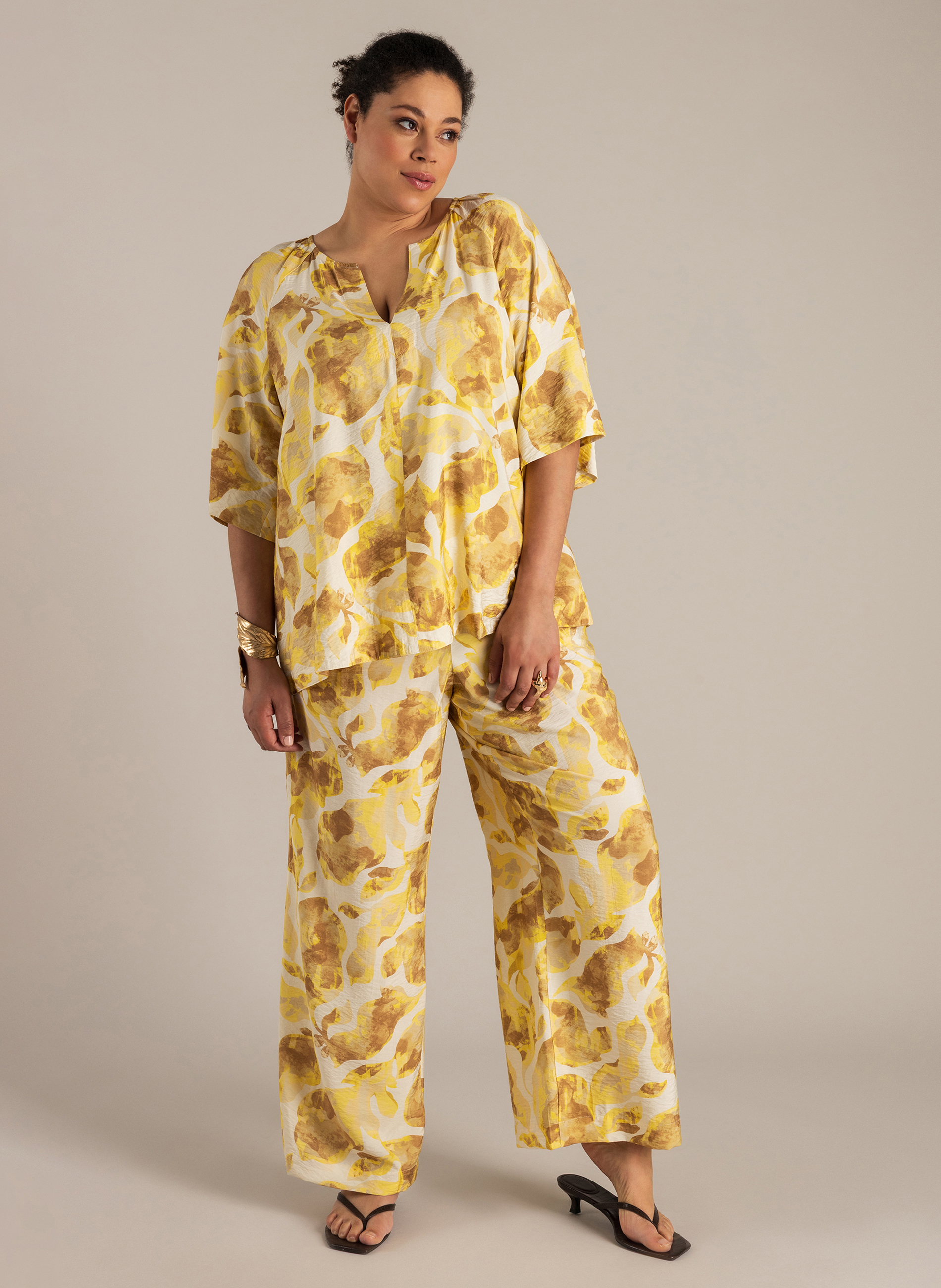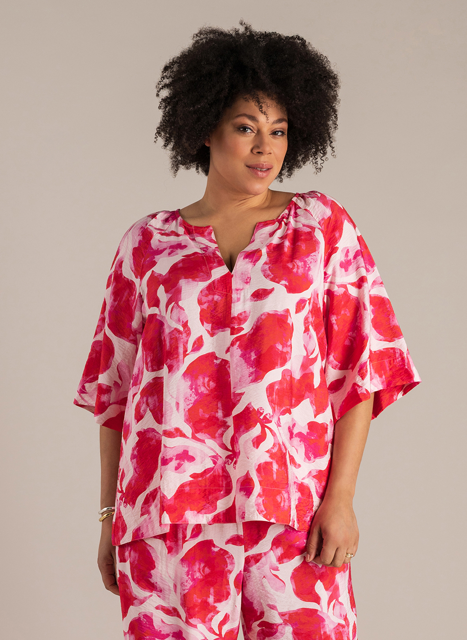 Dit is zo’n blouse die meteen opvalt door de print. De stof voelt licht aan en heeft een licht gekreukt effect, wat de blouse een nonchalante uitstraling geeft. De pasvorm is heerlijk los ('Loose Fit'), wat zorgt voor een comfortabel gevoel. Je kunt bij dit model kiezen tussen raffia geel of een meer uitgesproken bright pink.