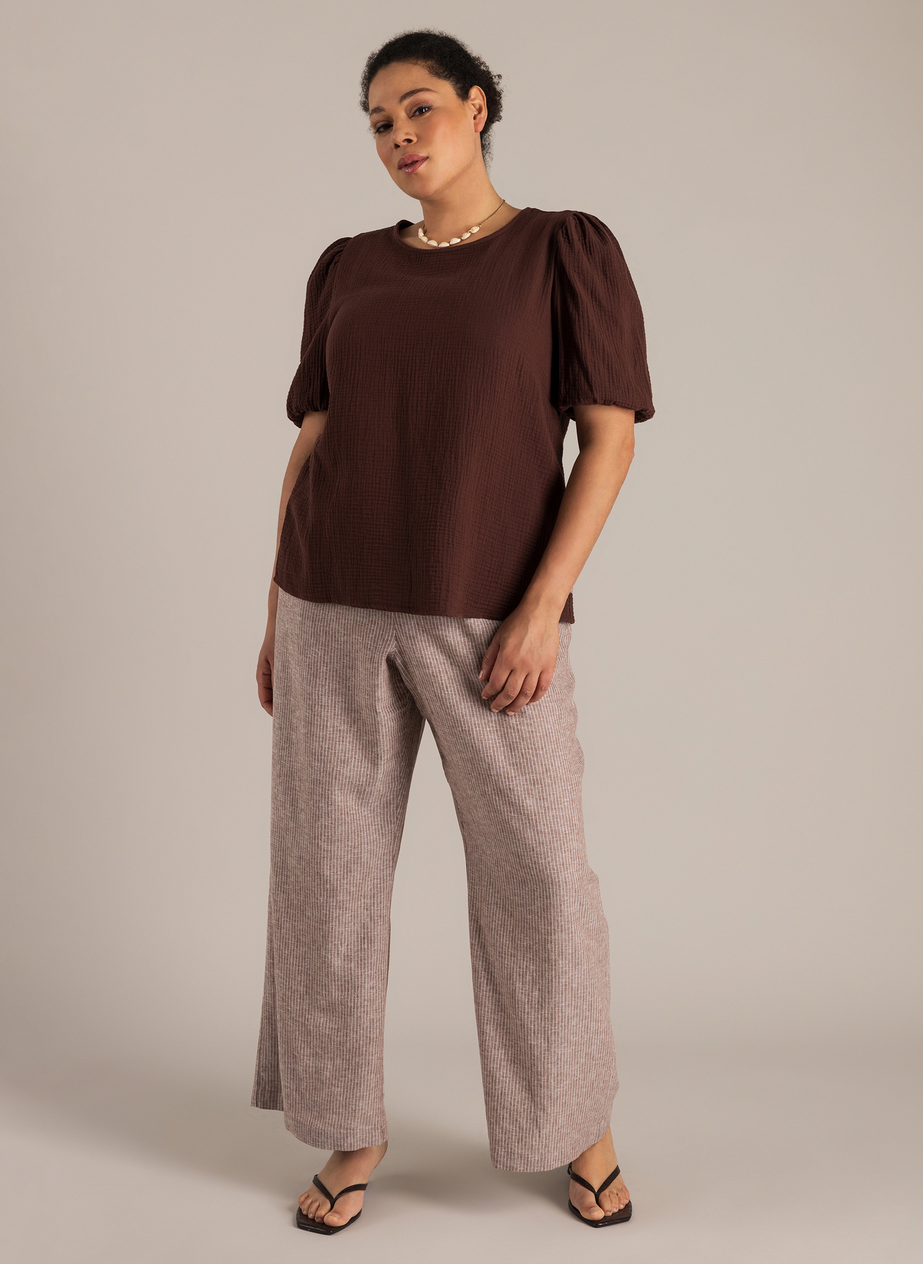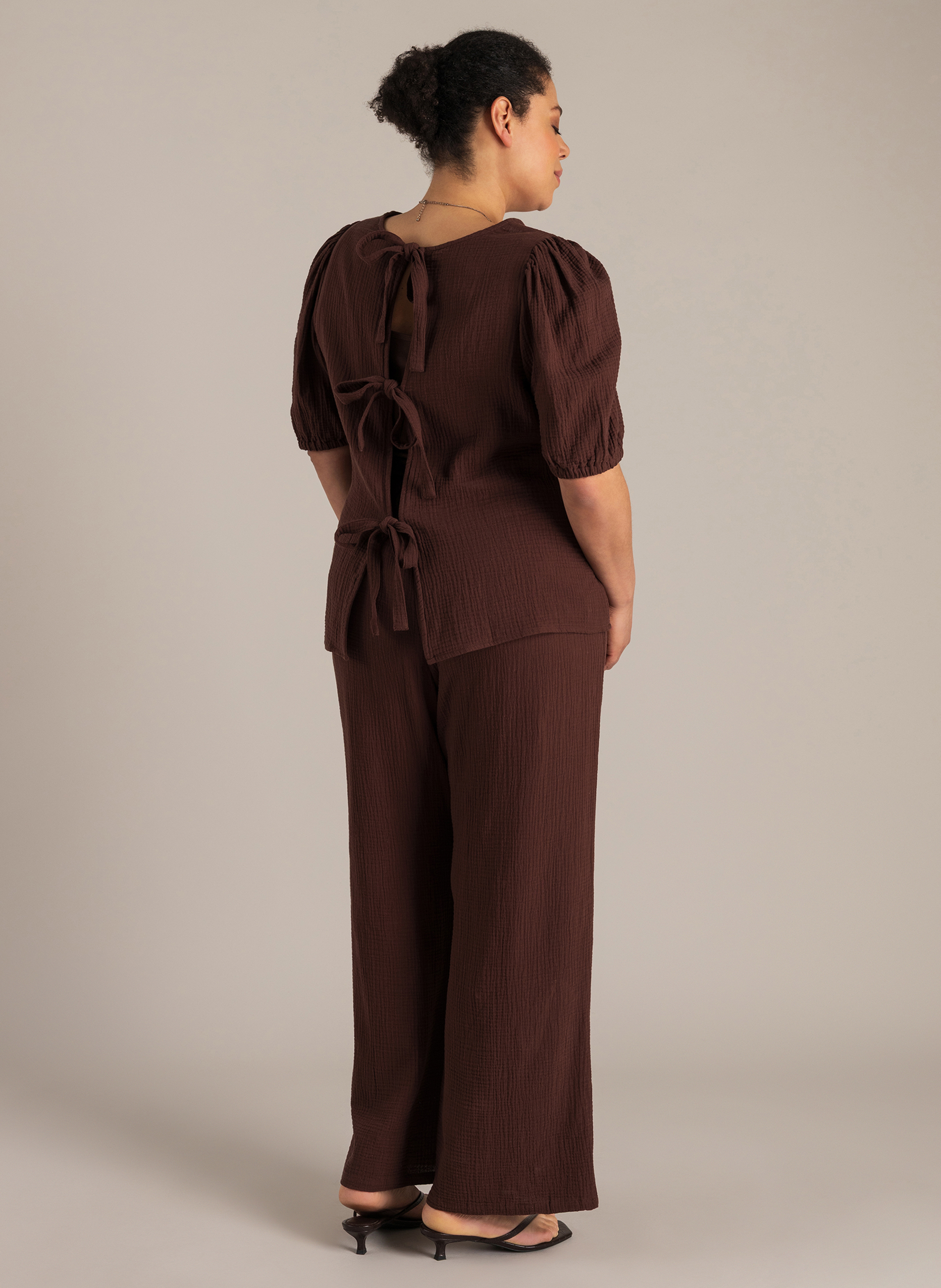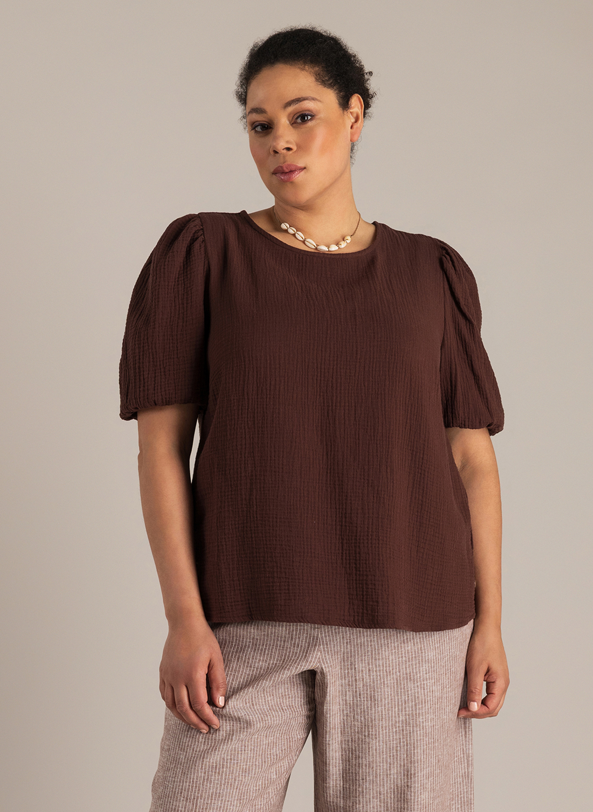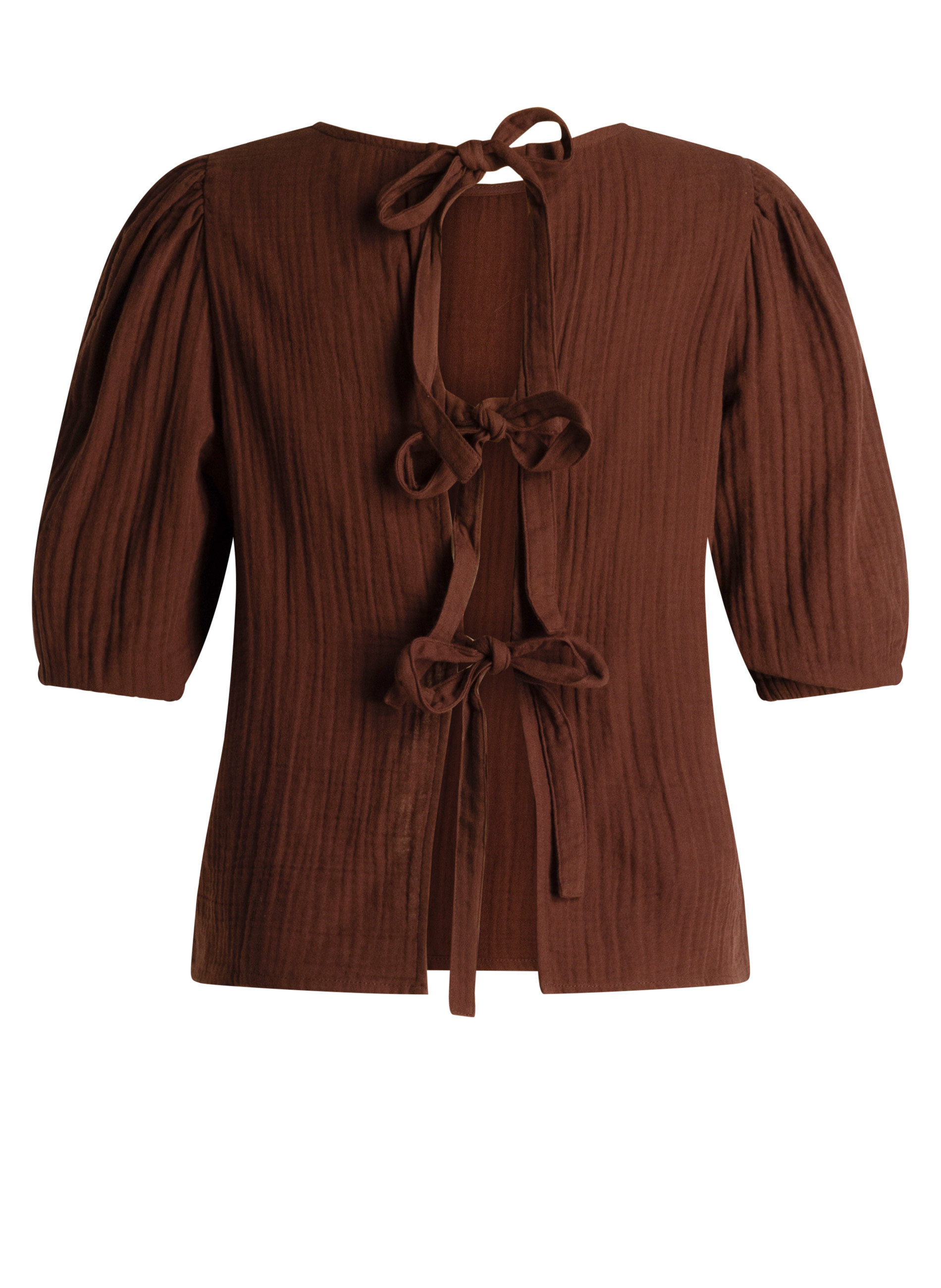 Een blouse met karakter, tot in de details. De wafelstof van 100% katoen voelt luchtig aan en geeft subtiele structuur. De striksluiting op de rug maakt ‘m bijzonder, en de donkerbruine kleur geeft ‘m een warme uitstraling.