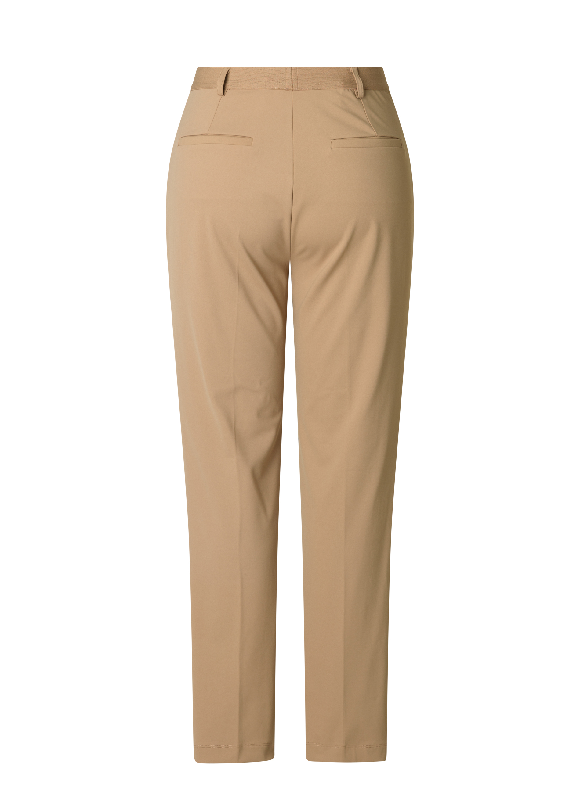 Het materiaal heeft een subtiele glans en een gladde afwerking, waardoor de broek er netjes uitziet zonder stijf aan te voelen. De pijpen vallen recht en los genoeg om beweging niet te beperken, maar behouden toch een verzorgd silhouet.