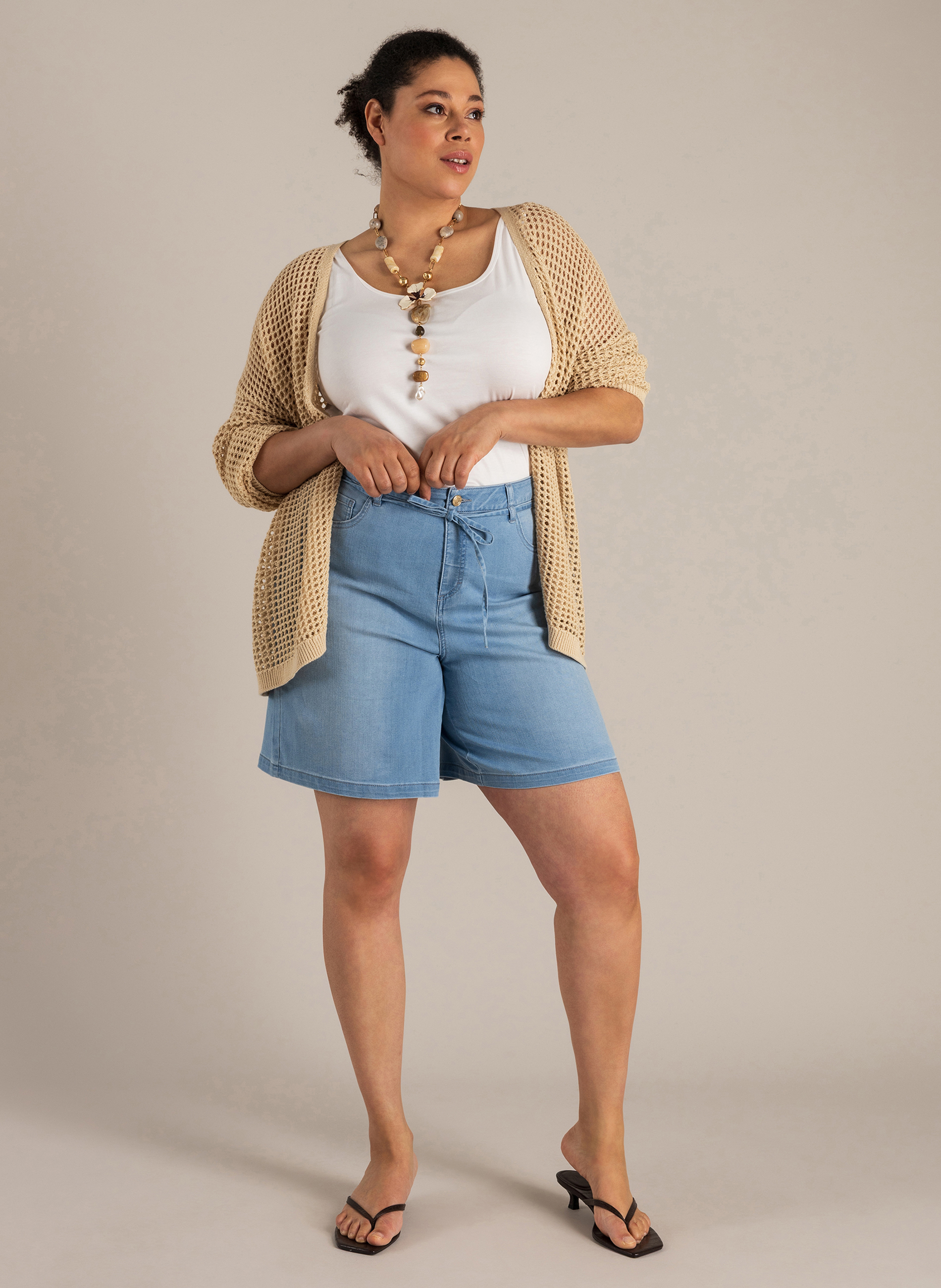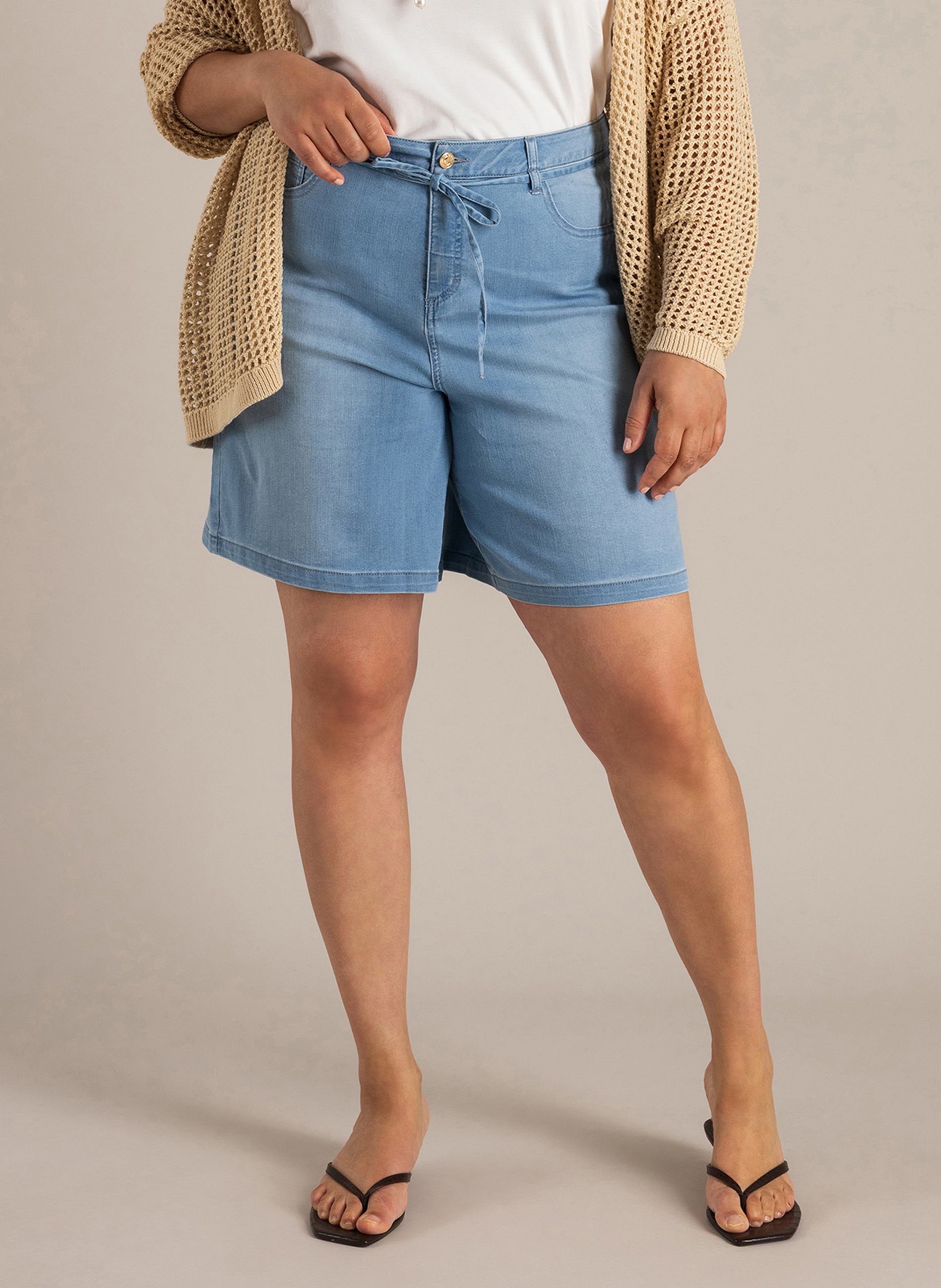 De broek is gemaakt van een stevige maar soepele spijkerstof, bestaande uit 73% katoen, 26% polyester en 1% elastane. Dit zorgt voor een lichte rek waardoor de broek mooi aansluit. Met een lengte van 9 inch vallen ze precies goed. De taille is voorzien van een praktisch koordje, waarmee je de broek naar wens kunt verstellen. Of je nu kiest voor een informele outfit of een nette look, met deze YEST CURVE shorts A006387 kies je voor stijlvolle grote maten kleding waar je je prettig in voelt. Combineer ze eindeloos en geniet van een fijne pasvorm.