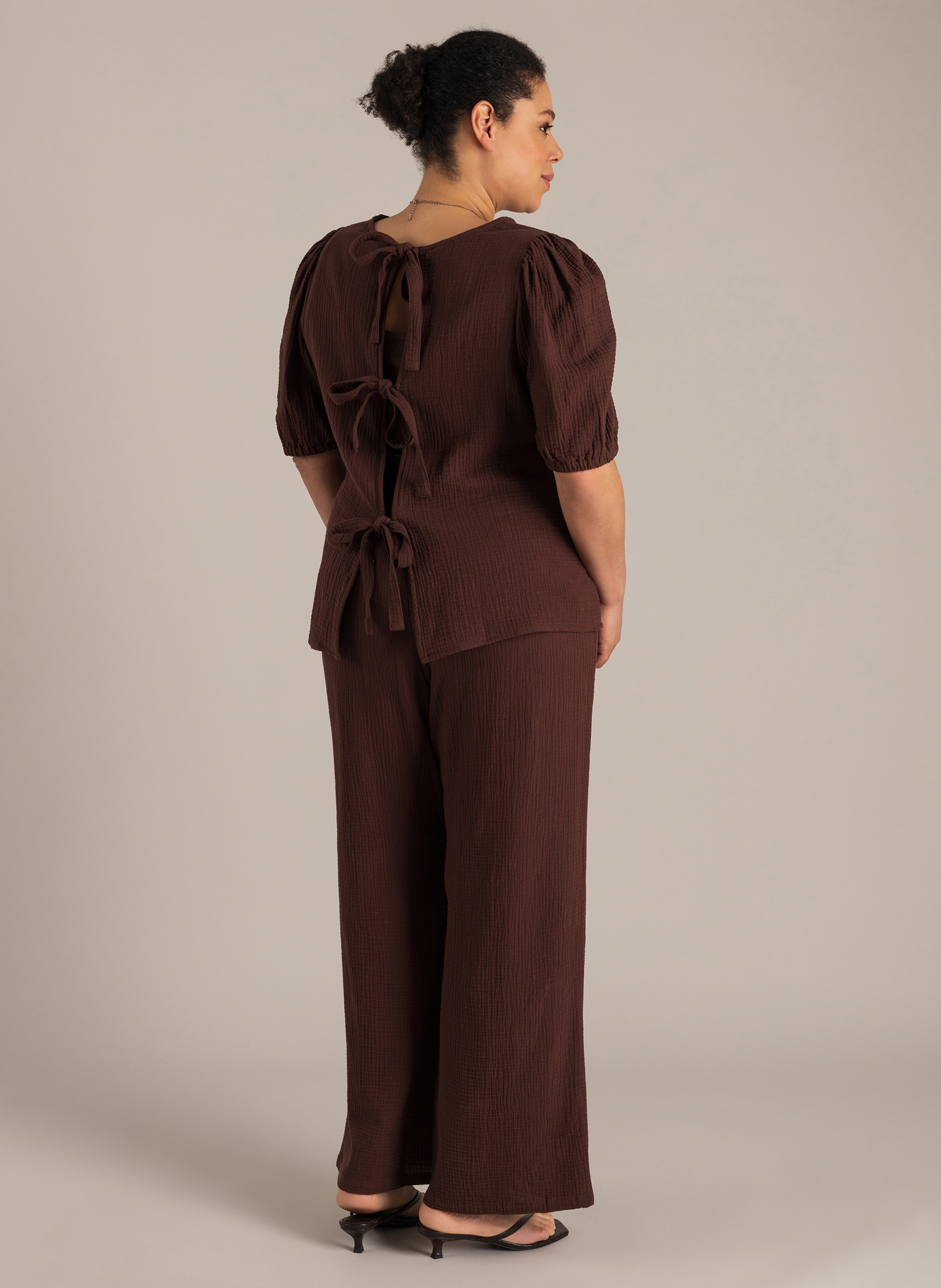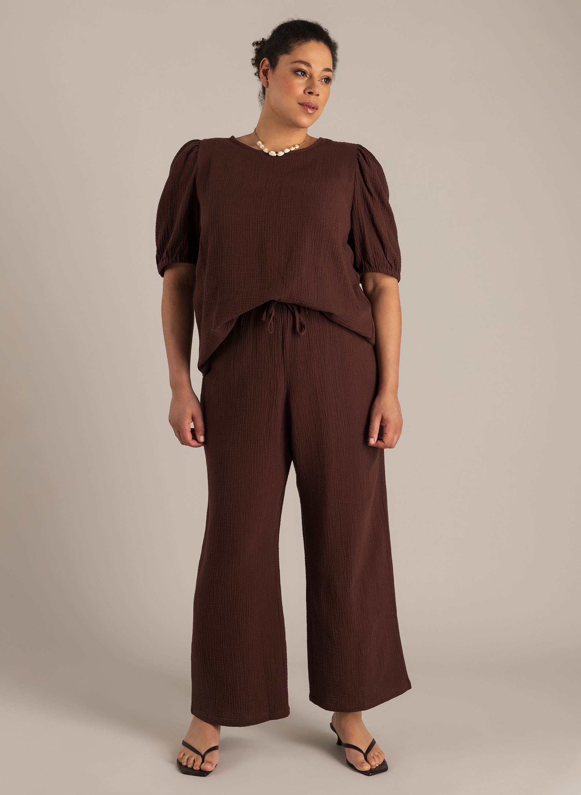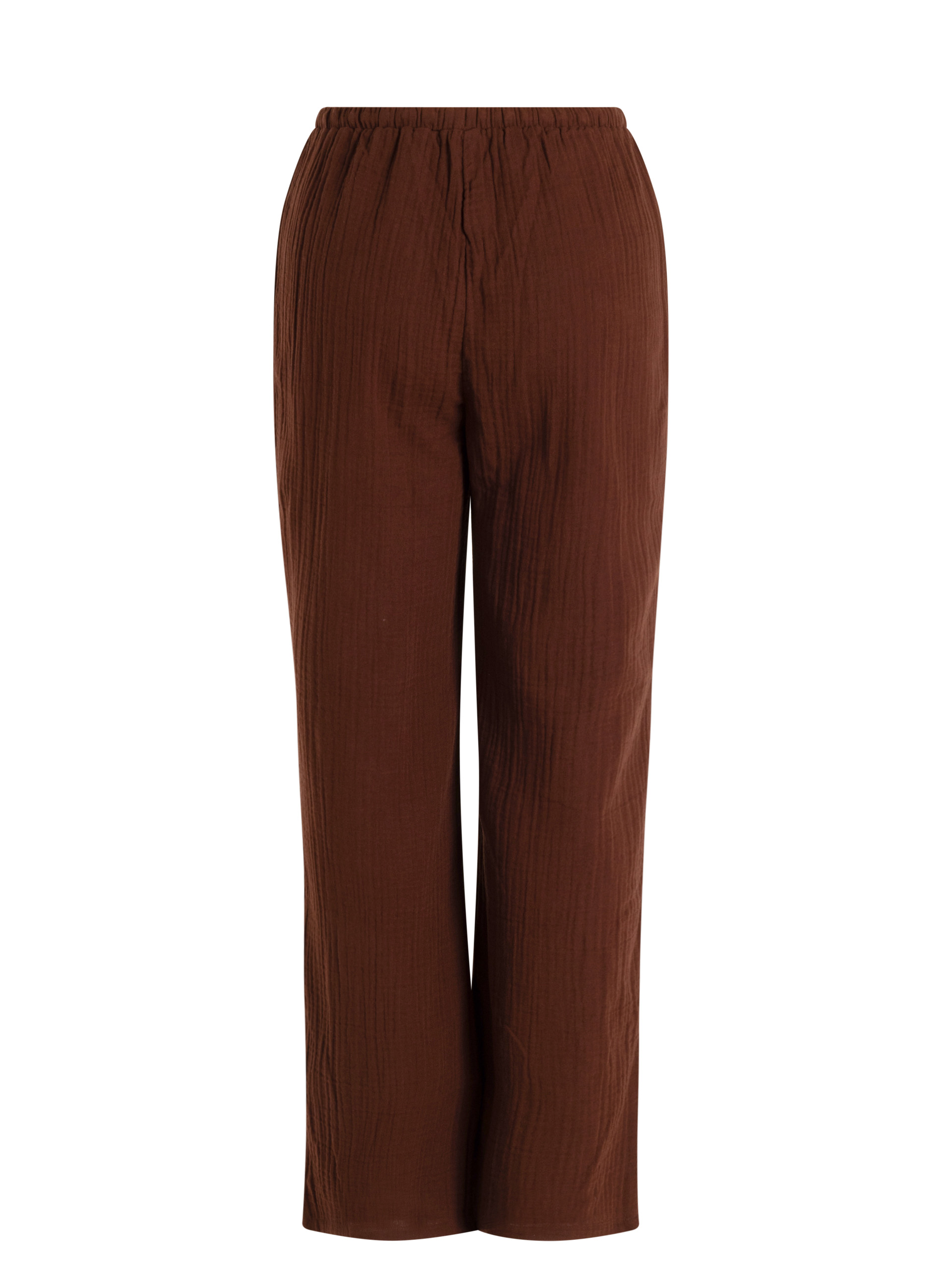 Deze broek is gemaakt van 100% katoen in een zachte mousseline kwaliteit die licht en ademend aanvoelt. De loose fit valt ruim langs het been en biedt veel bewegingsvrijheid. De elastische tailleband met drawstring zorgt voor een comfortabele pasvorm. Uitgevoerd in coffee brown.