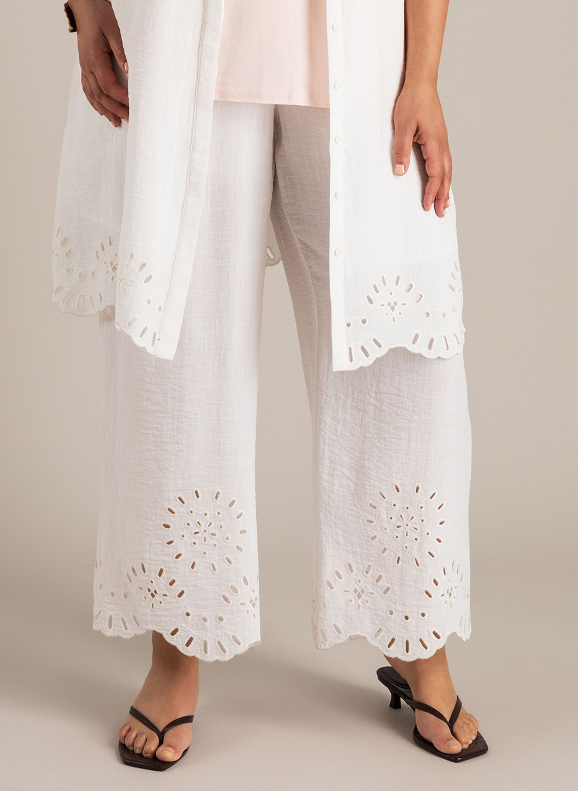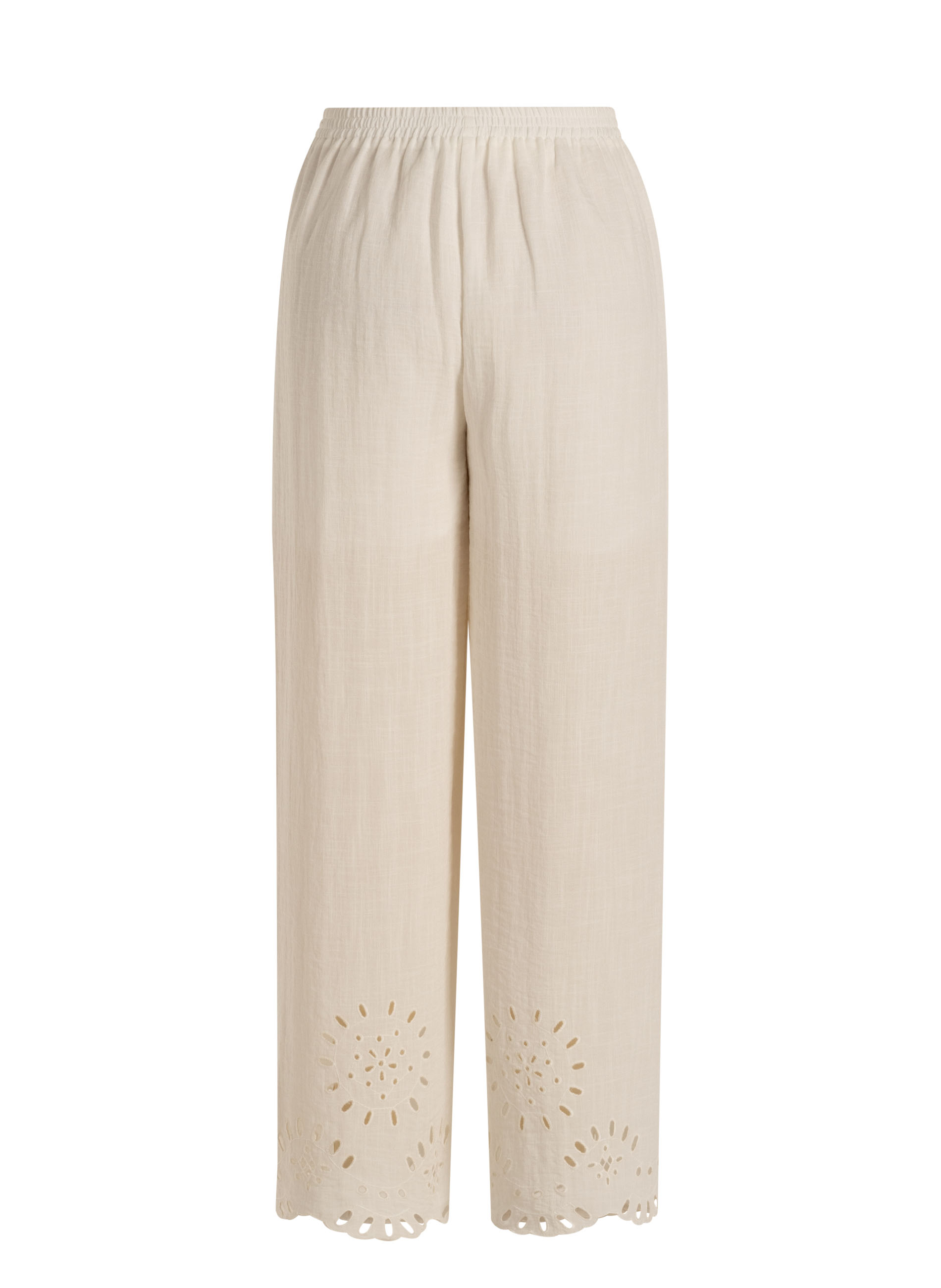 Deze broek is gemaakt van een lichte kwaliteit van 72% viscose en 28% nylon, wat zorgt voor een soepel en luchtig draaggevoel. De elastische tailleband biedt comfort. Voorzien van zakken en een korte voering tot en met de billen. De pijpen zijn afgewerkt met een lasercut detail.