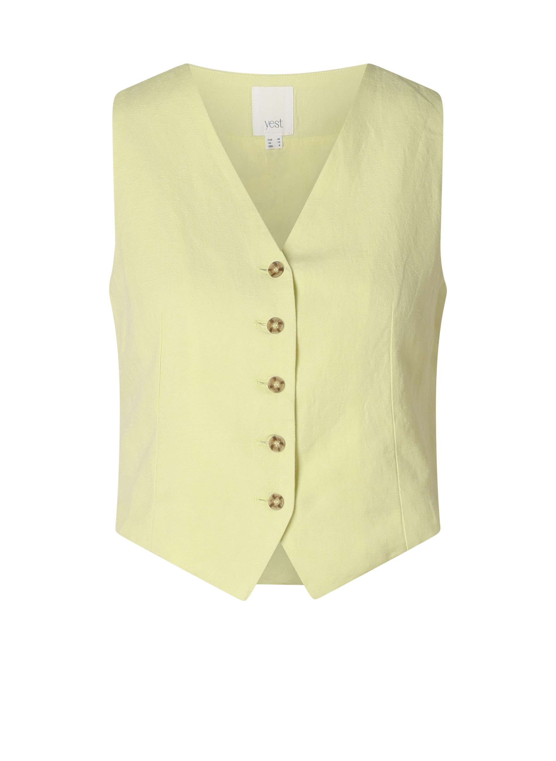 Een zomers gilet van Yest Curve in linnen-viscose kwaliteit. De Walae Essential heeft een V-hals, knoopsluiting en een verstelbaar strikje aan de achterkant. Draag het gilet los of in combinatie met de bijpassende pantalon. Verkrijgbaar in twee kleuren: pastel yellow en baked clay.