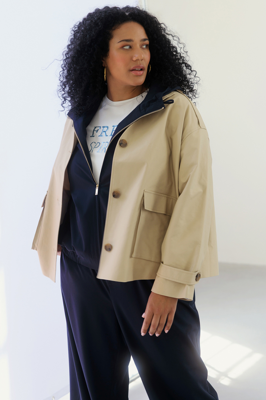 Deze elegante jas Cydnie van Yest Curve in een zachte beige tint is een stijlvolle aanvulling op elke garderobe. Het kortere model valt net op de heup en geeft een vrouwelijke silhouet zonder in te leveren op comfort. De jas heeft een nette, opstaande kraag en een knoopsluiting die subtiel de aandacht trekt. De lange mouwen zijn recht gesneden en eindigen in een nette zoom, terwijl de voorkant is afgewerkt met elegante, weggewerkte zakken die praktisch én stijlvol zijn. Het materiaal voelt zacht en soepel aan, waardoor de jas comfortabel draagt tijdens frisse lentedagen of koelere zomeravonden. De lengte van de jas is 68 cm. Een veelzijdig item dat zowel casual als chic gedragen kan worden en eenvoudig te combineren is met zowel jeans als een jurk. Voor meer jassen, kijk bij onze collectie grote maten jassen.