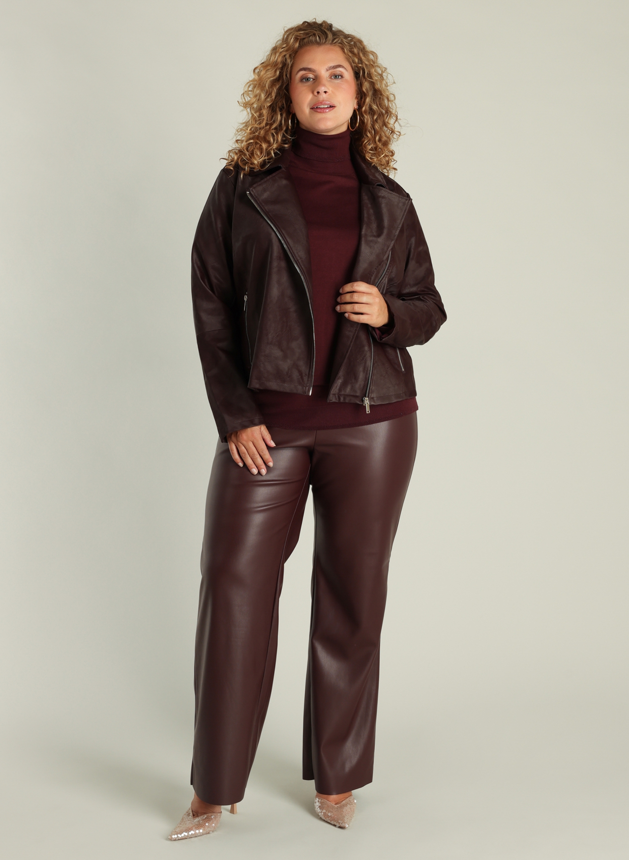 De korte pasvorm en diagonale ritssluiting geven het jack zijn karakteristieke motorbike-look, terwijl de glanzende metalen details zorgen voor een verfijnd accent. Perfect als buitenlaag in het tussenseizoen en makkelijk te combineren met zowel casual als geklede outfits.